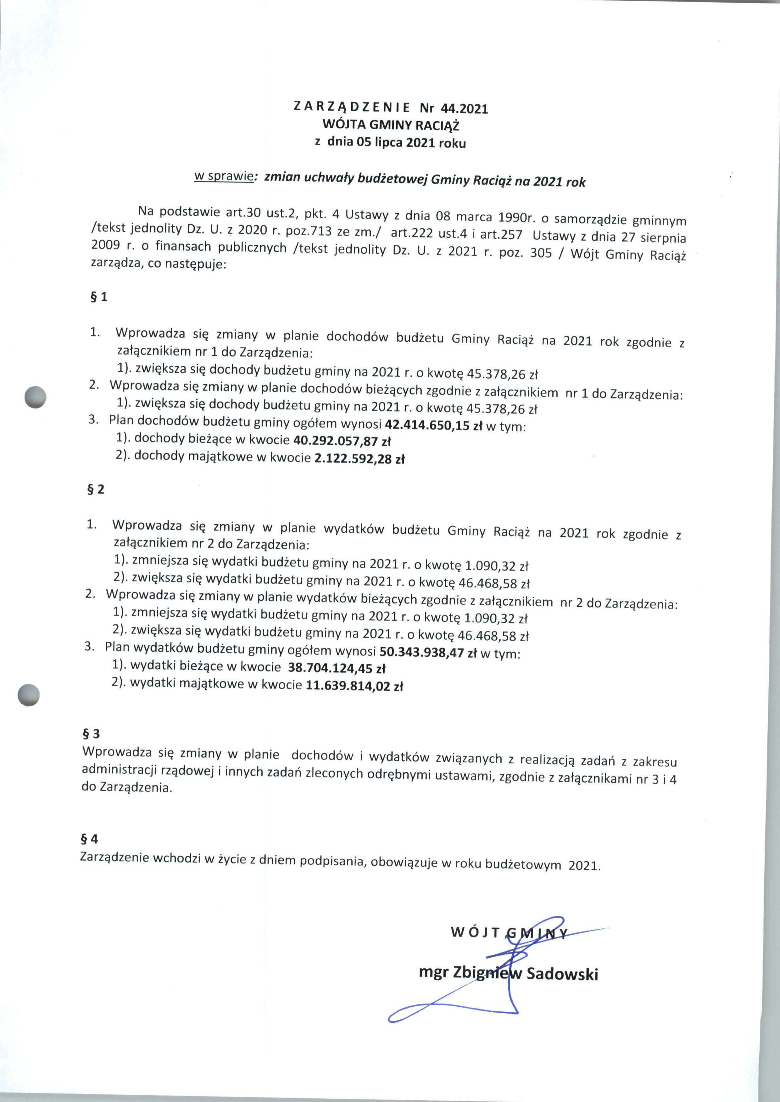 Zarządzenie Nr 44.2021 Wójta Gminy Raciąż z dnia 5 lipca 2021 roku