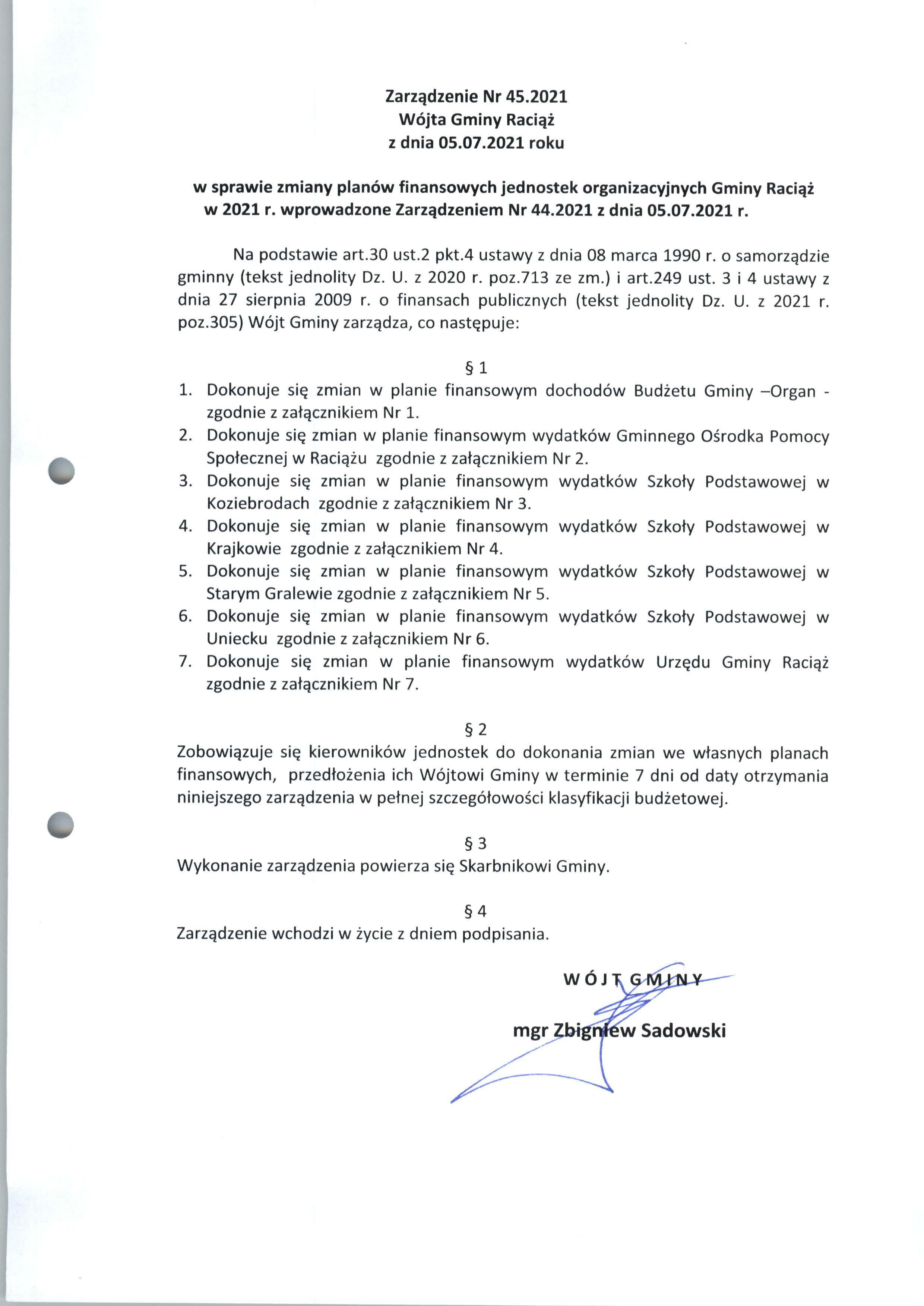 Zarządzenie Nr 45.2021 Wójta Gminy Raciąż z dnia 5 lipca 2021 roku