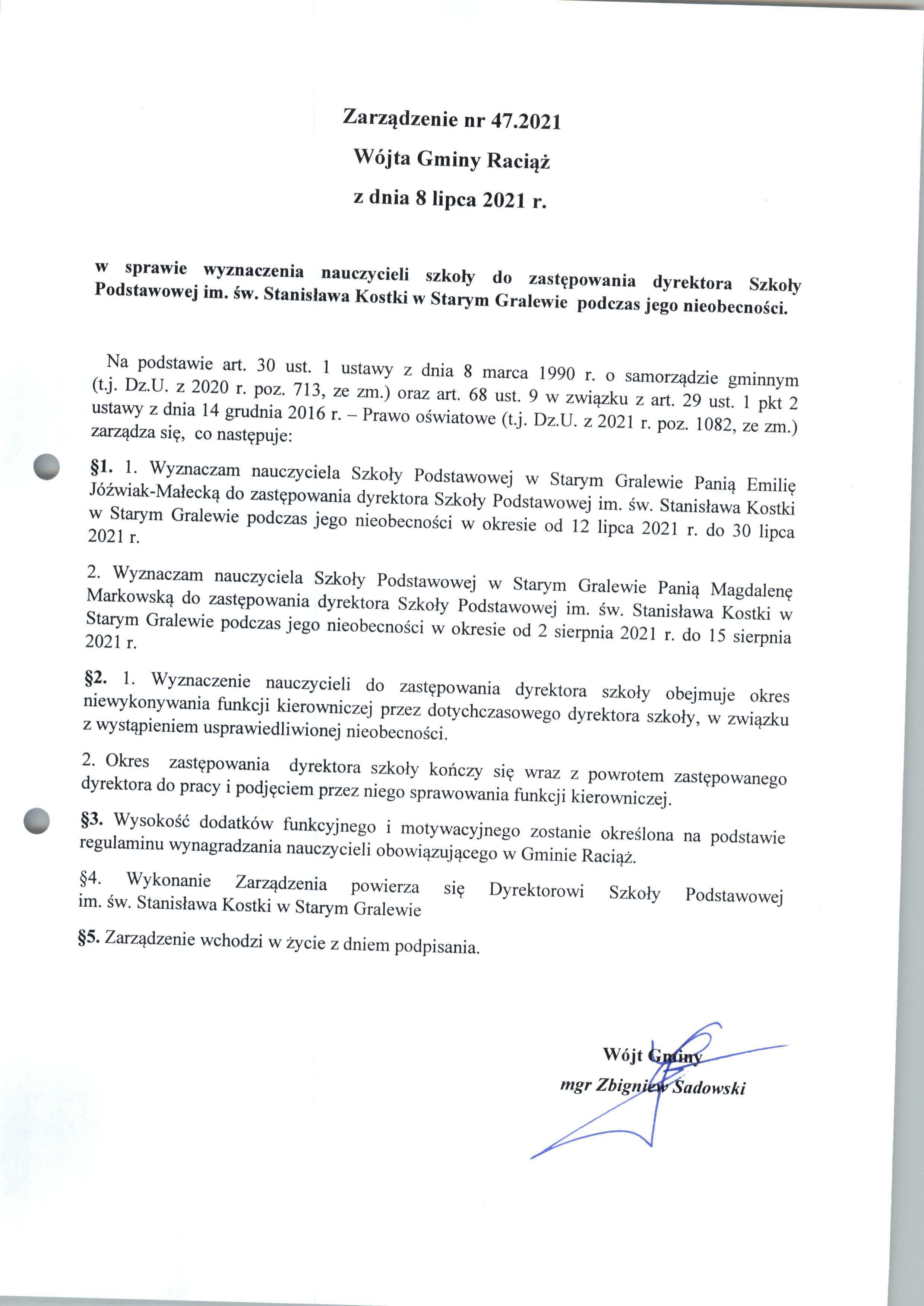 Zarządzenie Nr 47.2021 Wójta Gminy Raciąż z dnia 8 lipca 2021 roku