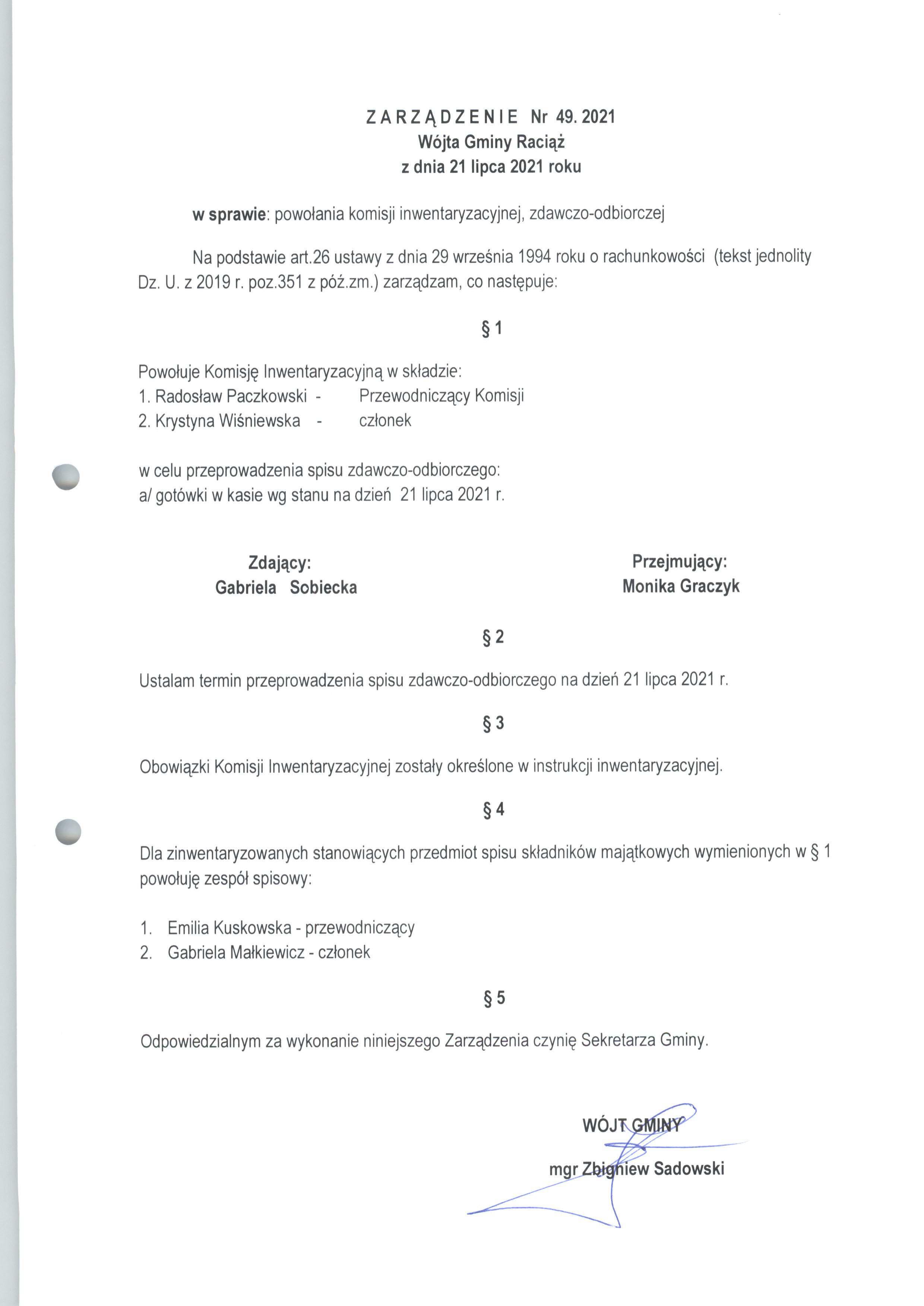 Zarządzenie Nr 49.2021 Wójta Gminy Raciąż z dnia 21 lipca 2021 roku