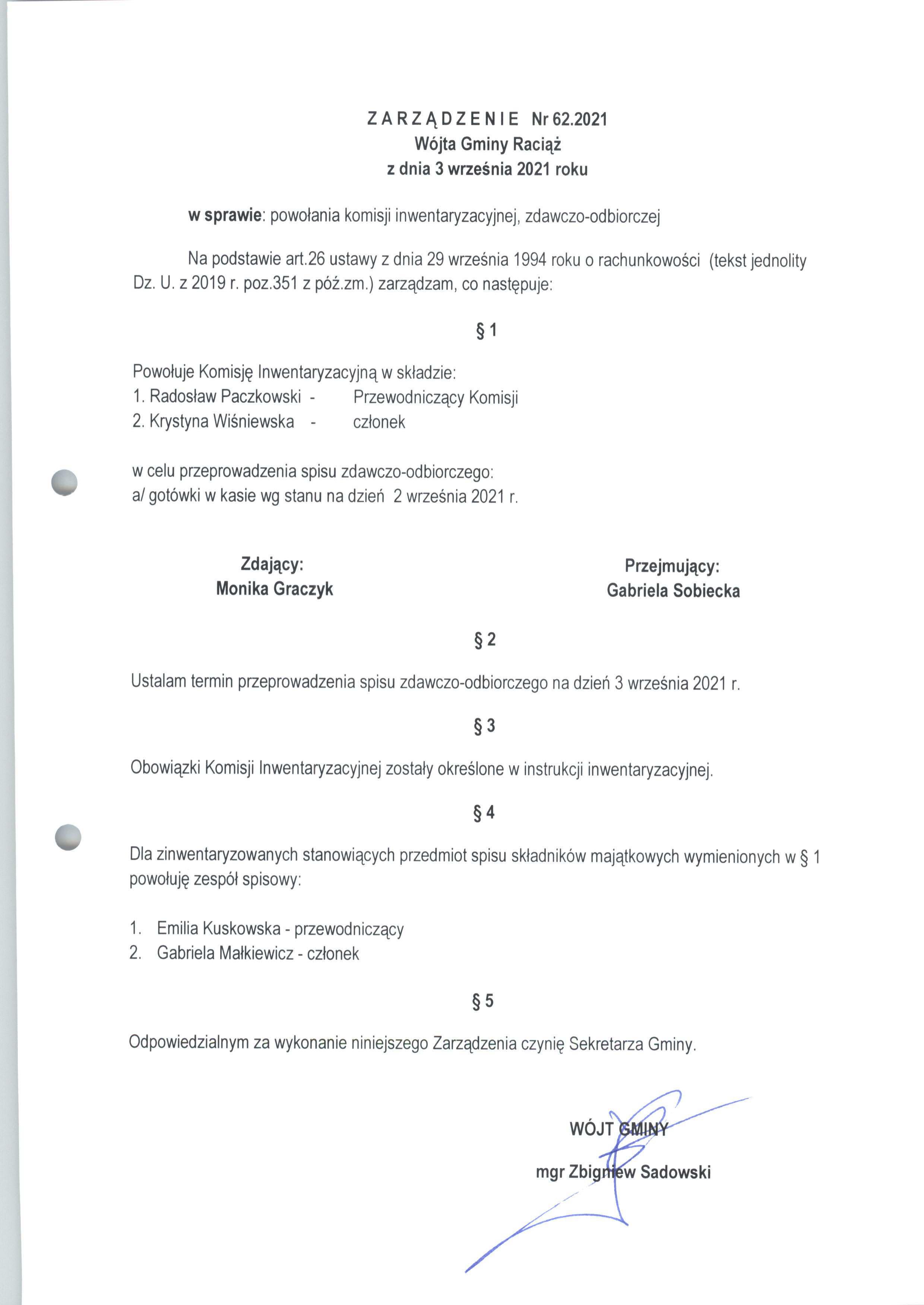 Zarządzenie Nr 62.2021 Wójta Gminy Raciąż z dnia 3 września 2021 roku