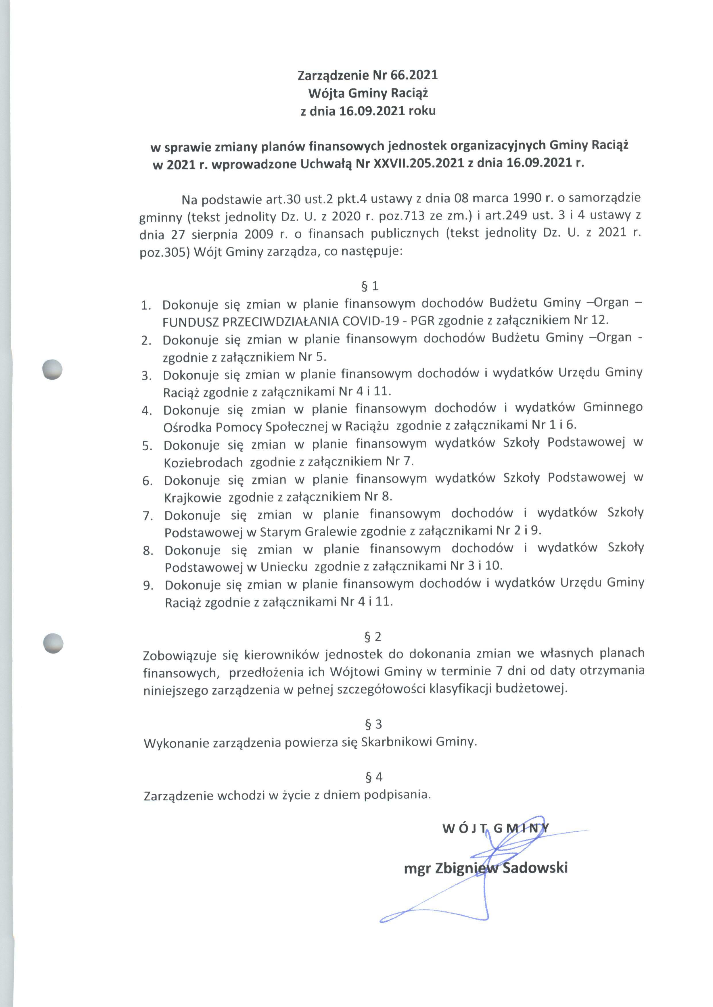 Zarządzenie Nr 66.2021 Wójta Gminy Raciąż z dnia 16 września 2021 roku