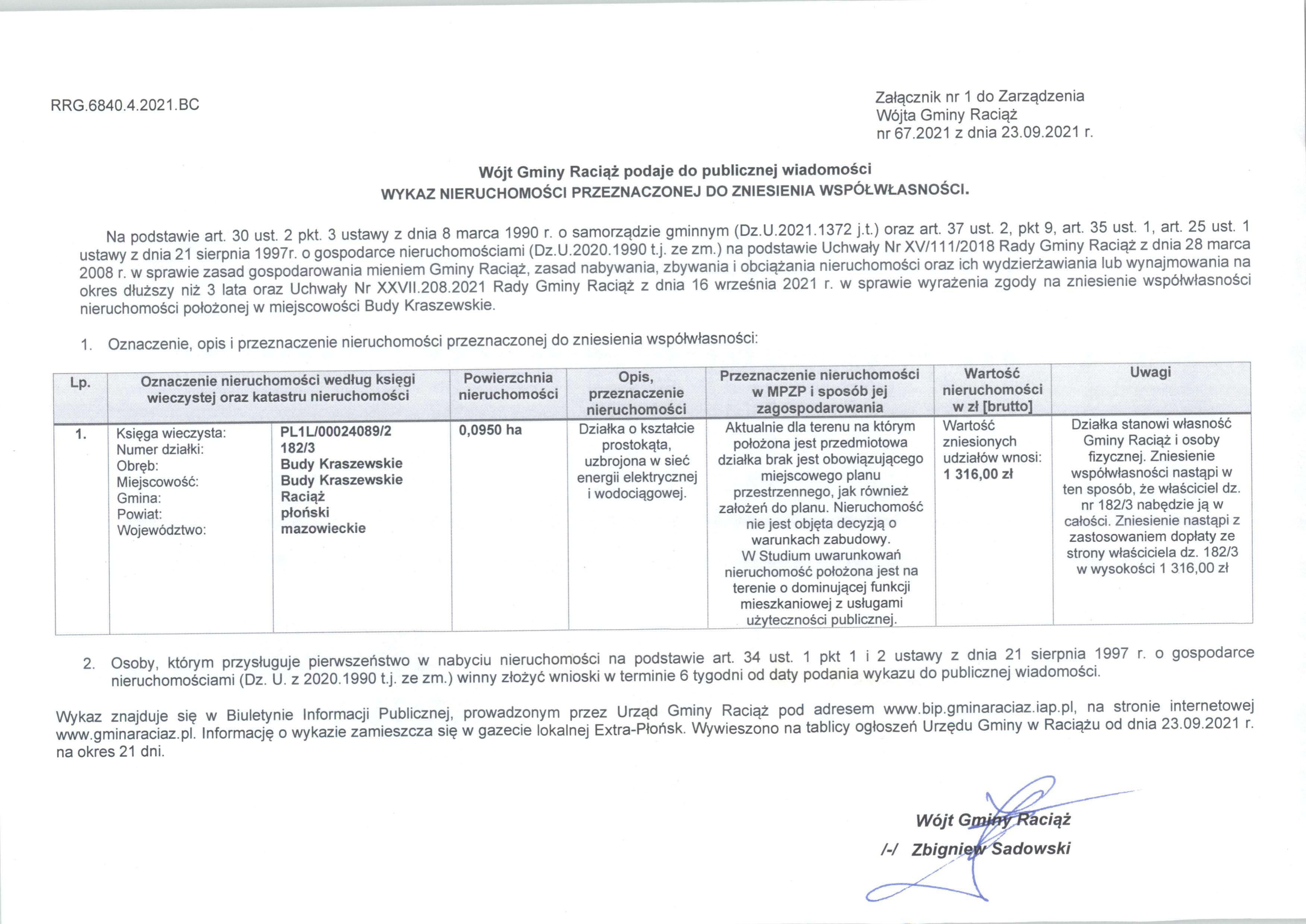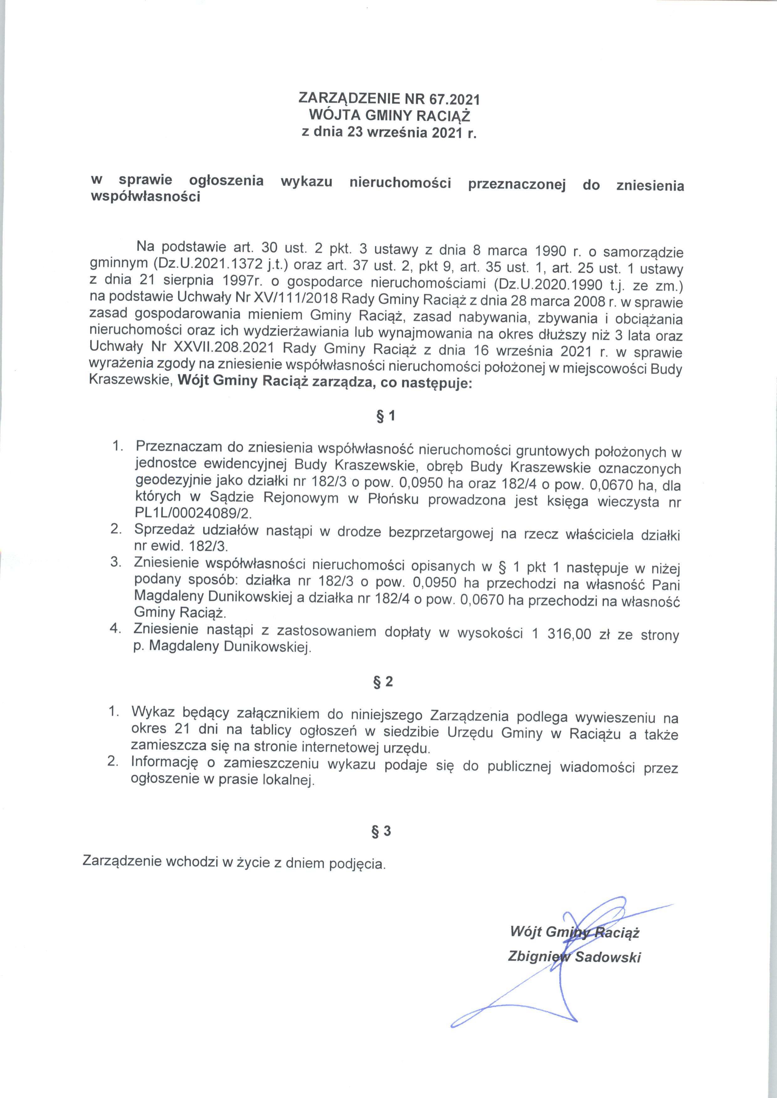 Zarządzenie Nr 67.2021 Wójta Gminy Raciąż z dnia 23 września 2021 roku