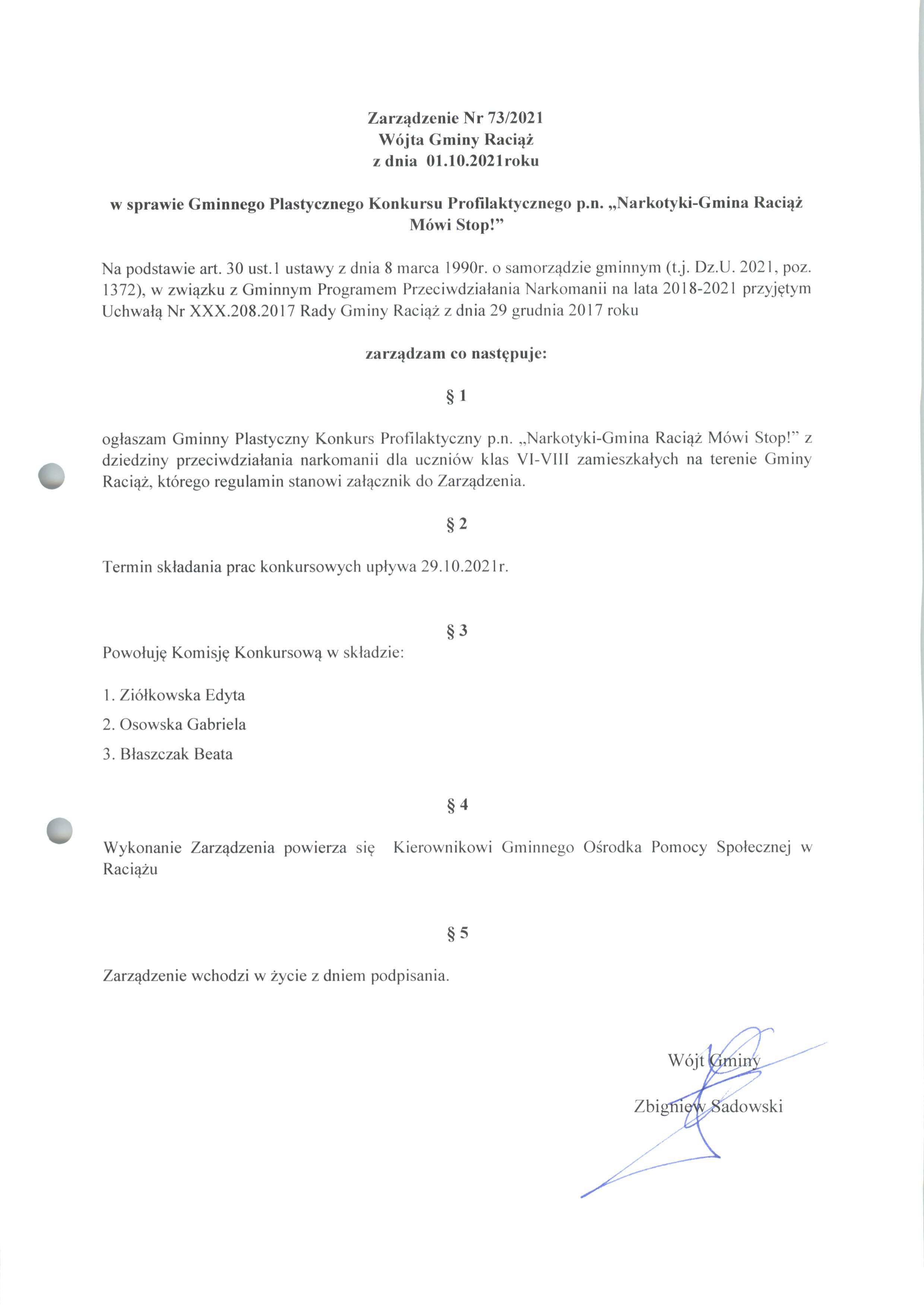 Zarządzenie Nr 73.2021 Wójta Gminy Raciąż z dnia 1 października 2021 roku