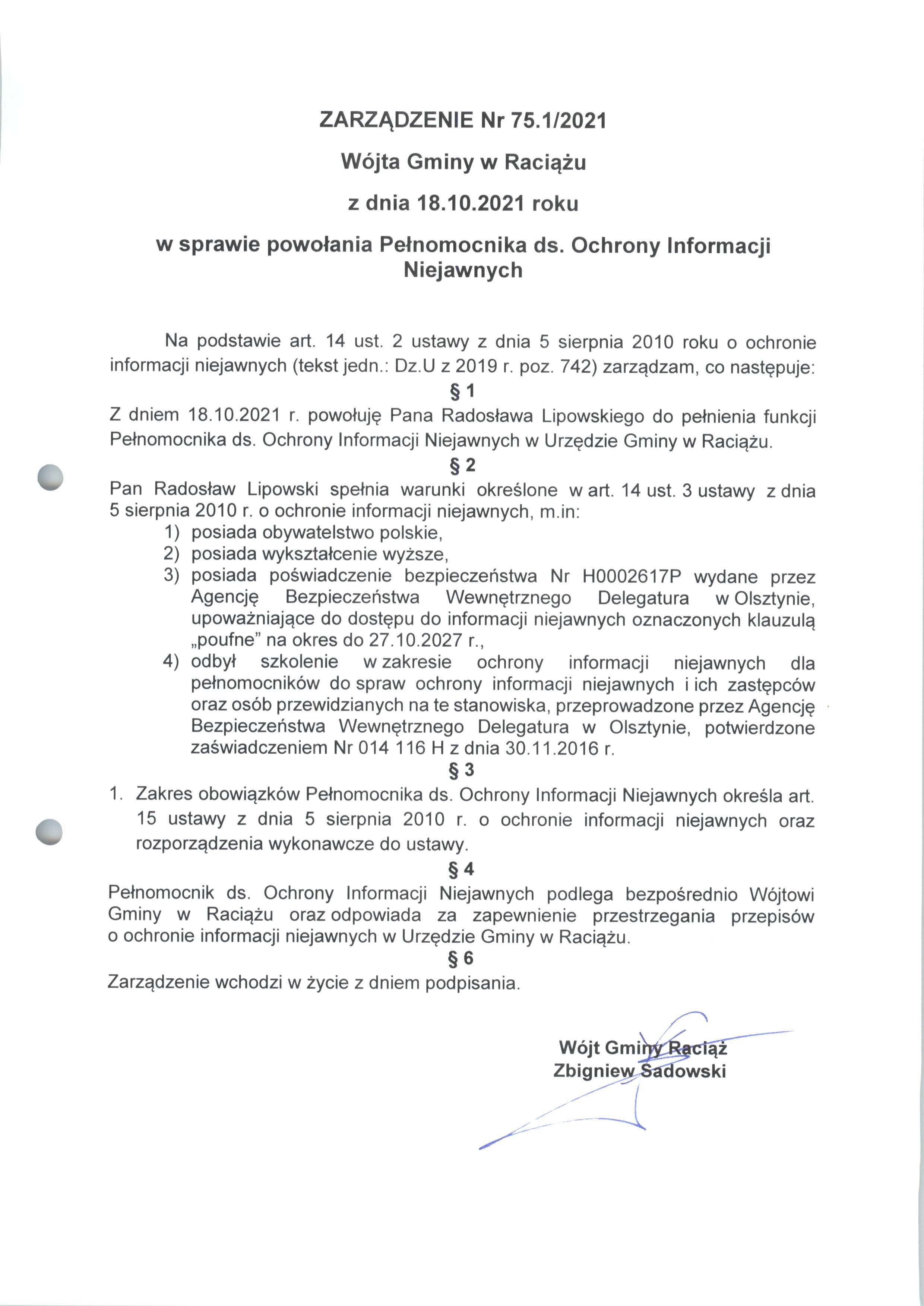 Zarządzenie Nr 75.1.2021 Wójta Gminy Raciąż z dnia 18 października 2021 roku