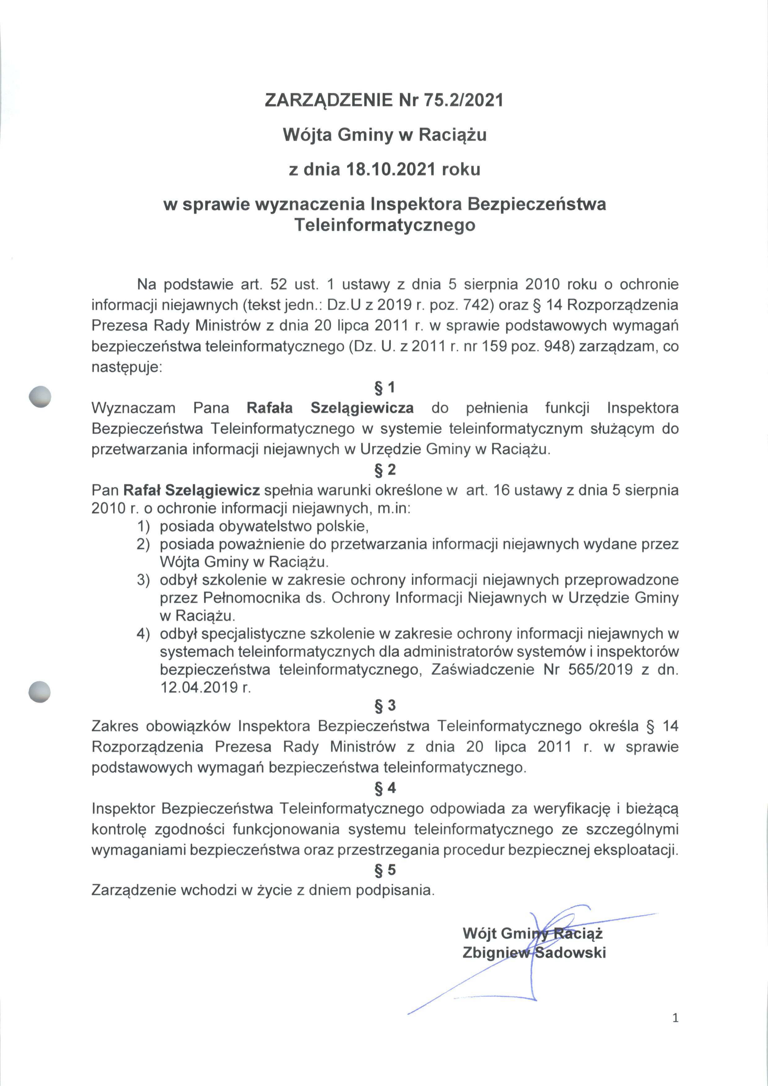 Zarządzenie Nr 75.2.2021 Wójta Gminy Raciąż z dnia 18 października 2021 roku