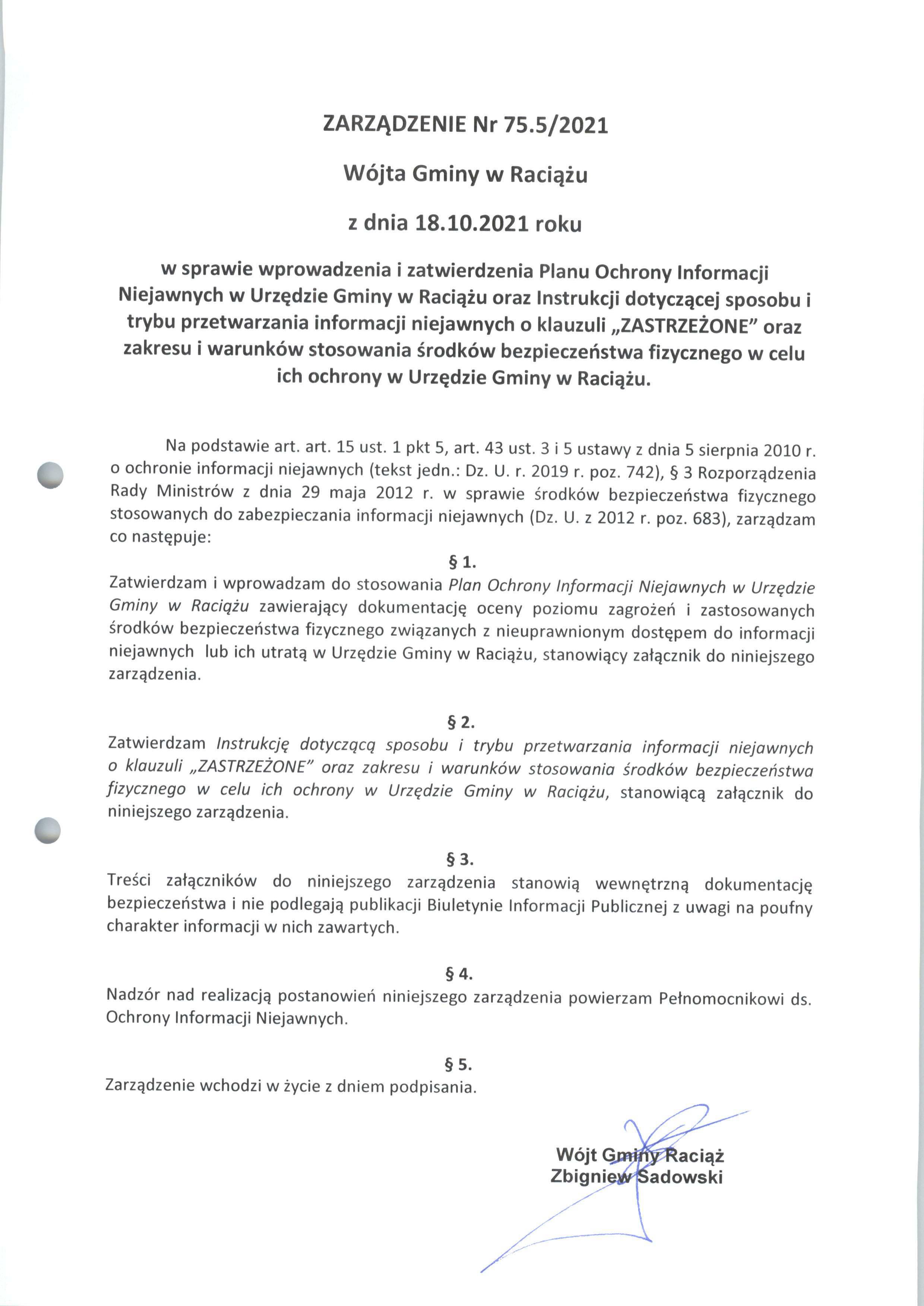 Zarządzenie Nr 75.5.2021 Wójta Gminy Raciąż z dnia 18 października 2021 roku
