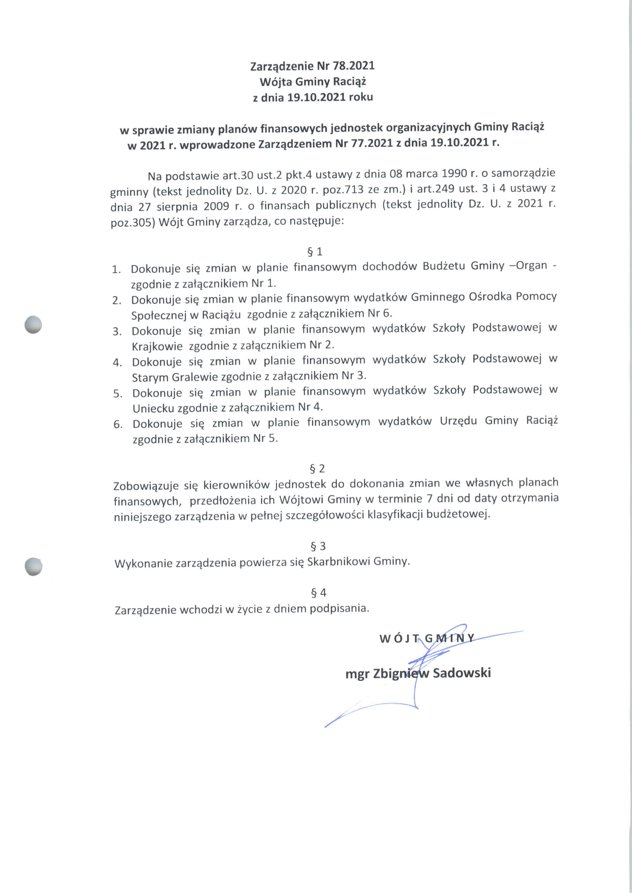 Zarządzenie Nr 78.2021 Wójta Gminy Raciąż z dnia 19 października 2021 roku