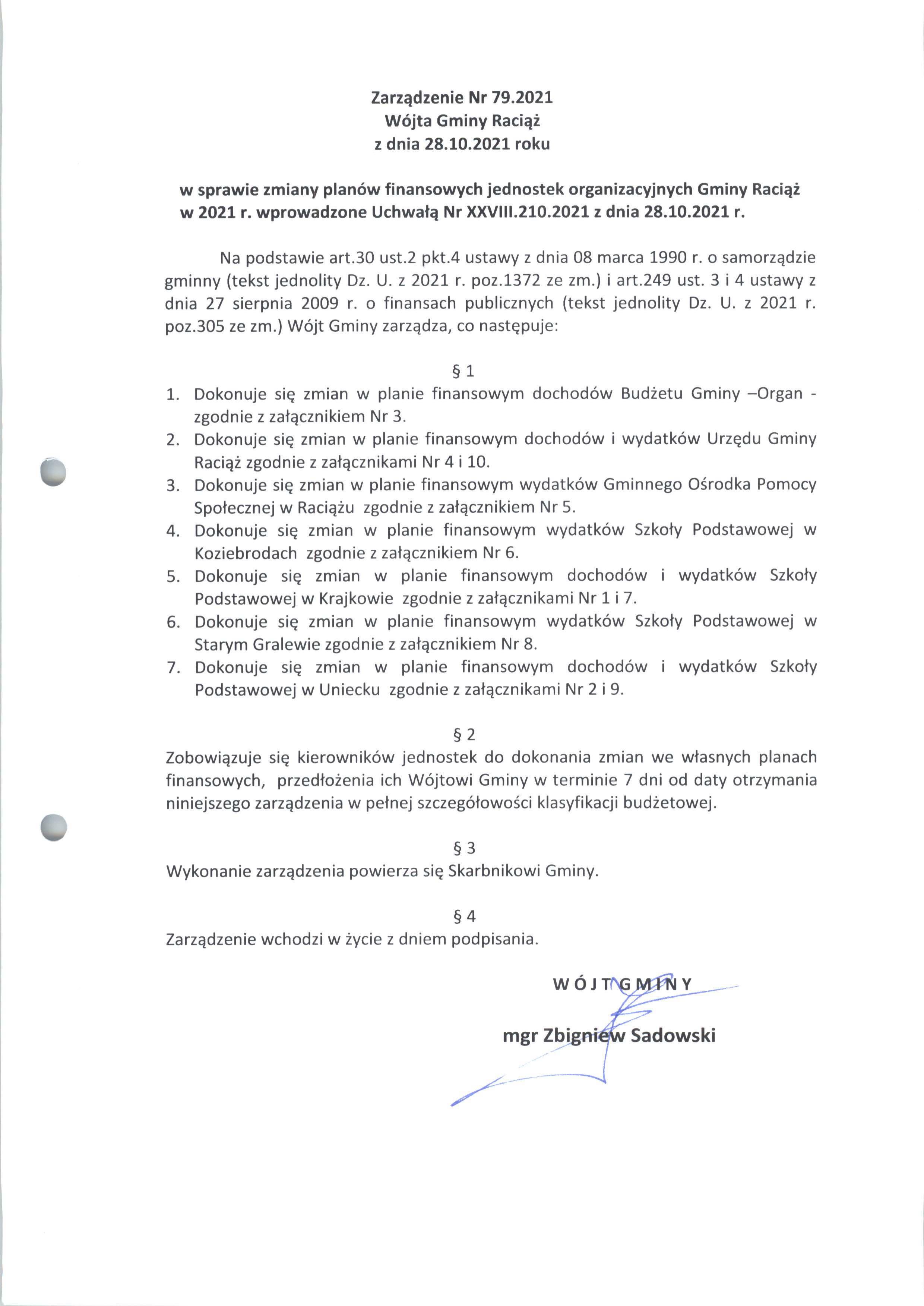 Zarządzenie Nr 79.2021 Wójta Gminy Raciąż z dnia 19 października 2021 roku