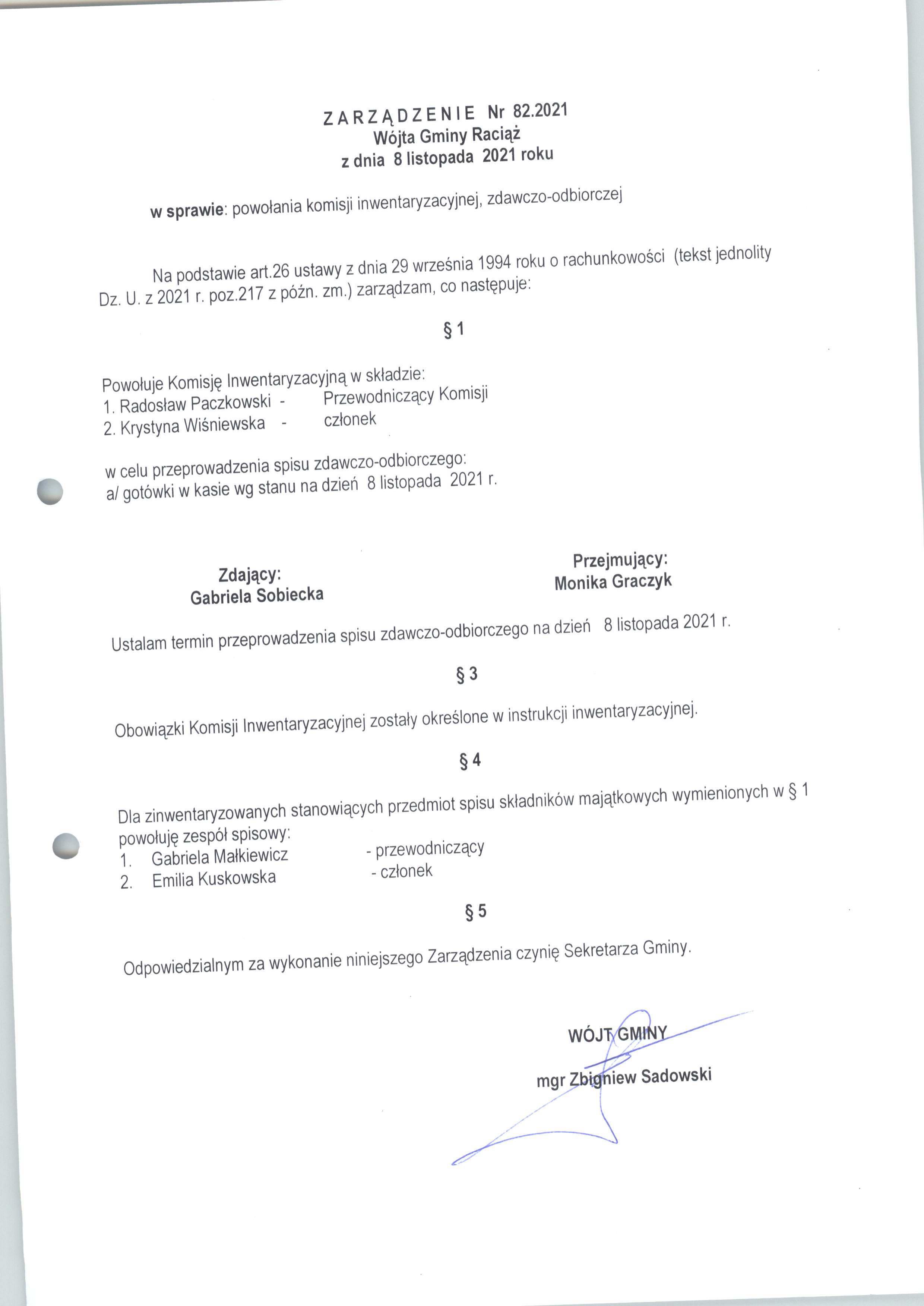 Zarządzenie Nr 82.2021 Wójta Gminy Raciąż z dnia 8 listopada 2021 roku