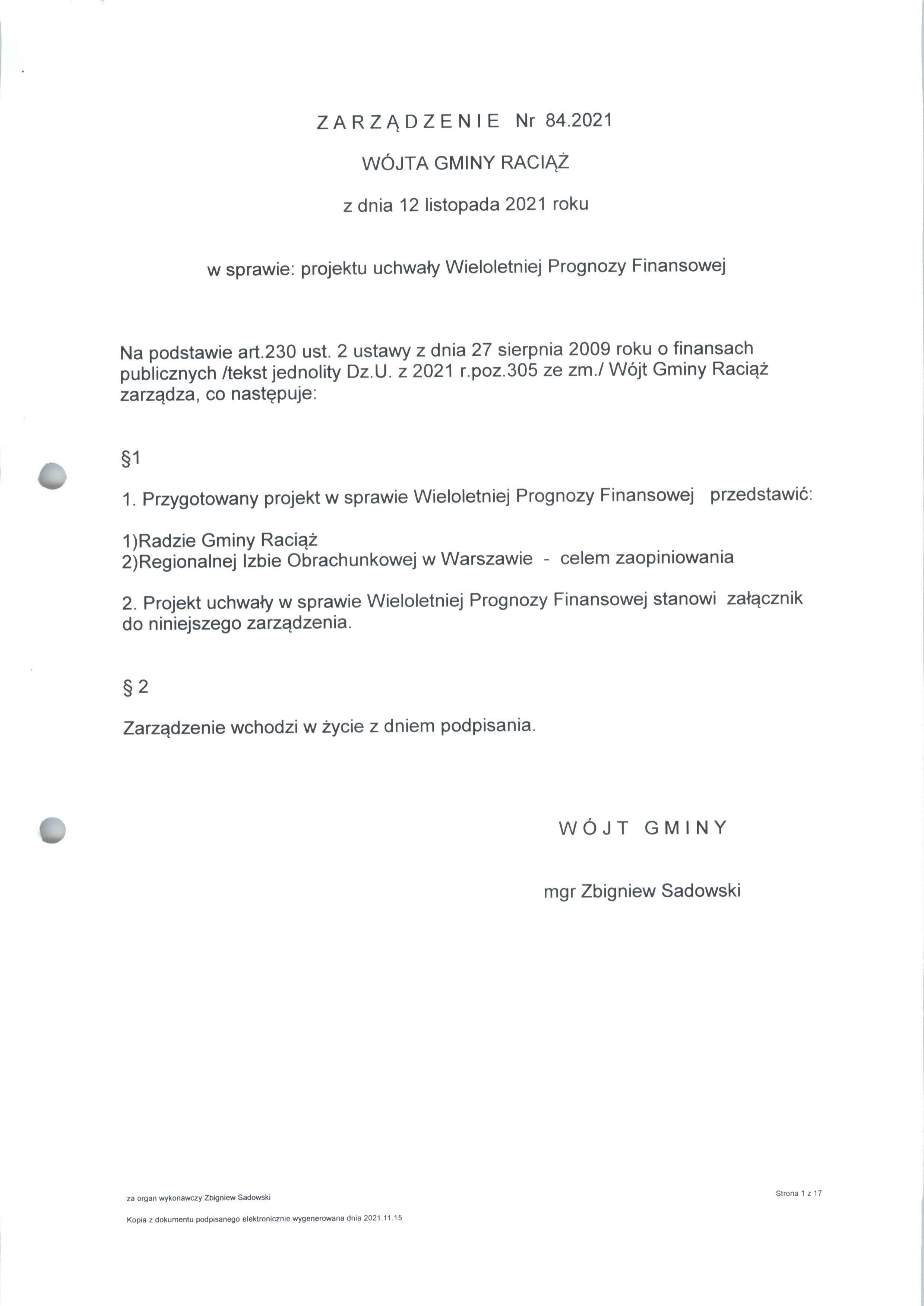 Zarządzenie Nr 84.2021 Wójta Gminy Raciąż z dnia 12 listopada 2021 roku