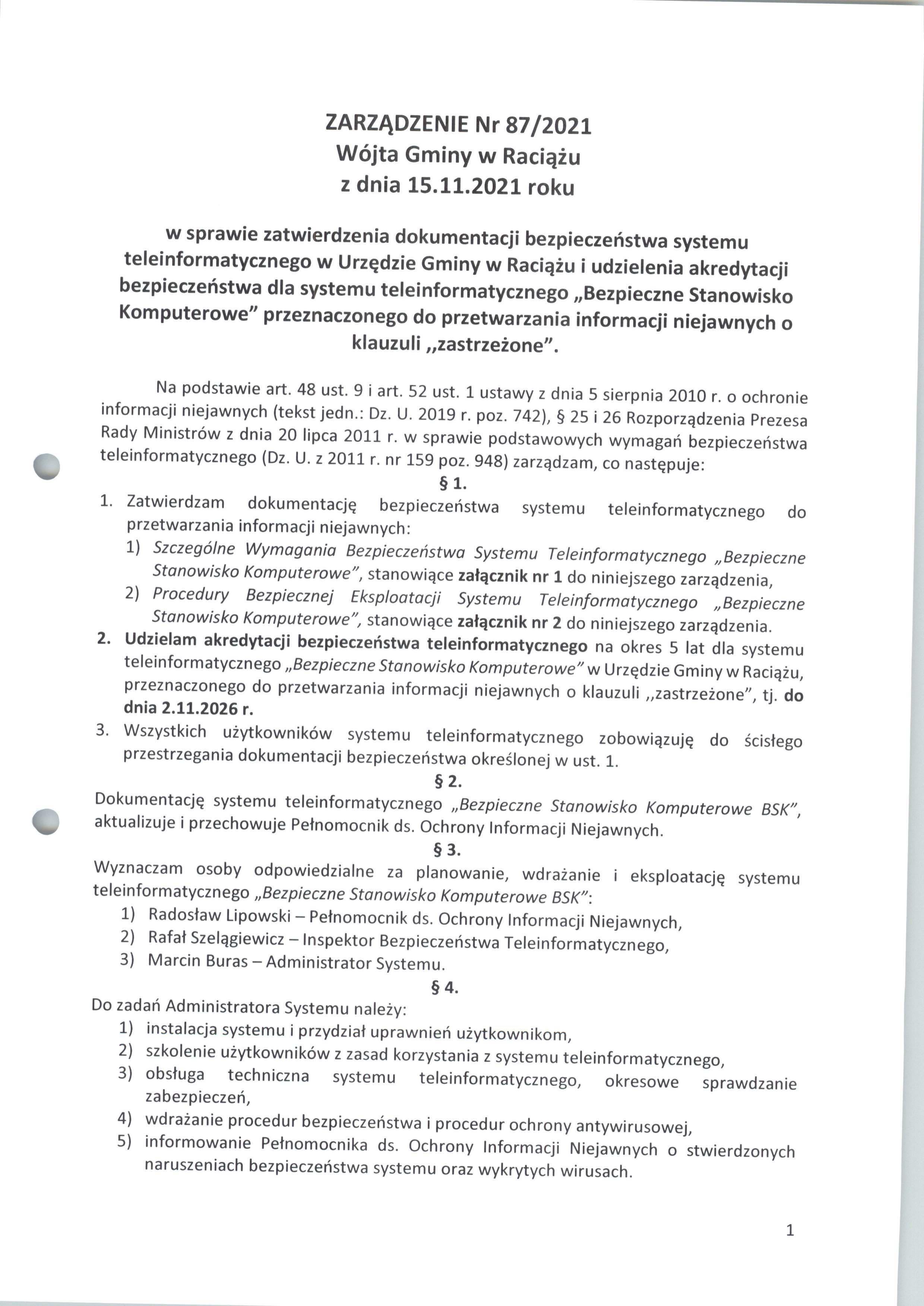 Zarządzenie Nr 87.2021 Wójta Gminy Raciąż z dnia 15 listopada 2021 roku