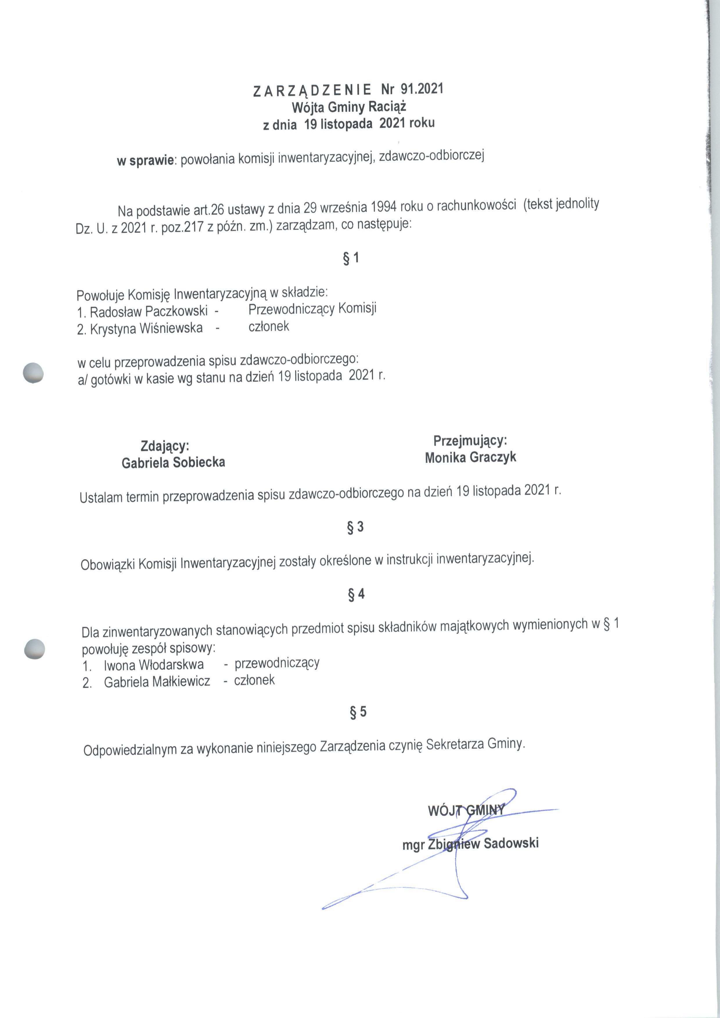 Zarządzenie Nr 91.2021 Wójta Gminy Raciąż z dnia 19 listopada 2021 roku