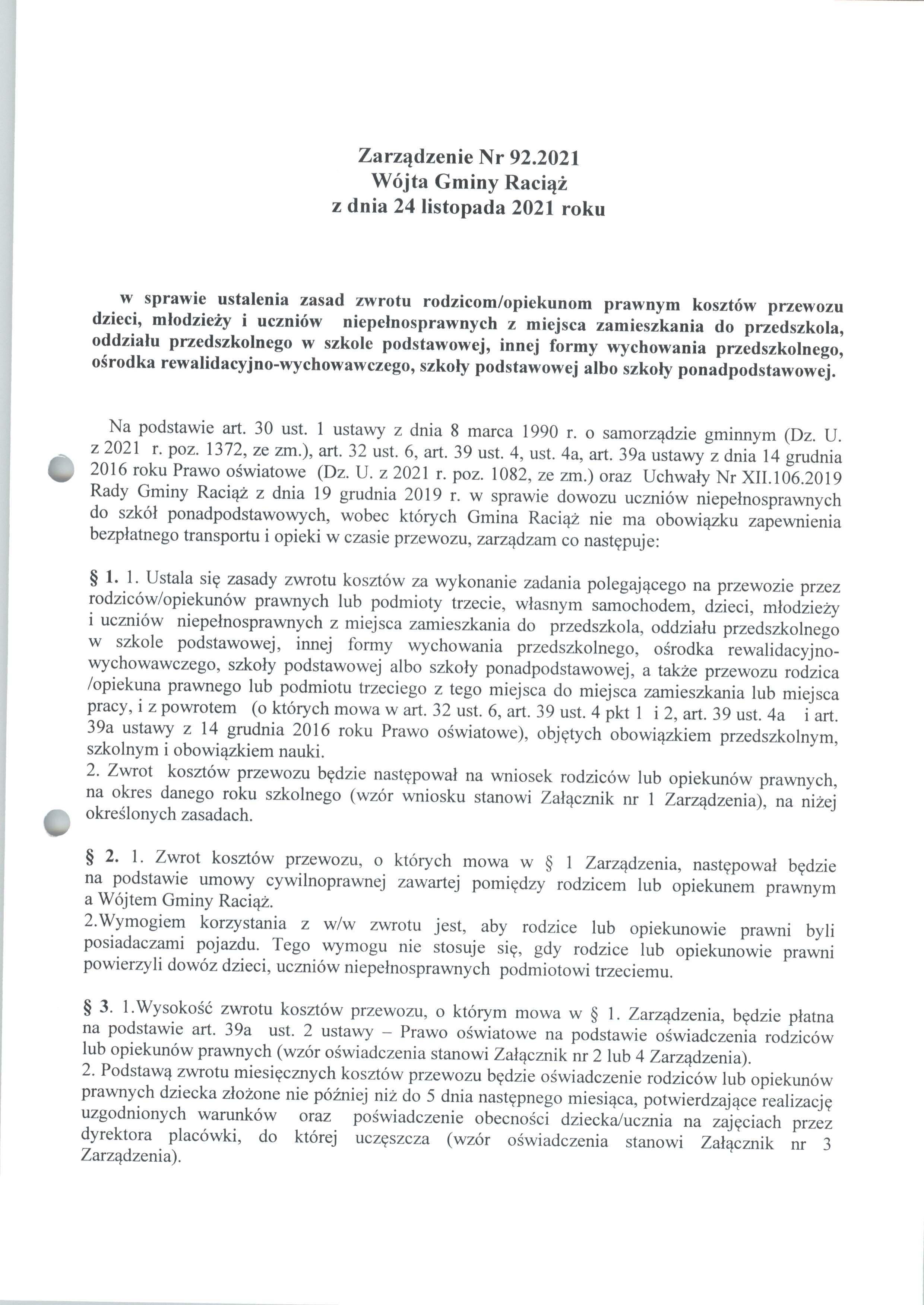 Zarządzenie Nr 92.2021 Wójta Gminy Raciąż z dnia 24 listopada 2021 roku