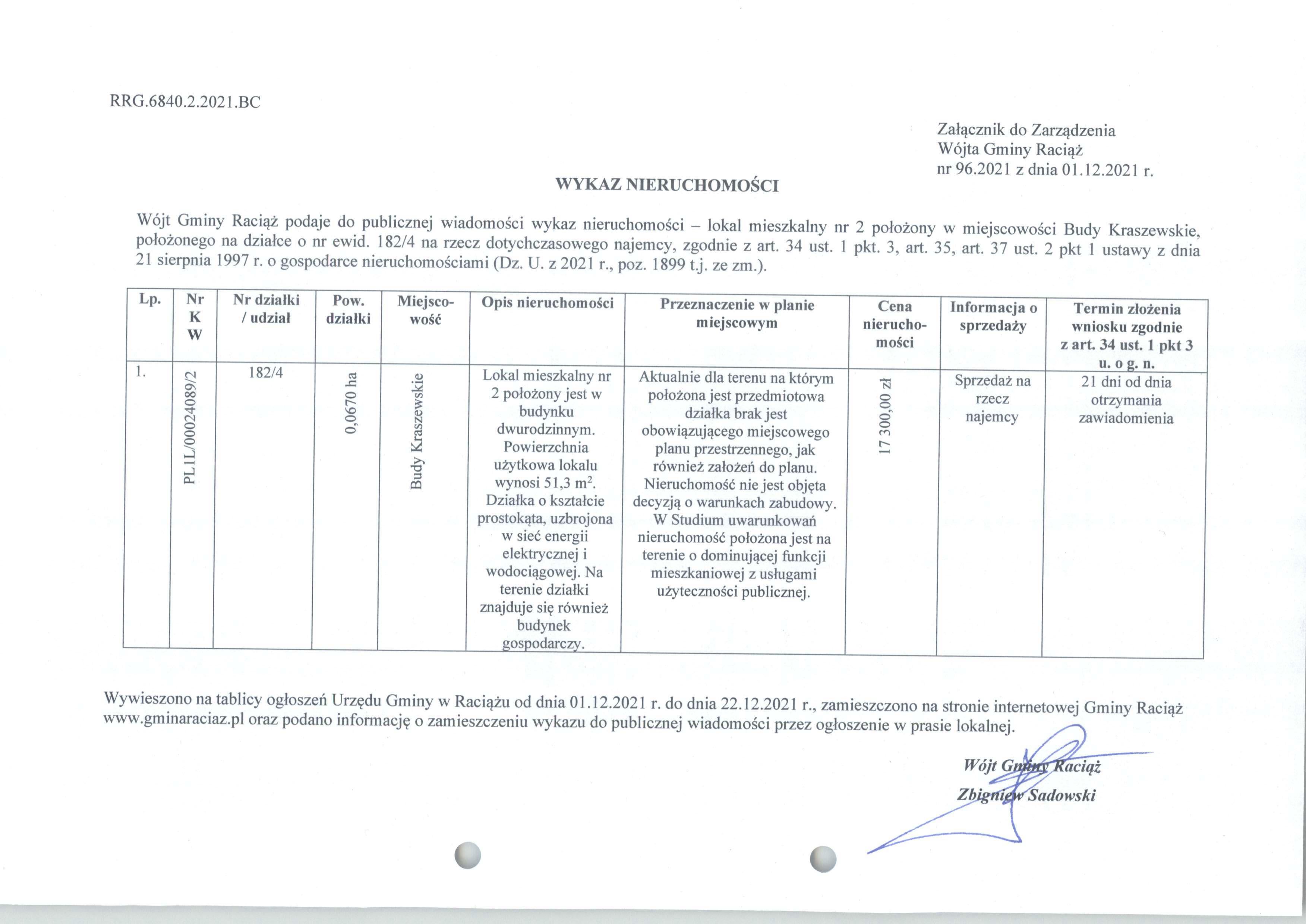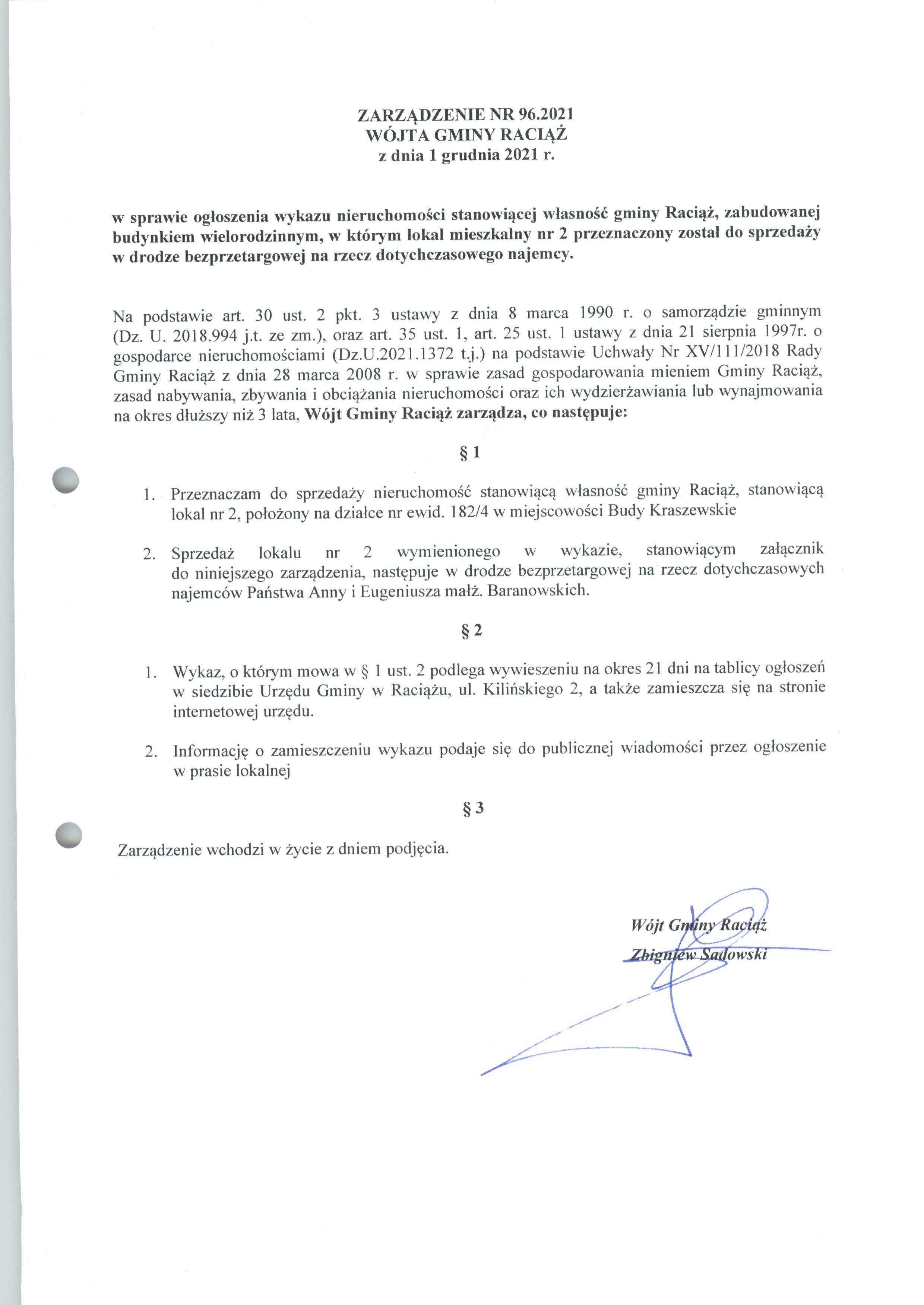 Zarządzenie Nr 96.2021 Wójta Gminy Raciąż z dnia 1 grudnia 2021 roku