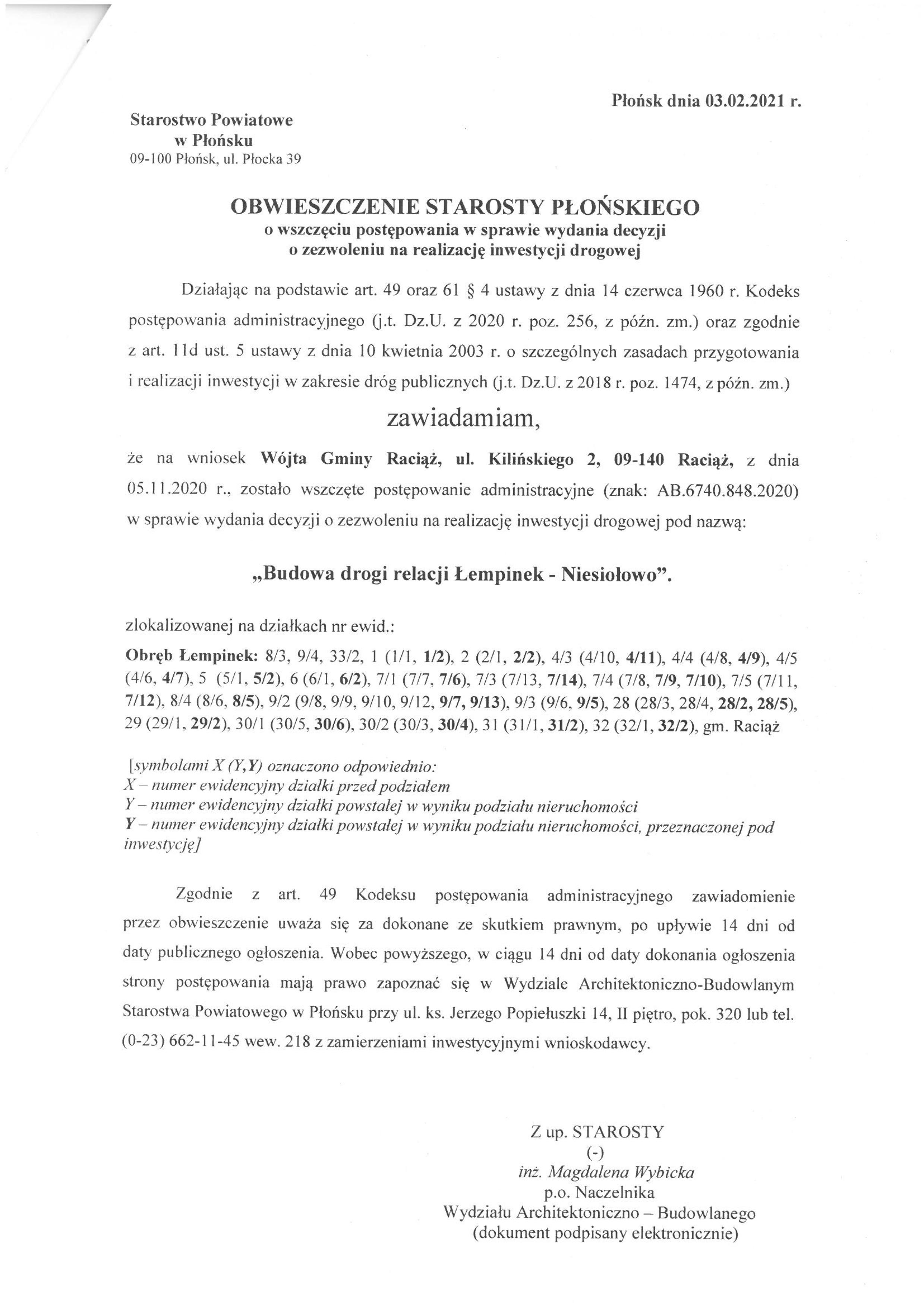 Obwieszczenie Starosty Powiatu Płońskiego o wszczęciu postępowania w sprawie wydania decyzji o zezwoleniu na realizację inwestycji drogowej pn. "Budowa drogi relacji Łempinek - Niesiołowo"