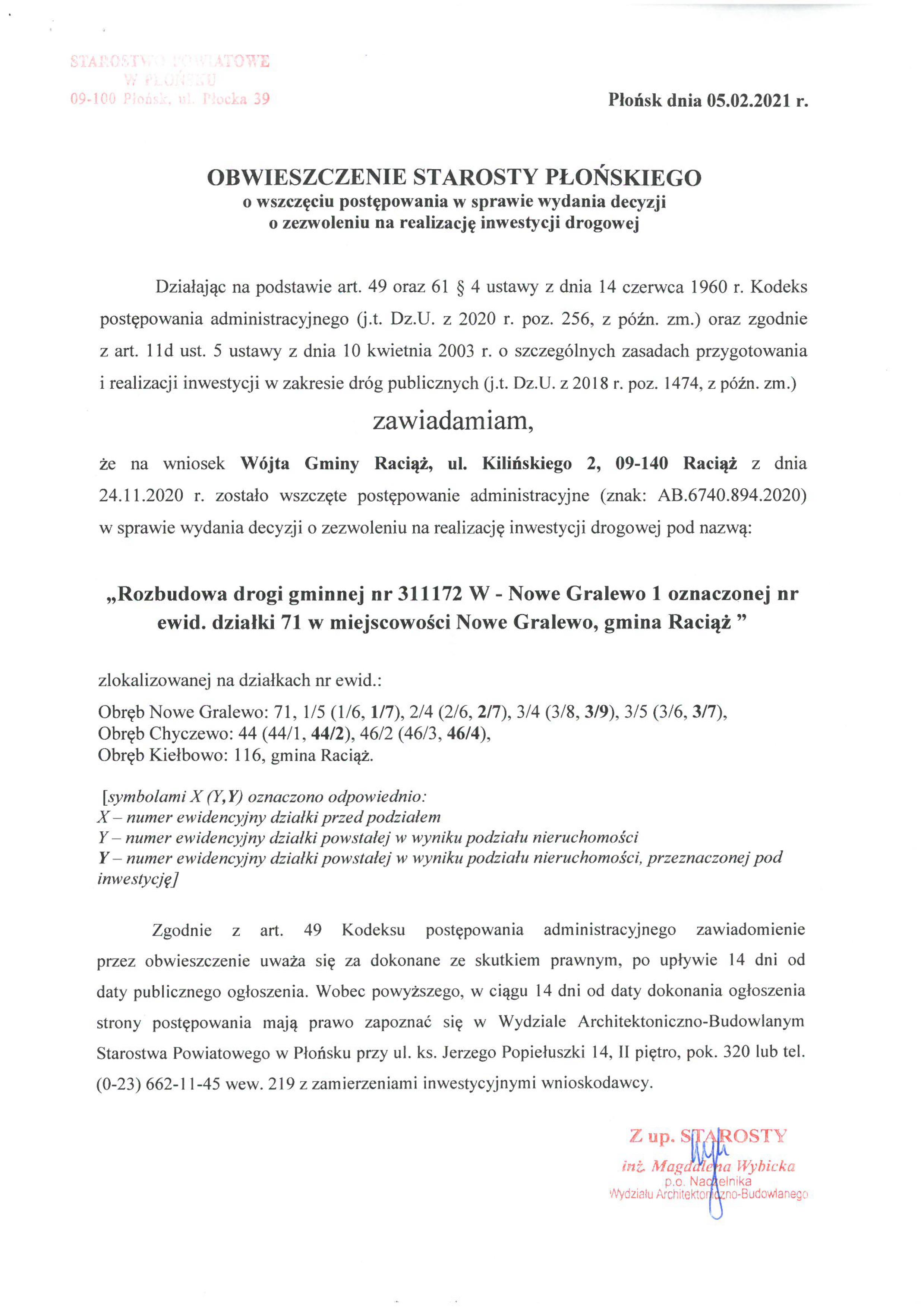 Obwieszczenie Starosty Powiatu Płońskiego o wszczęciu postępowania w sprawie wydania decyzji o zezwoleniu na realizację inwestycji drogowej pn.