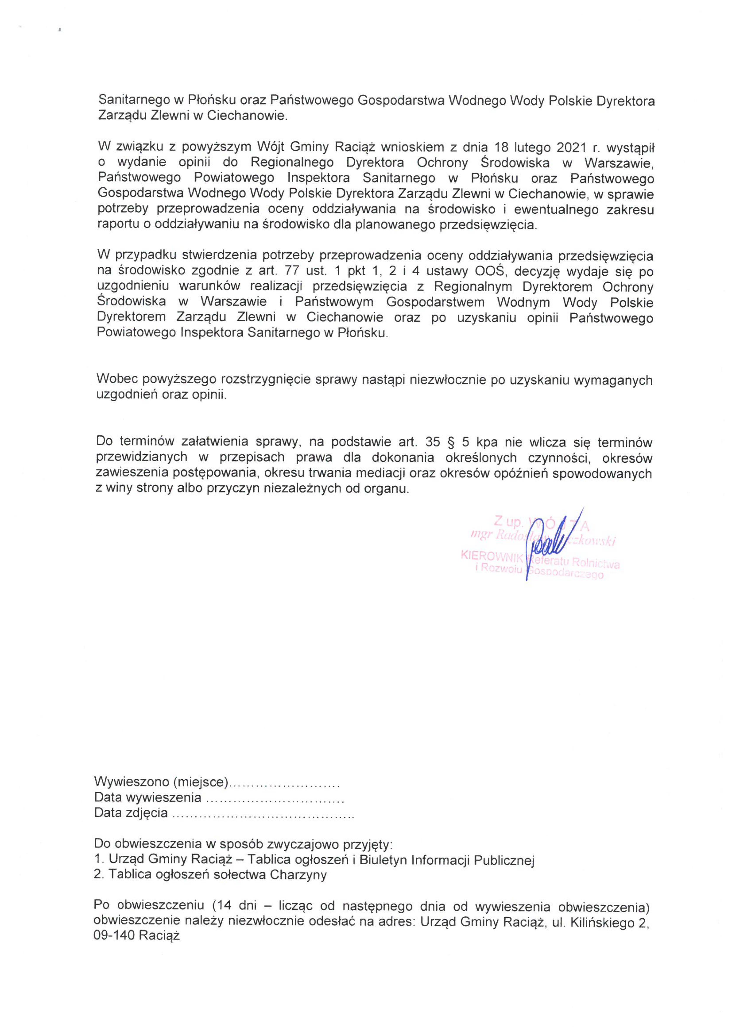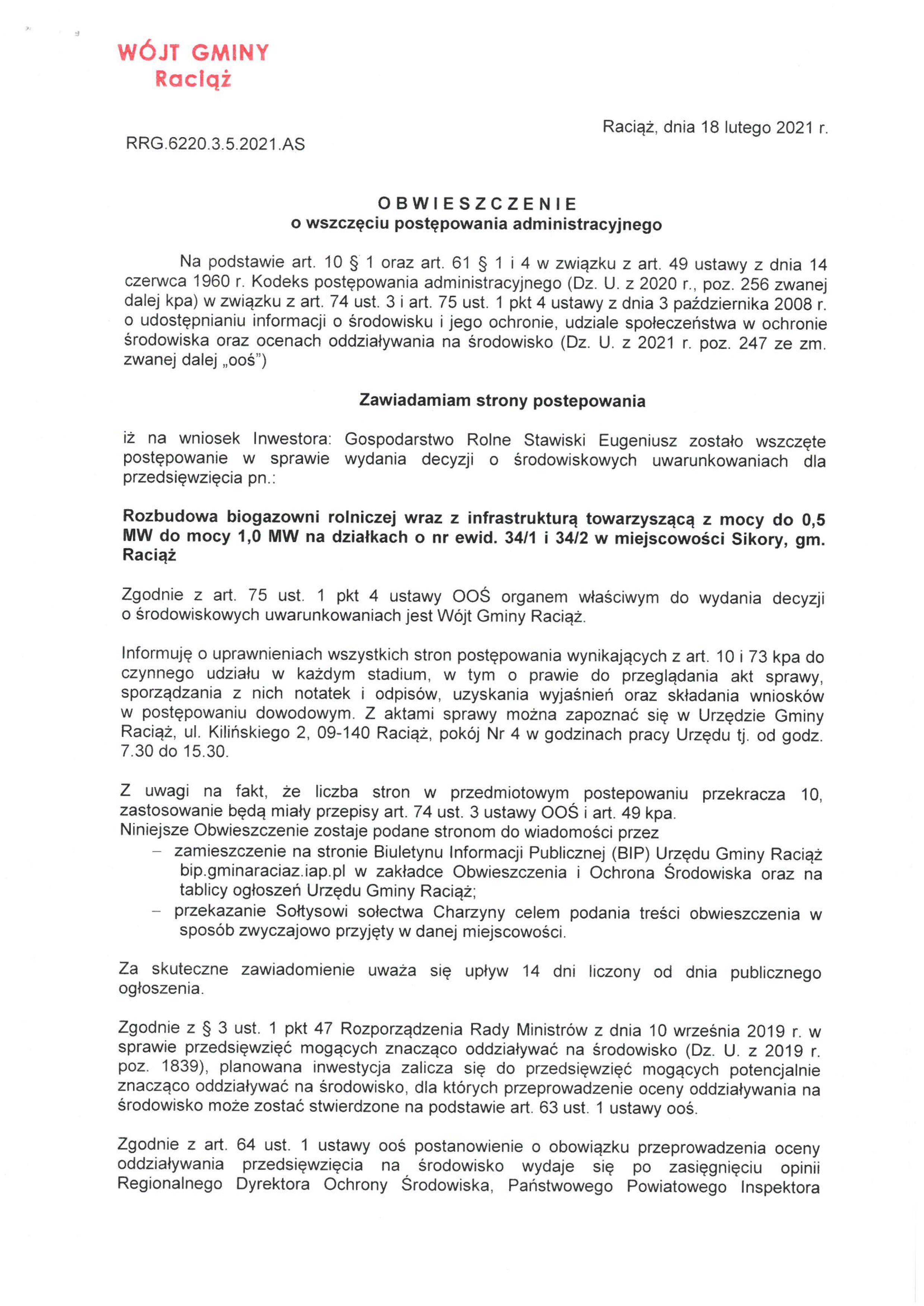 Rozbudowa biogazowni rolniczej wraz z infrastrukturą towarzyszącą z mocy do 0,5 MW do mocy 1,0 MW na działkach o nr ewid. 34/1 i 34/2 w miejscowości Sikory, gm. Raciąż