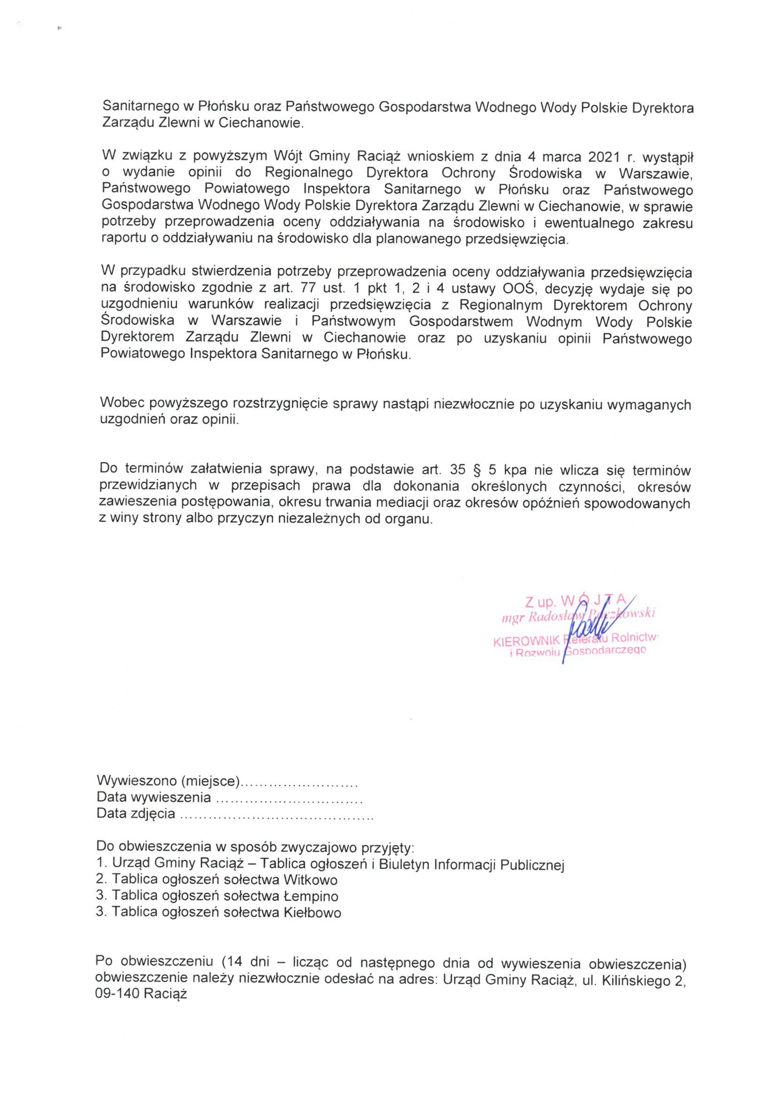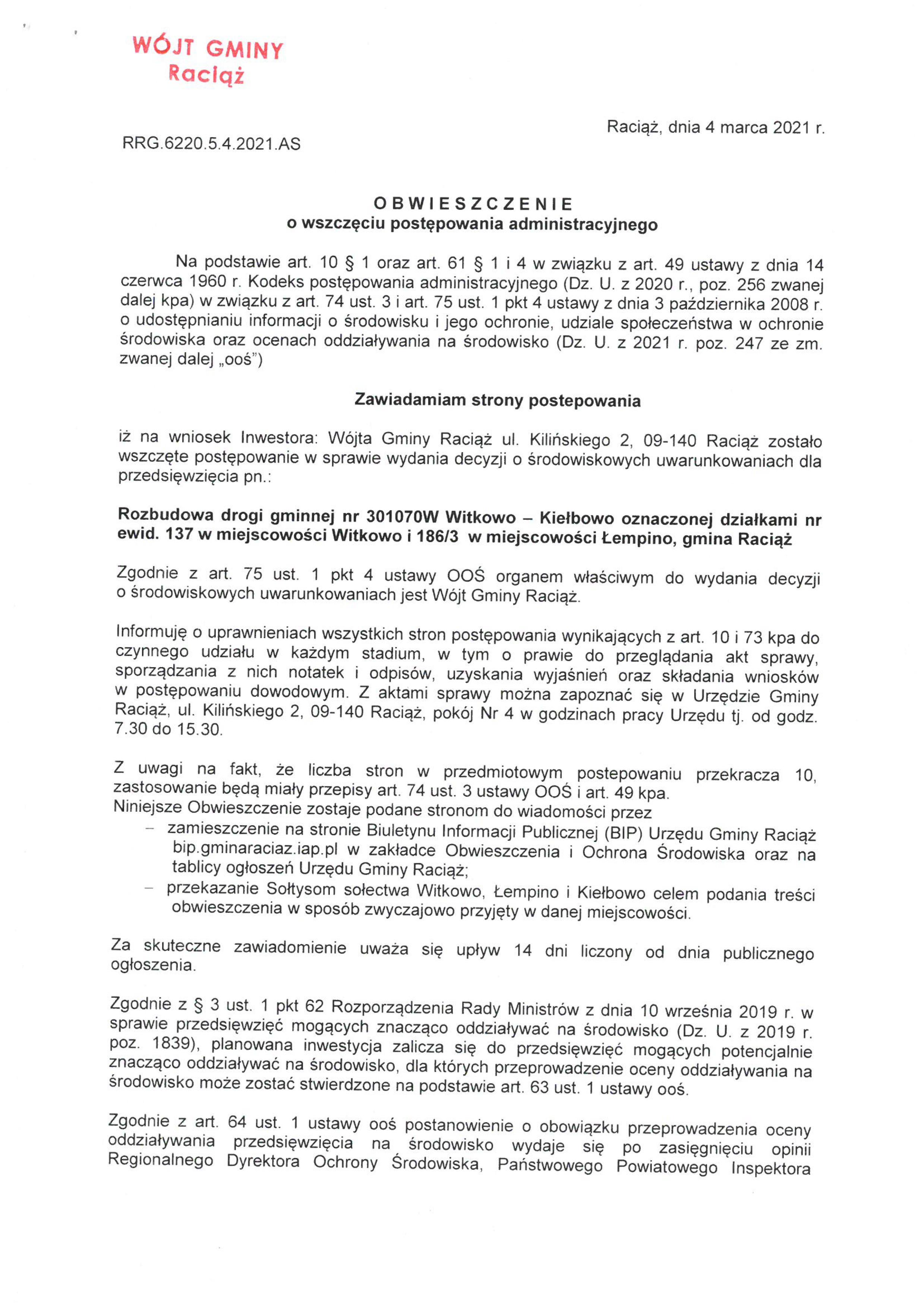 Rozbudowa drogi gminnej nr 301070W Witkowo – Kiełbowo oznaczonej działkami nr ewid. 137 w miejscowości Witkowo i 186/3 w miejscowości Łempino, gmina Raciąż