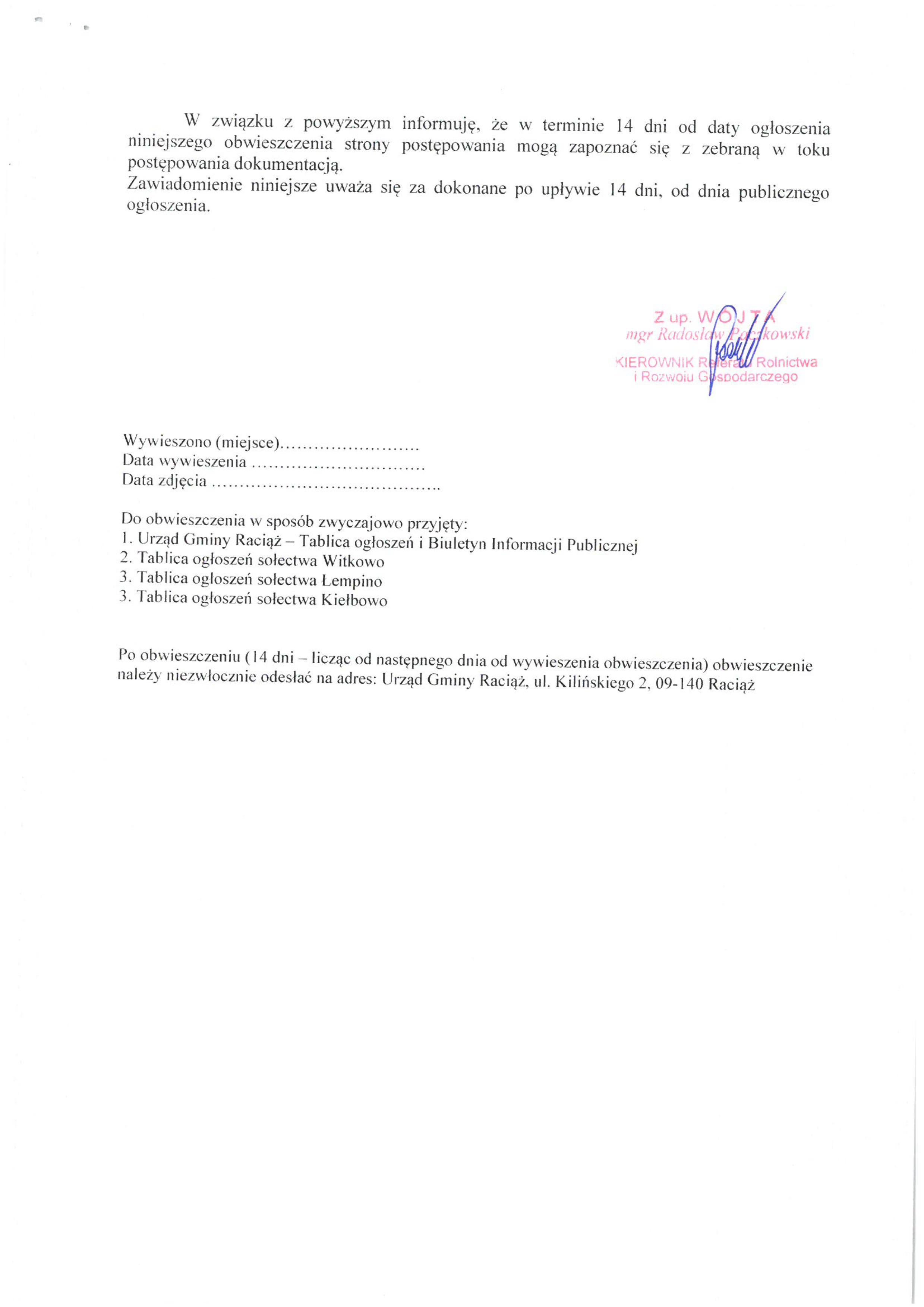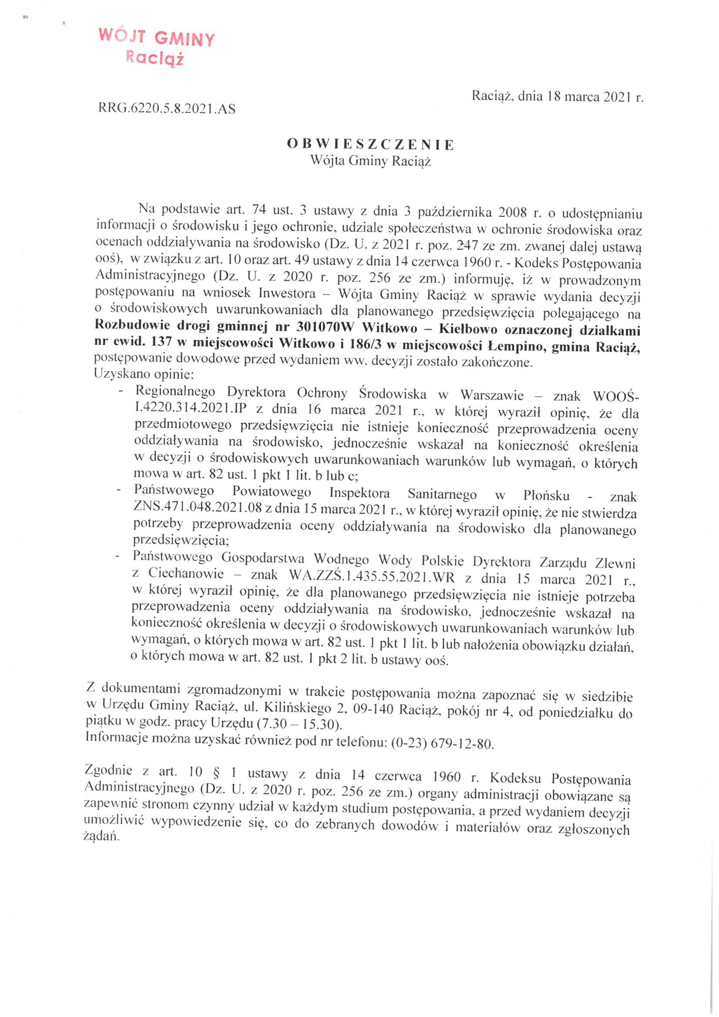 Rozbudowa drogi gminnej nr 301070W Witkowo – Kiełbowo oznaczonej działkami nr ewid. 137 w miejscowości Witkowo i 186/3 w miejscowości Łempino, gmina Raciąż