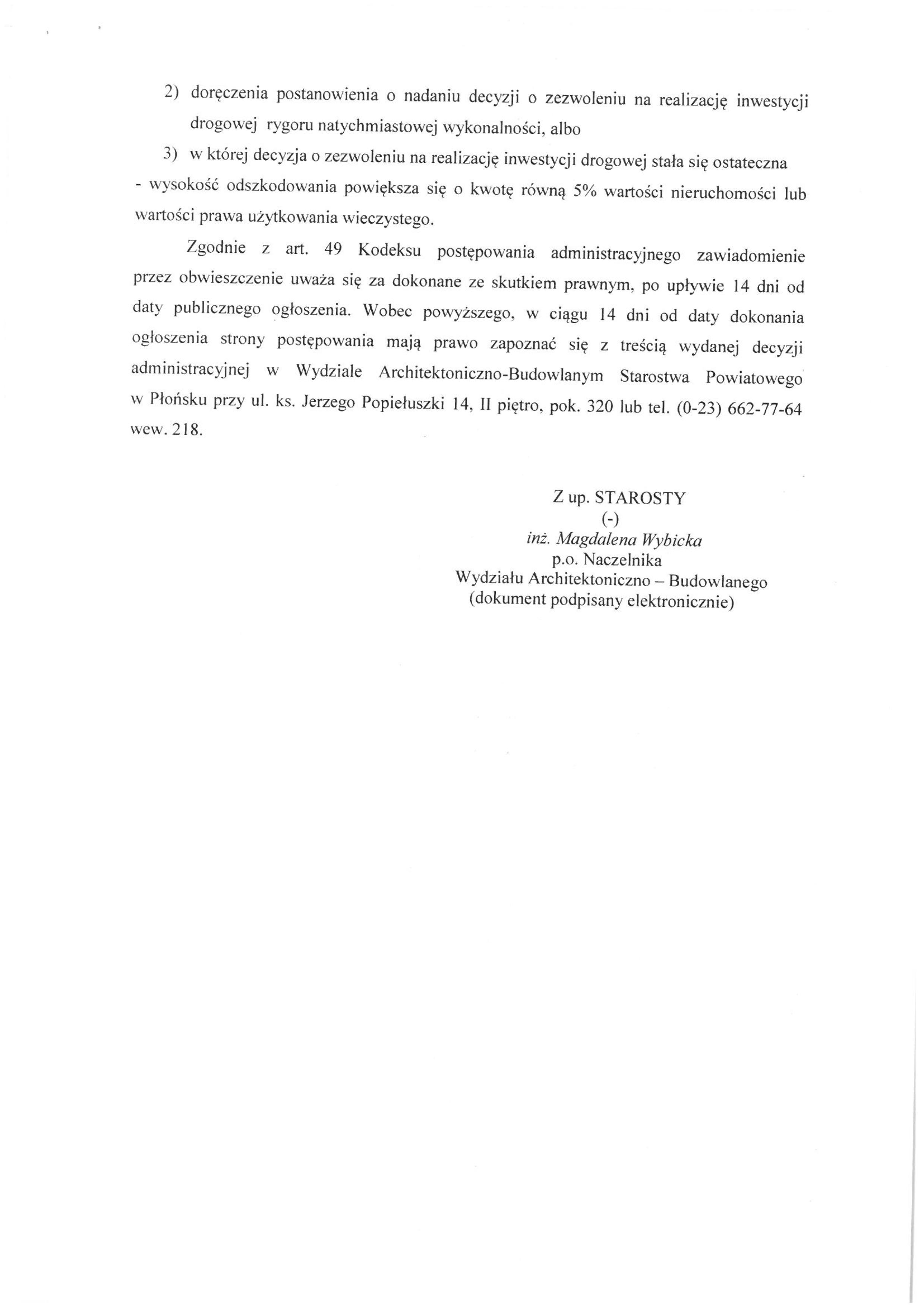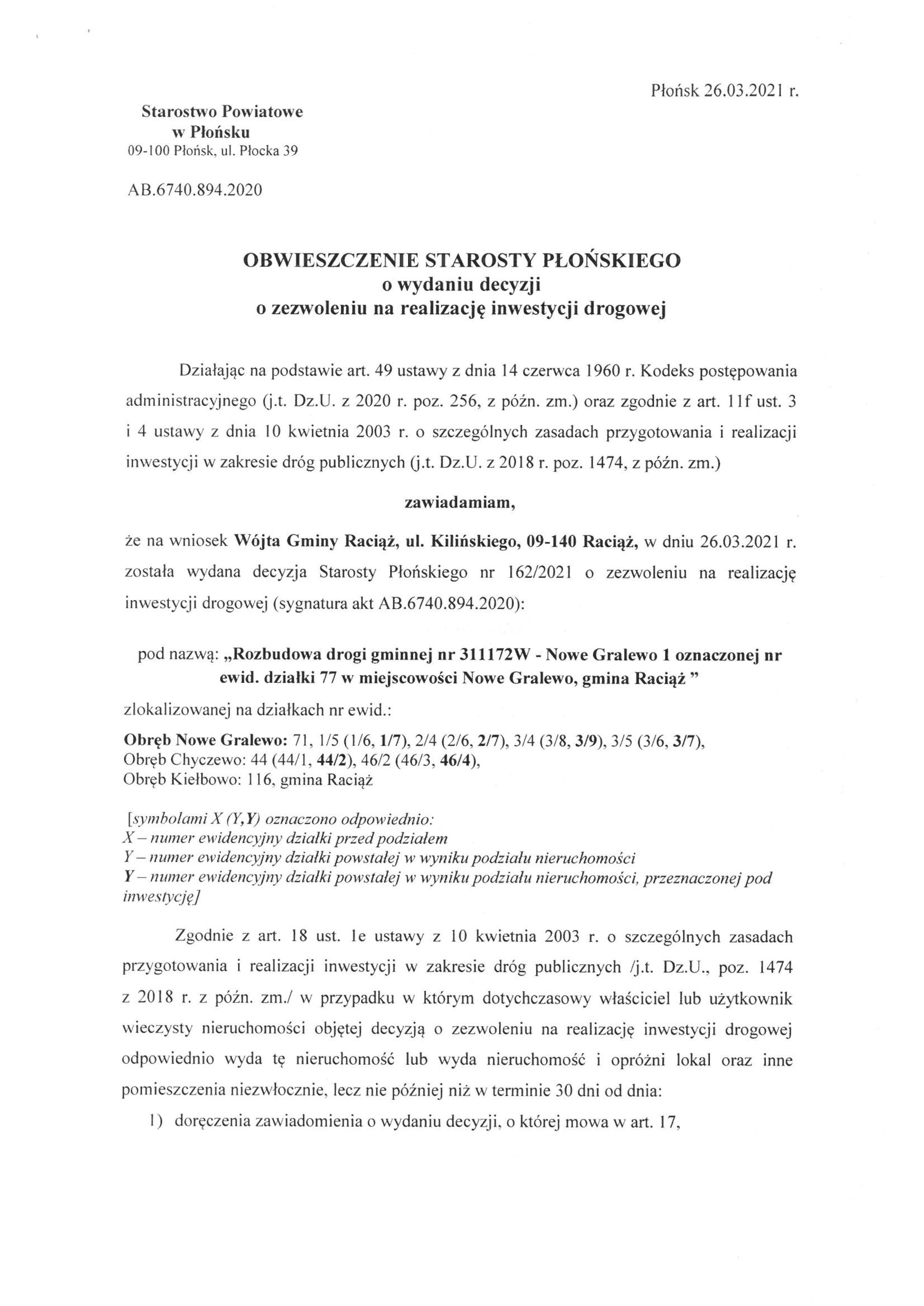 Obwieszczenie Starosty Powiatu Płońskiego o wydaniu decyzji o zezwoleniu na realizację inwestycji drogowej pn.