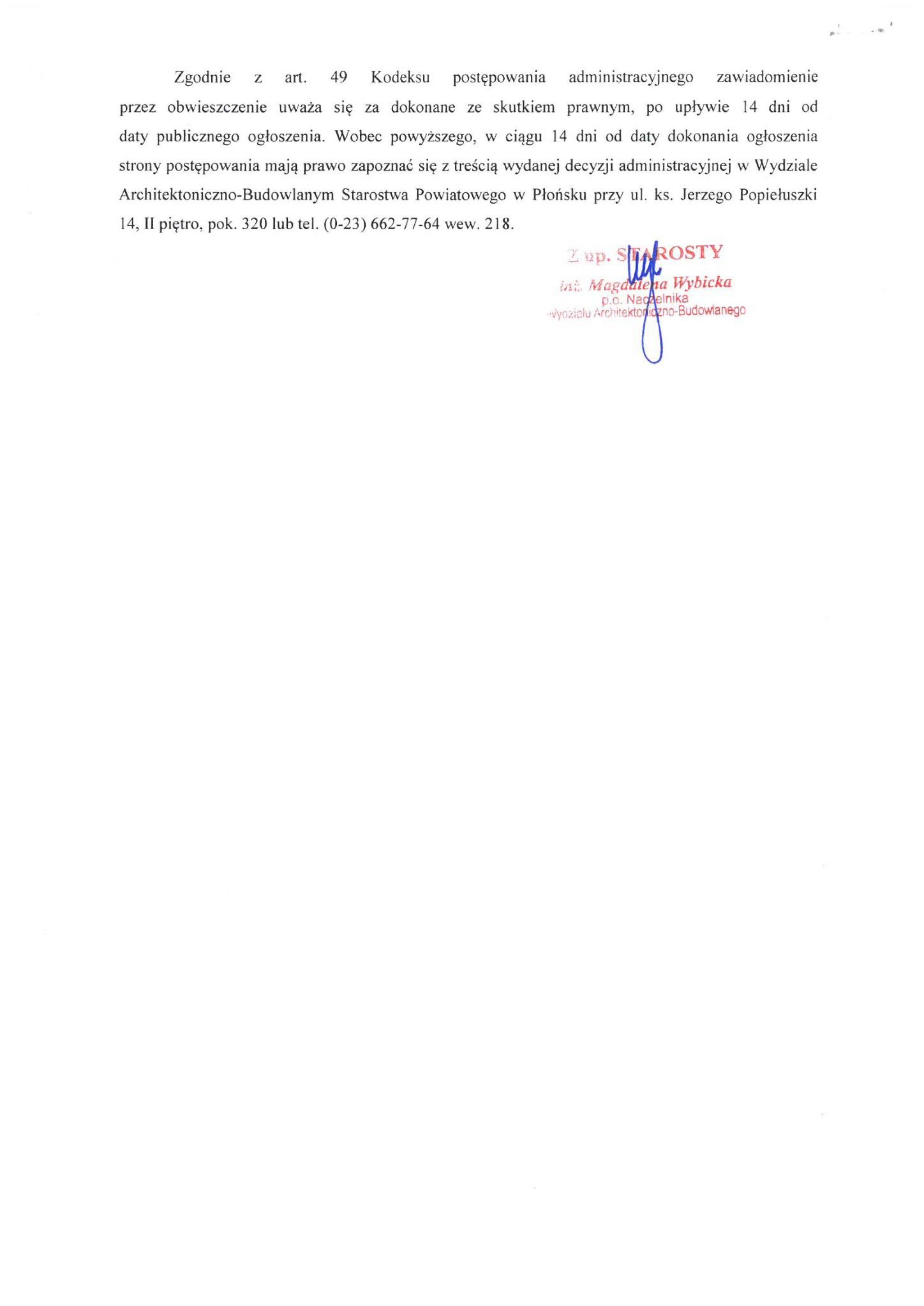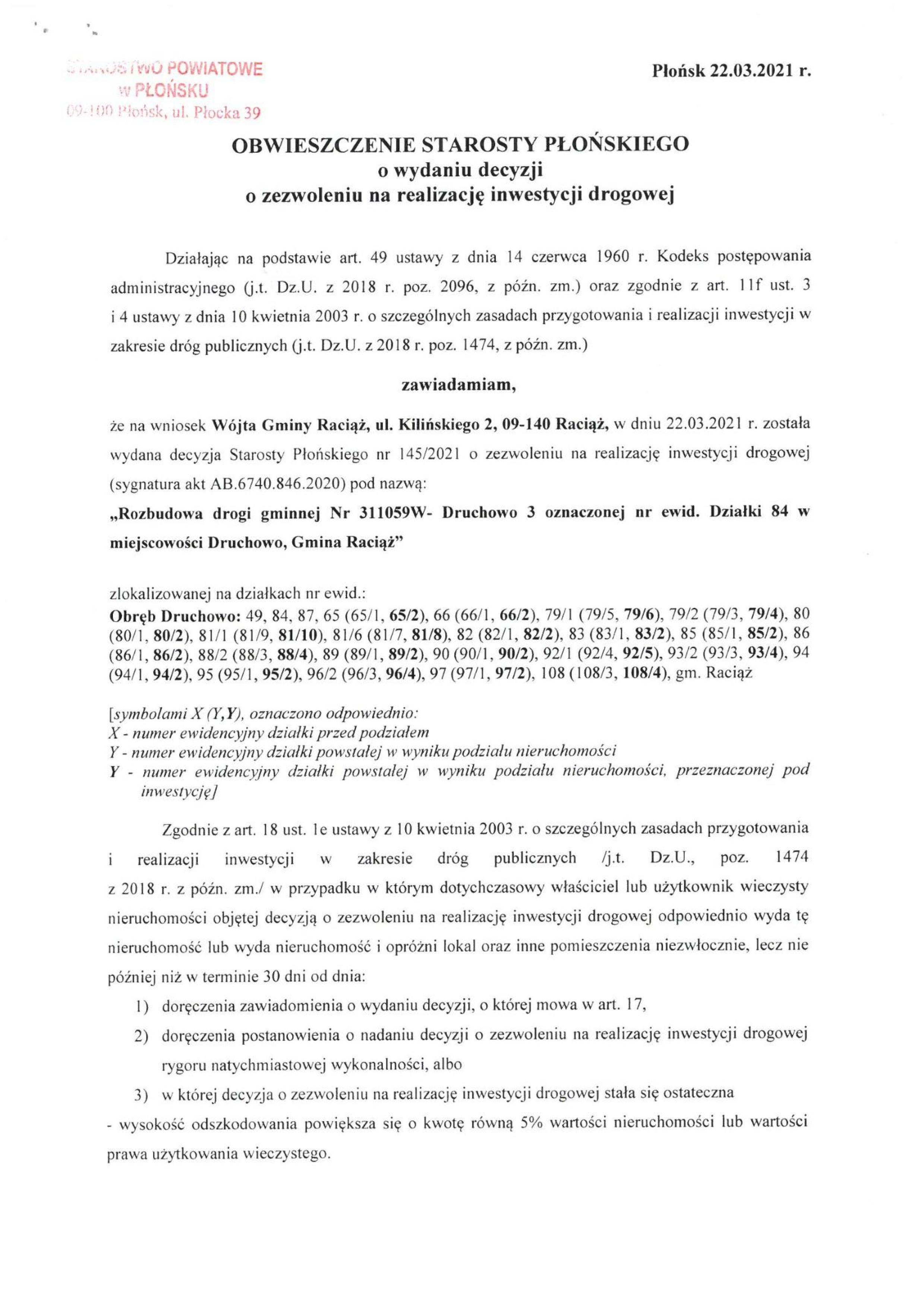 Obwieszczenie Starosty Płońskiego o wydaniu decyzji o zezwoleniu na realizację inwestycji drogowej pn.