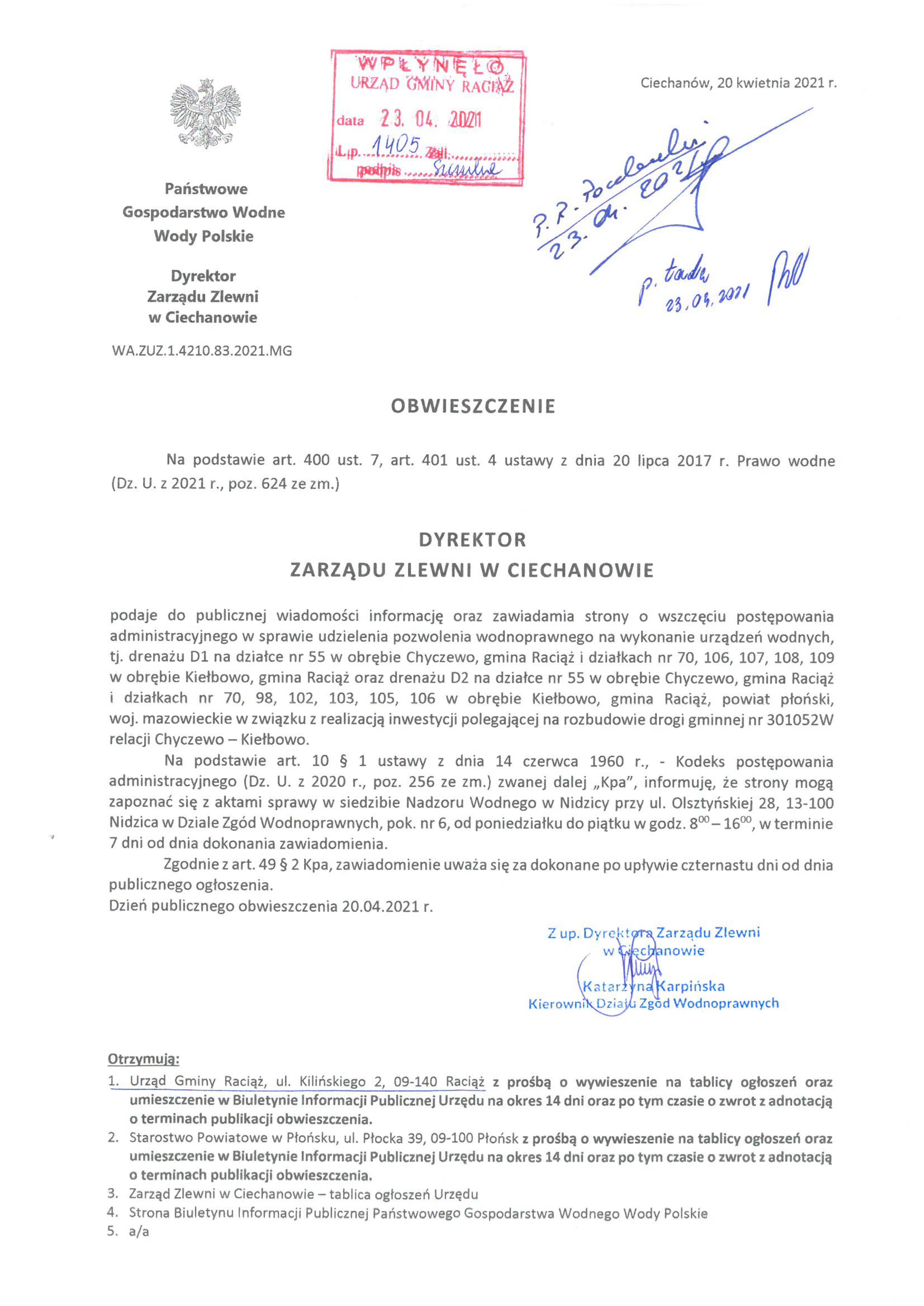 Obwieszczenie wodnoprawne – wszczęcie postępowania droga gminna NR 301052W relacji Chyczewo-Kiełbowo.