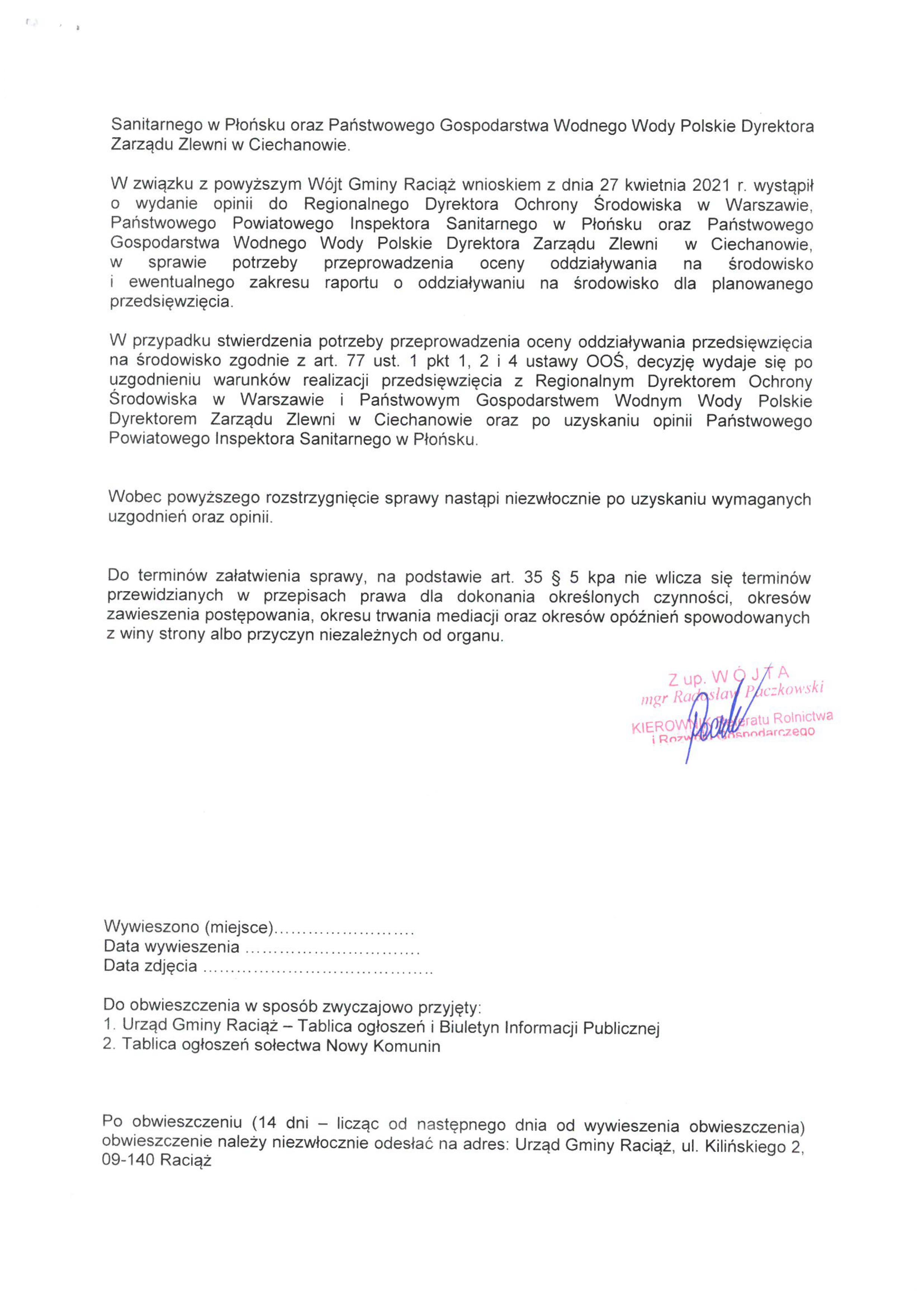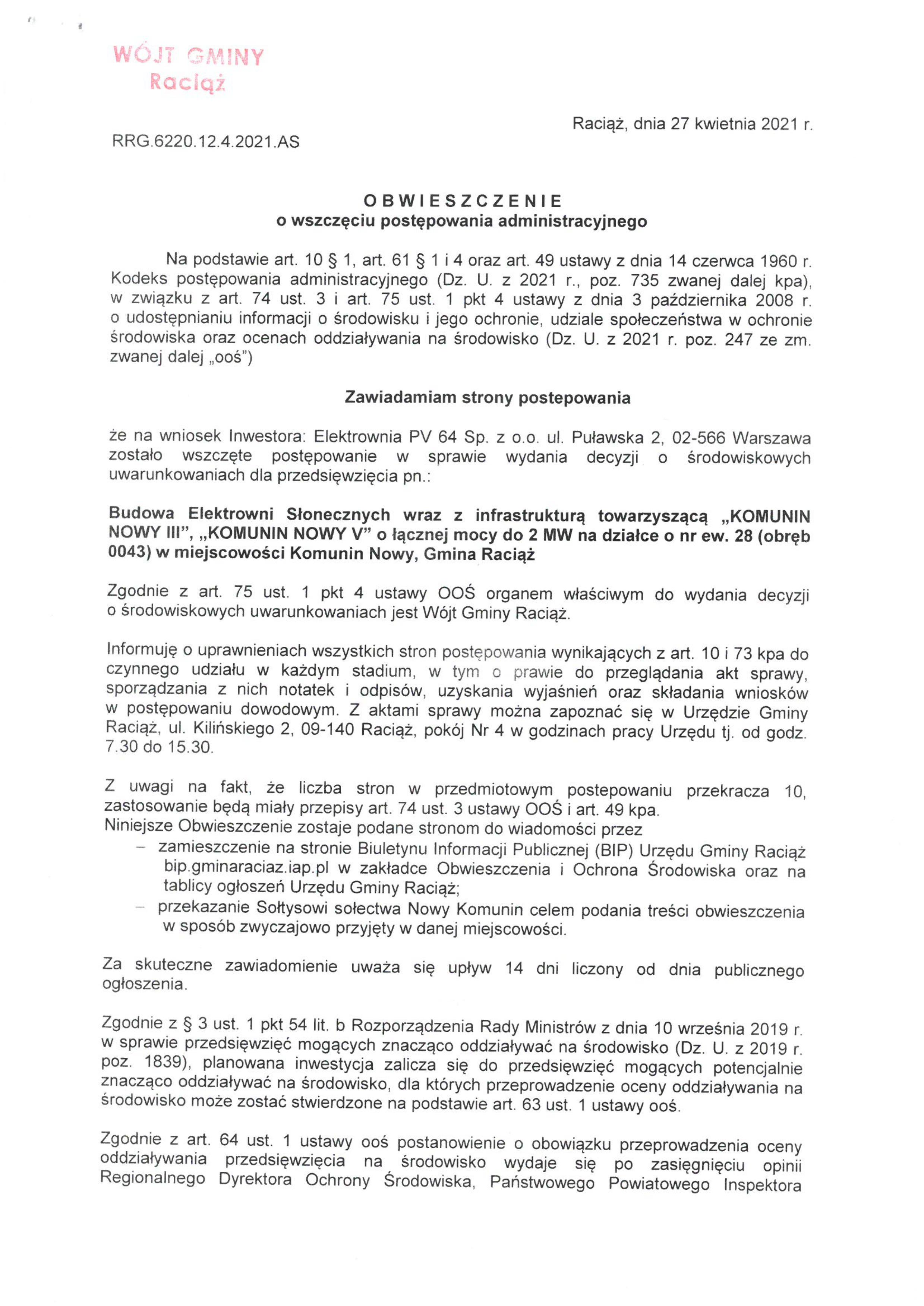 Budowa Elektrowni Słonecznych wraz z infrastrukturą towarzyszącą „KOMUNIN NOWY III”, „KOMUNIN NOWY V” o łącznej mocy do 2 MW na działce o nr ew. 28 (obręb 0043) w miejscowości Komunin Nowy, Gmina Raciąż