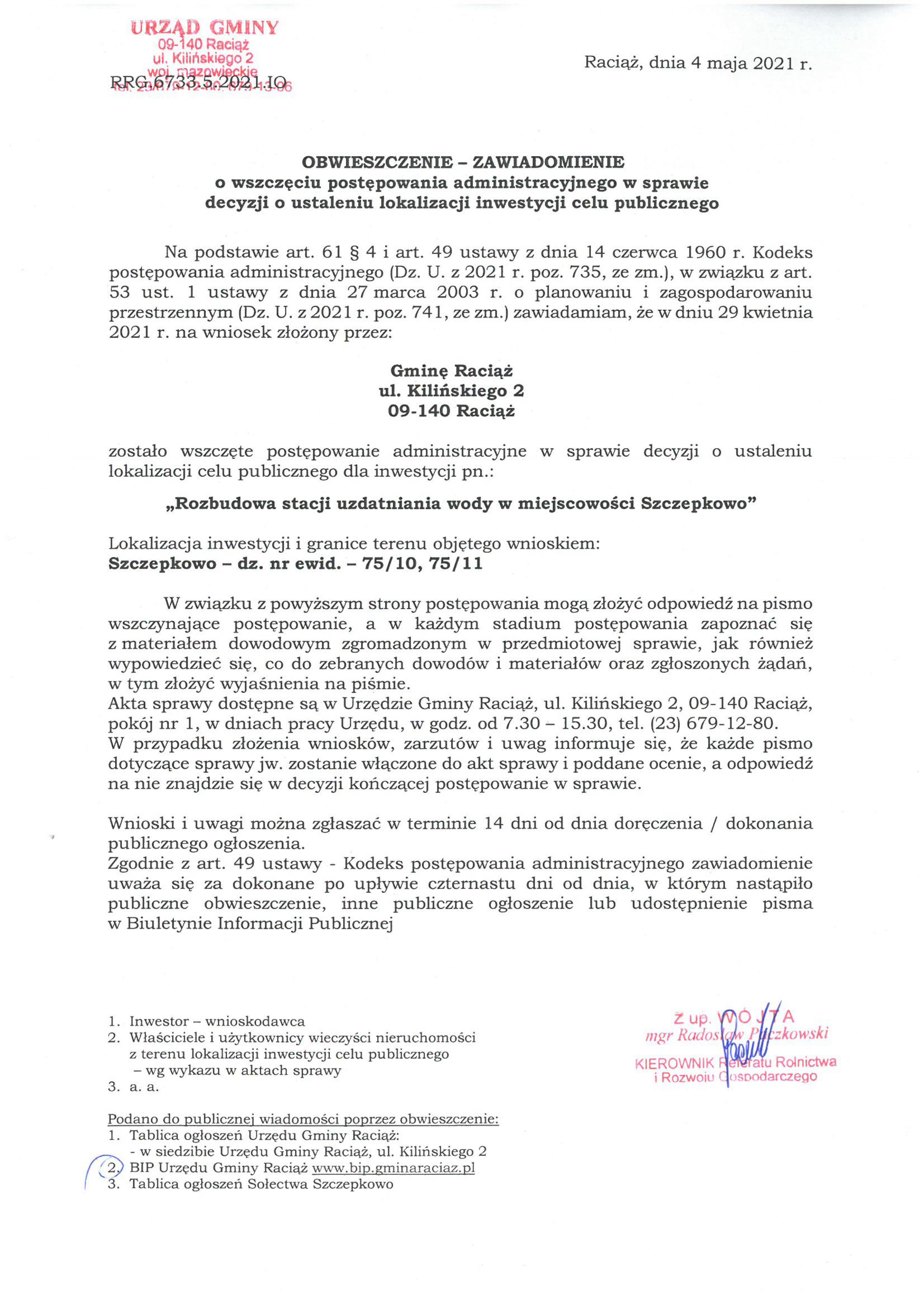 5.2021 Cel Publiczny – Obwieszczenie o wszczęciu postępowania pn. Rozbudowa stacji uzdatniania wody w miejscowości Szczepkowo