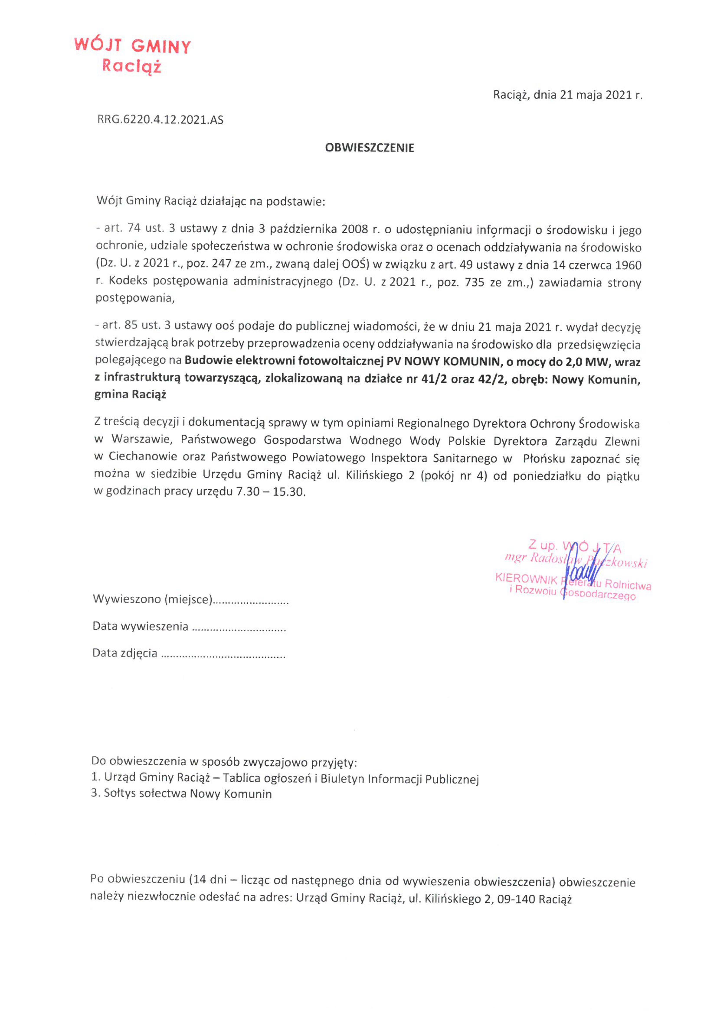 Budowa elektrowni fotowoltaicznej PV NOWY KOMUNIN, o mocy do 2,0 MW, wraz z infrastrukturą towarzyszącą, zlokalizowaną na działce nr 41/2 oraz 42/2, obręb: Nowy Komunin, gmina Raciąż