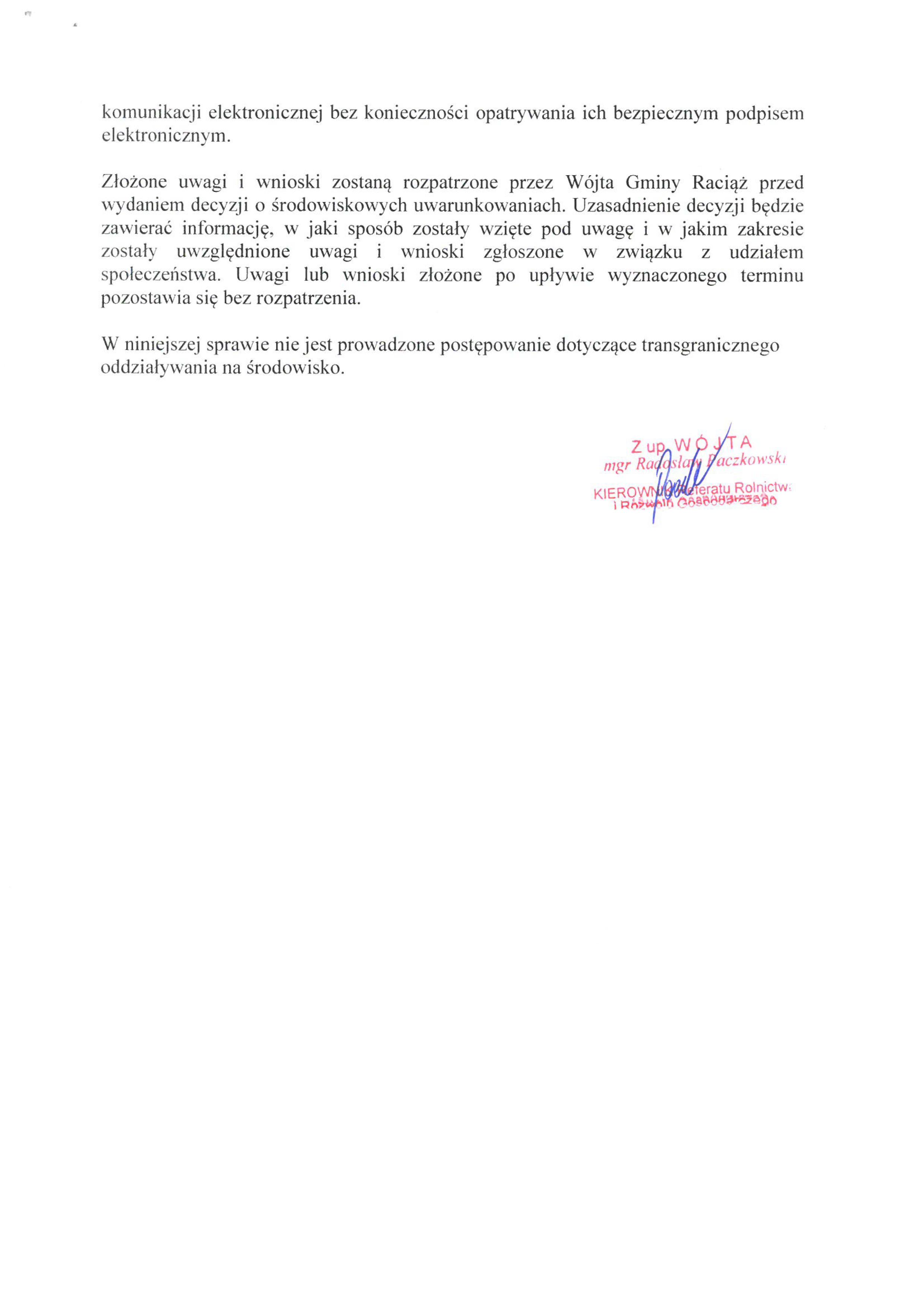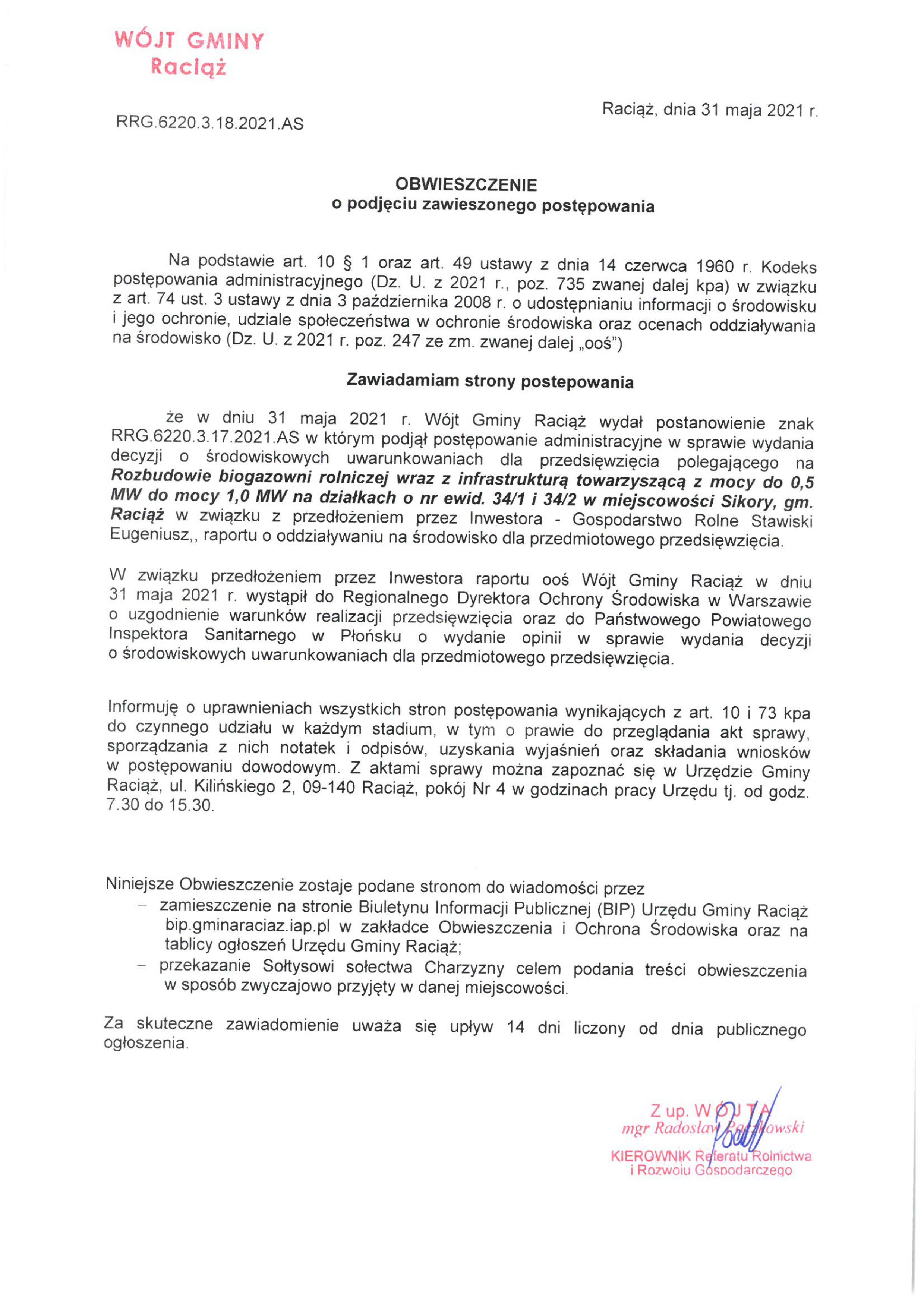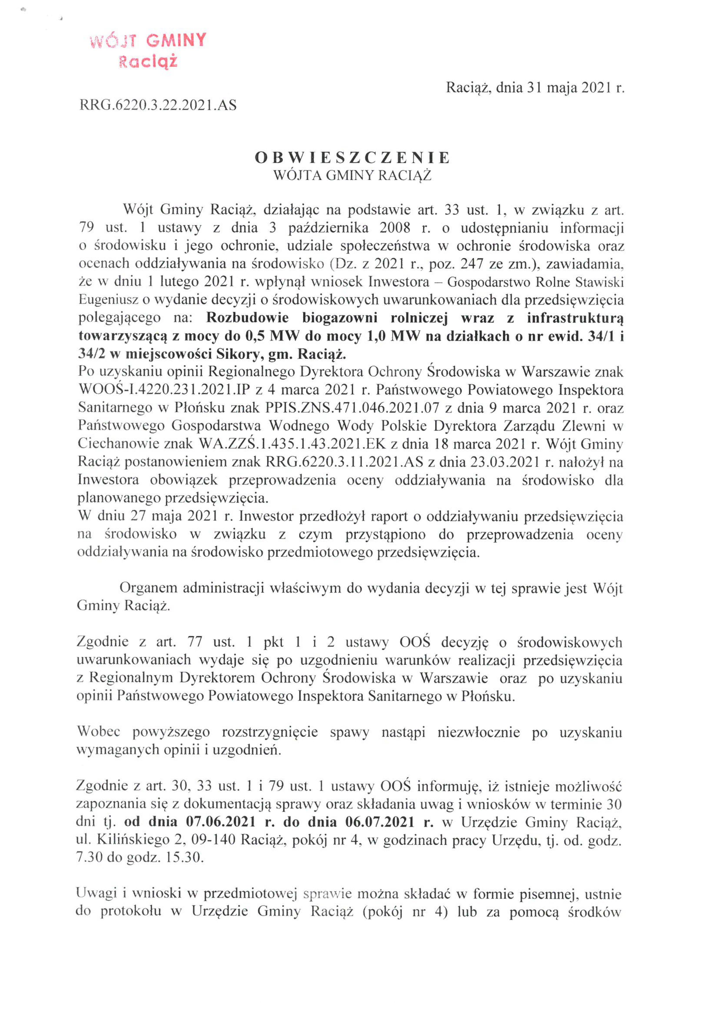 Rozbudowa biogazowni rolniczej wraz z infrastrukturą towarzyszącą z mocy do 0,5 MW do mocy 1,0 MW na działkach o nr ewid. 34/1 i 34/2 w miejscowości Sikory, gm. Raciąż