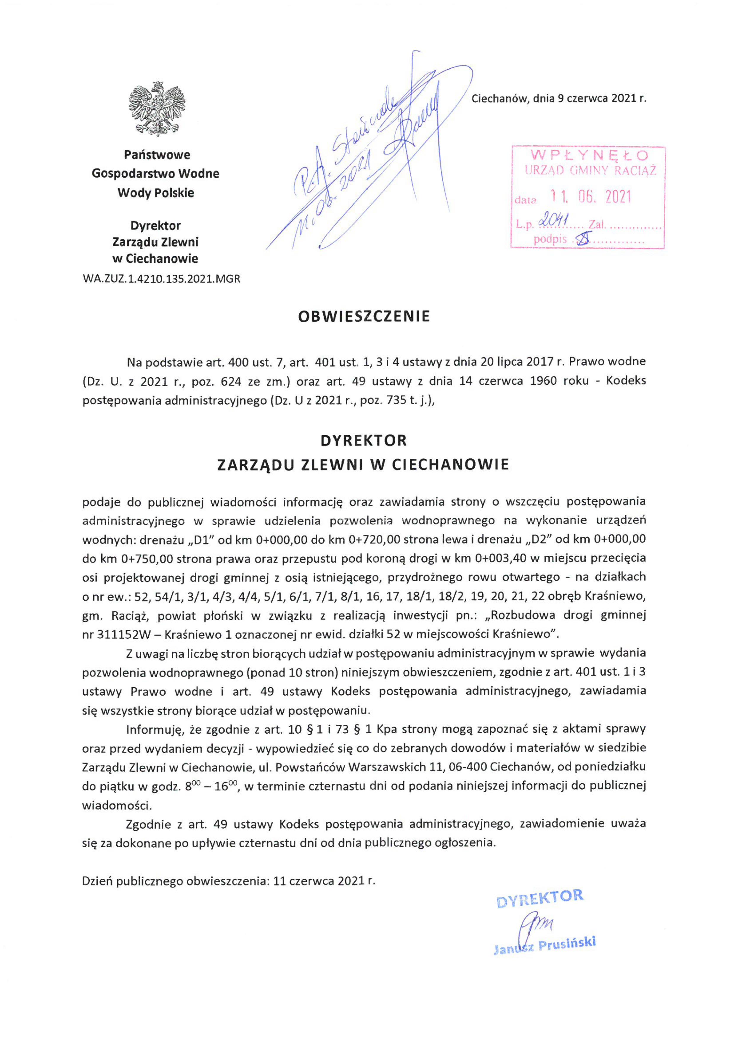 Obwieszczenie wodnoprawne – wszczęcie postępowania droga 311152W Kraśniewo 1