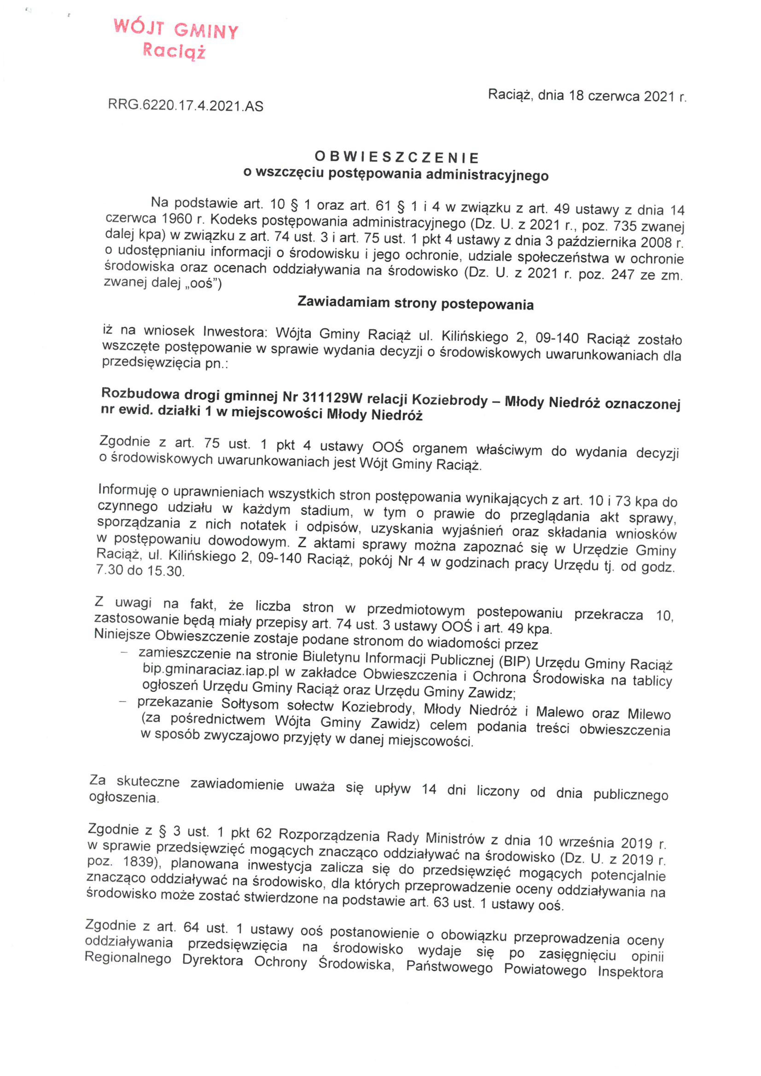 Rozbudowa drogi gminnej Nr 311129W relacji Koziebrody – Młody Niedróż oznaczonej nr ewid. działki 1 w miejscowości Młody Niedróż