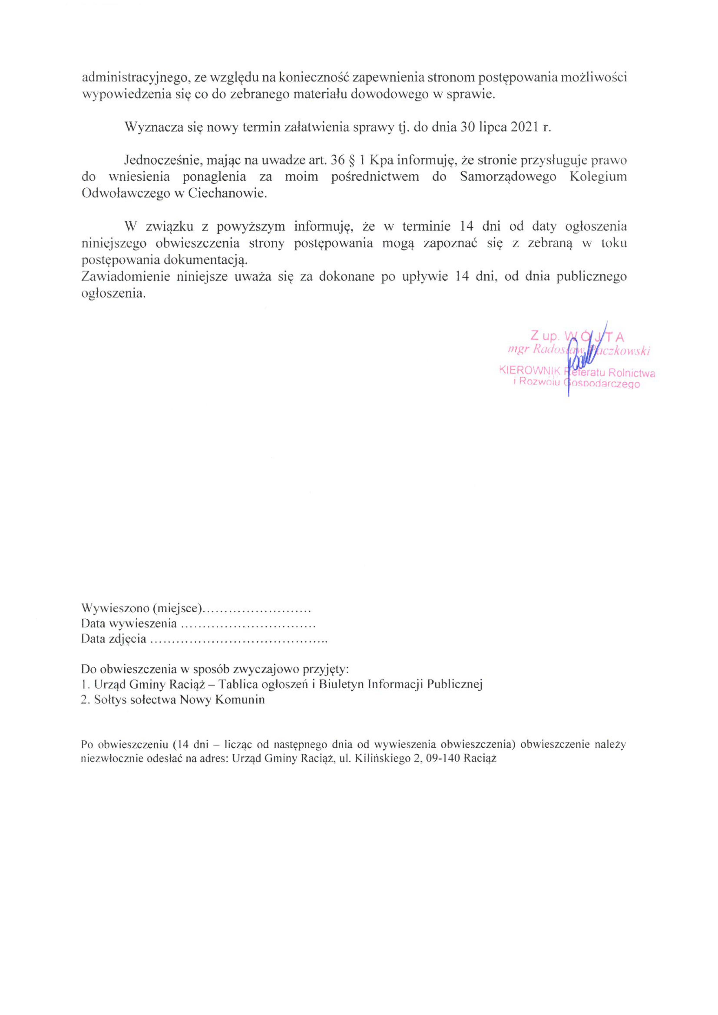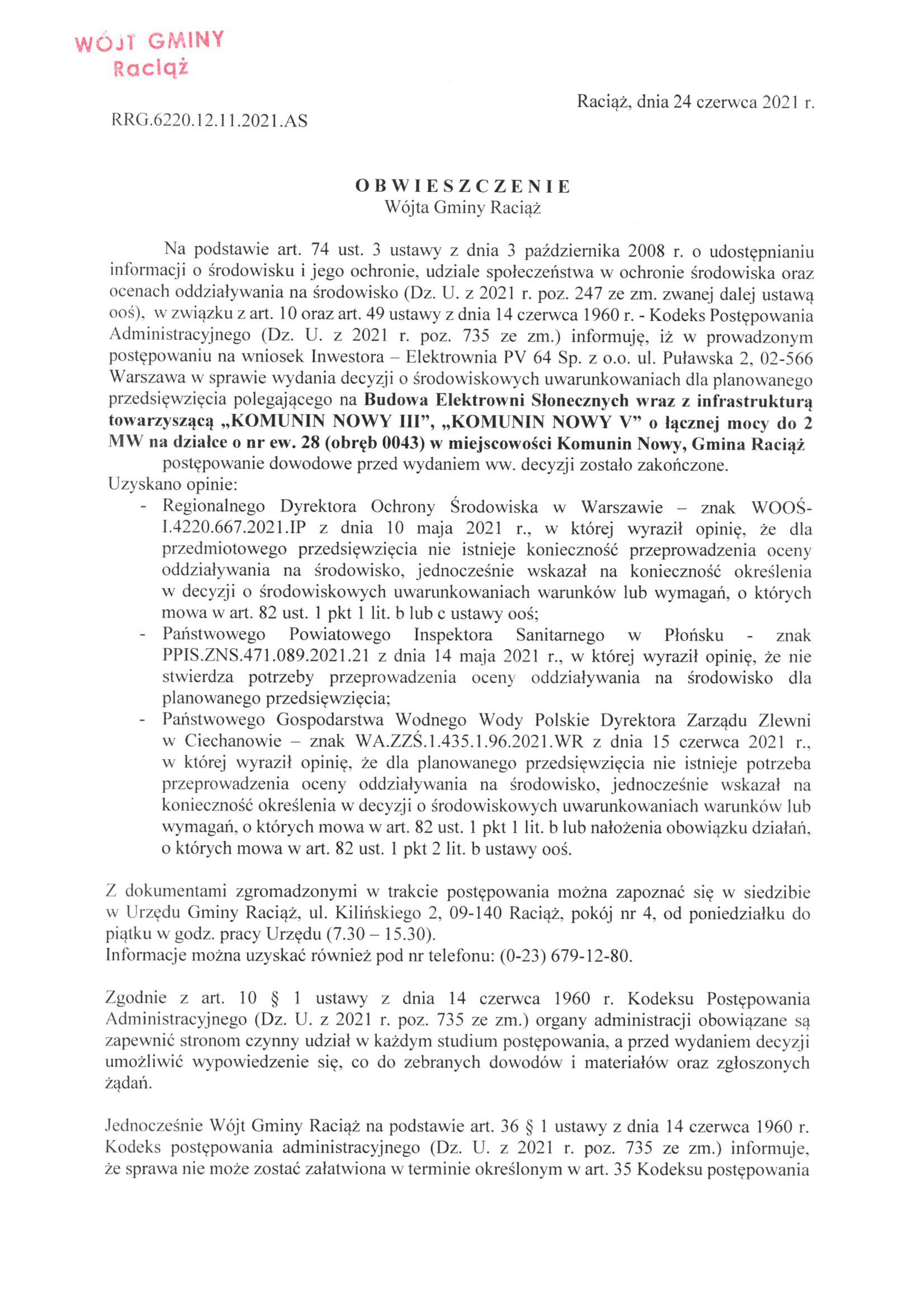 Budowa Elektrowni Słonecznych wraz z infrastrukturą towarzyszącą „KOMUNIN NOWY III”, „KOMUNIN NOWY V” o łącznej mocy do 2 MW na działce o nr ew. 28 (obręb 0043) w miejscowości Komunin Nowy, Gmina Raciąż