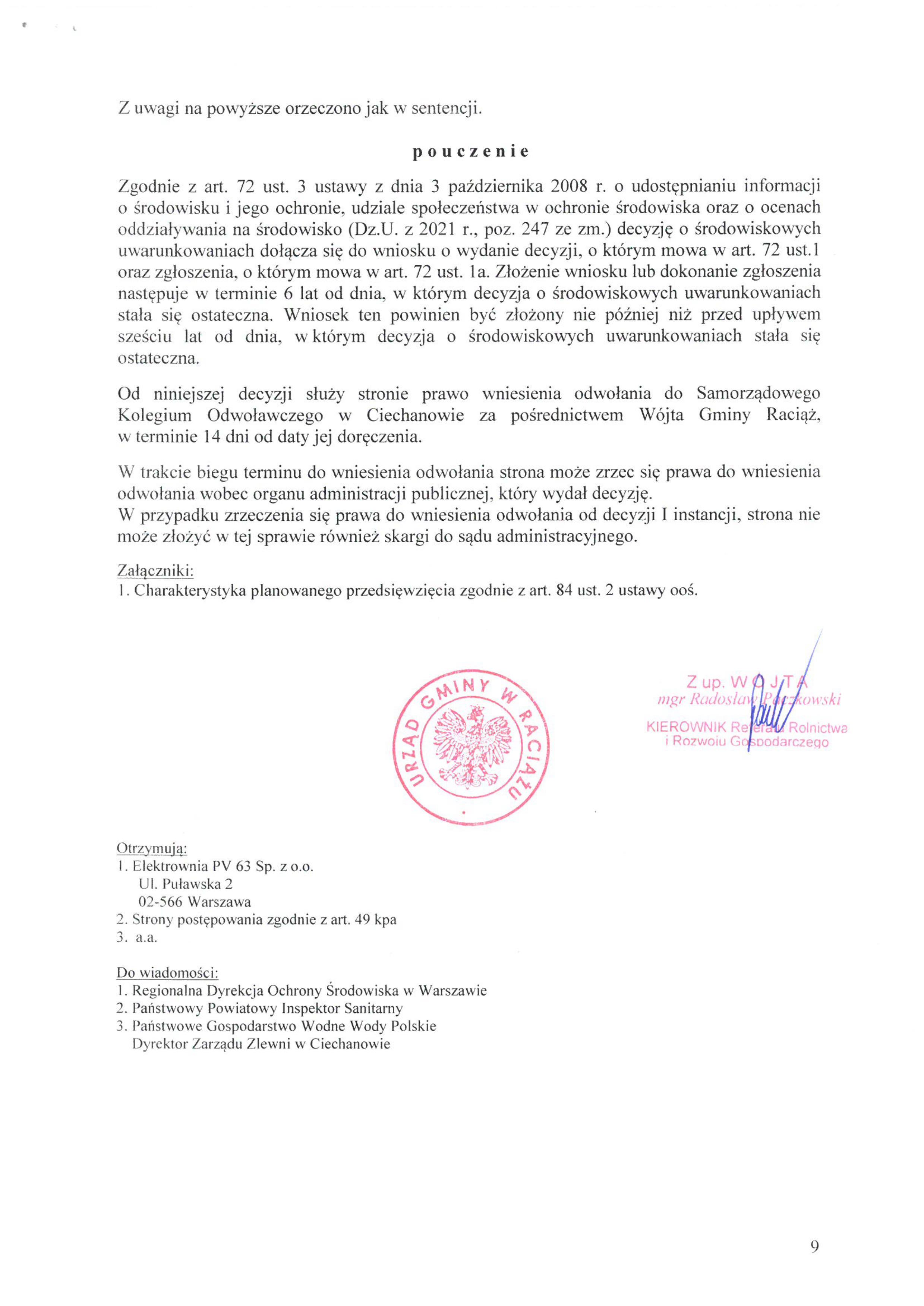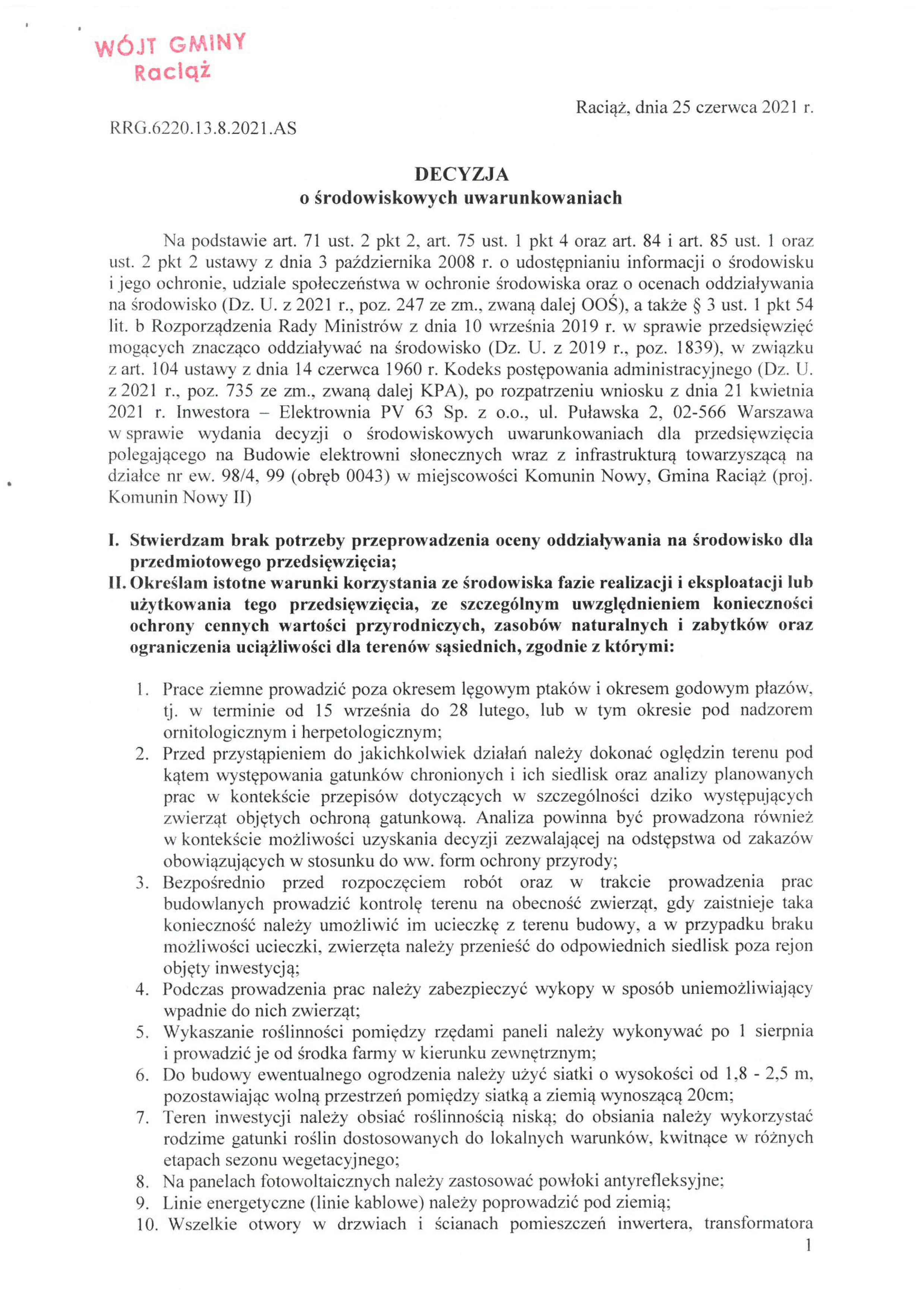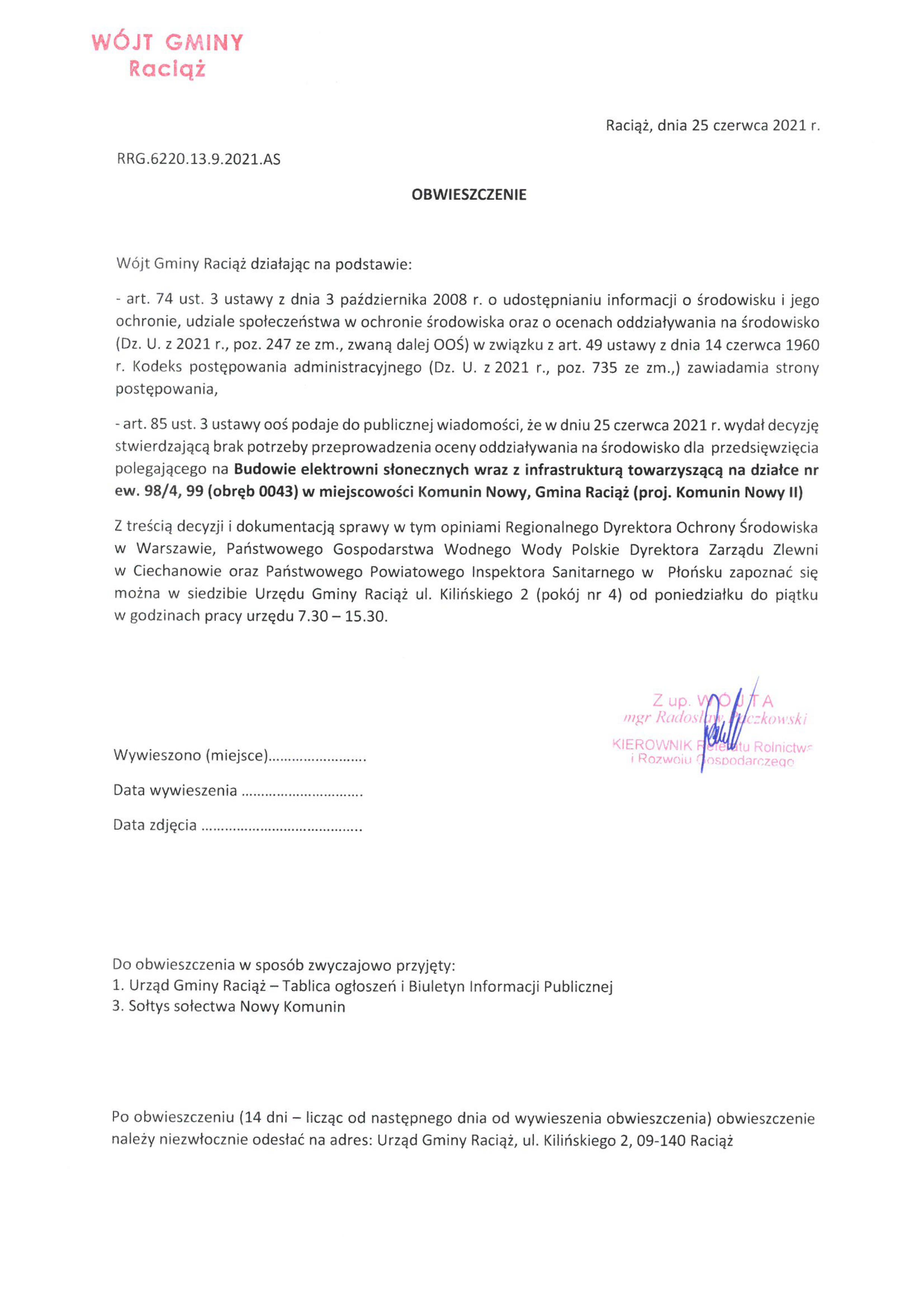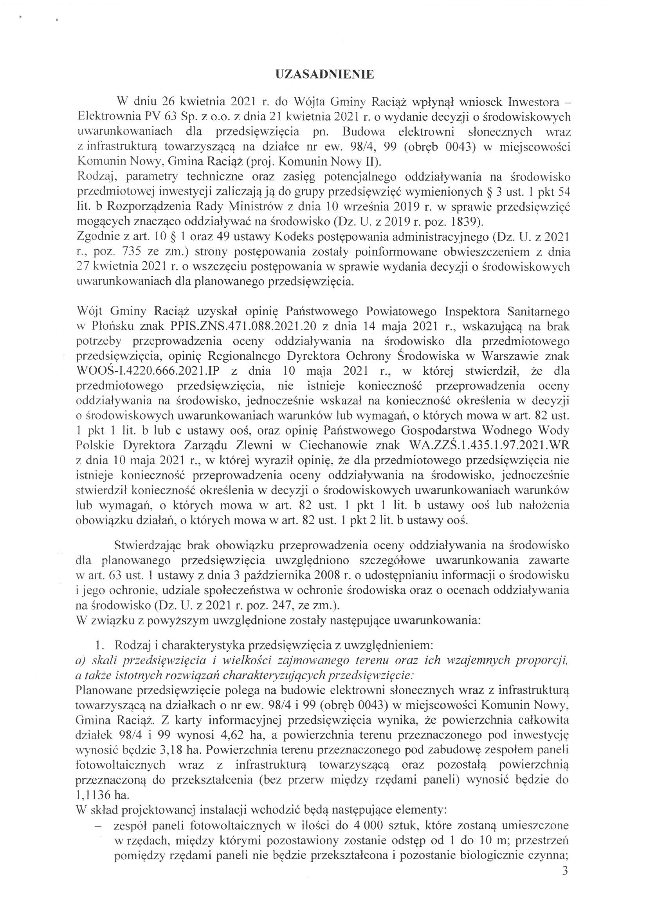 Budowa Elektrowni Słonecznych wraz z infrastrukturą towarzyszącą na działce nr ew. 98/4, 99 (obręb 0043) w miejscowości Komunin Nowy, Gmina Raciąż (proj. Komunin Nowy II)