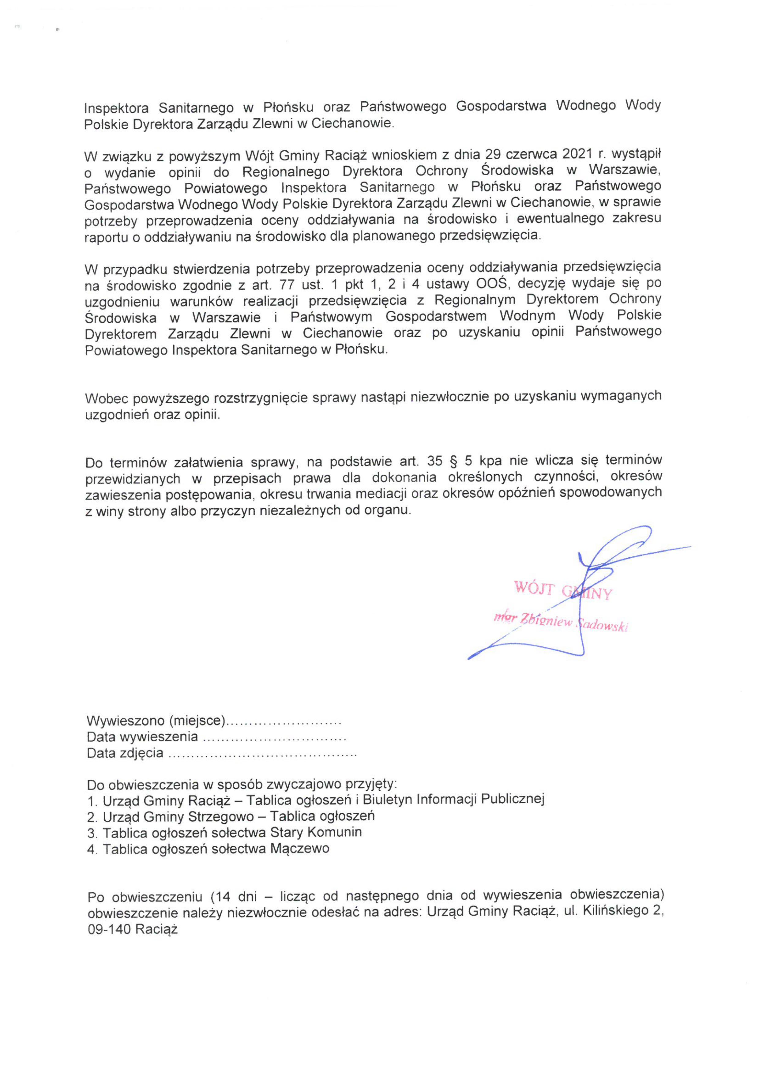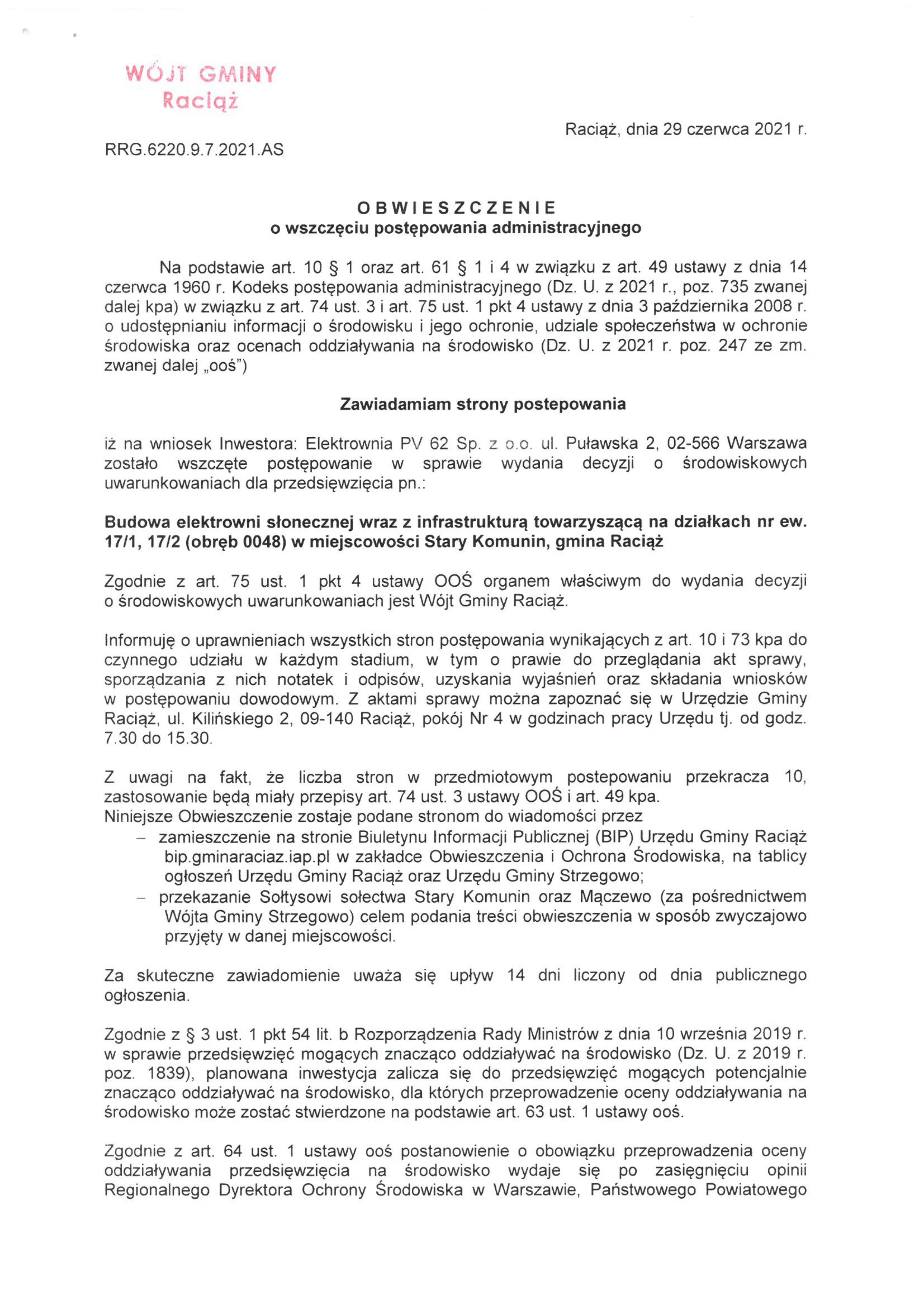 Budowa elektrowni słonecznej wraz z infrastrukturą towarzyszącą na działkach nr ew. 17/1, 17/2 (obręb 0048) w miejscowości Stary Komunin, gmina Raciąż