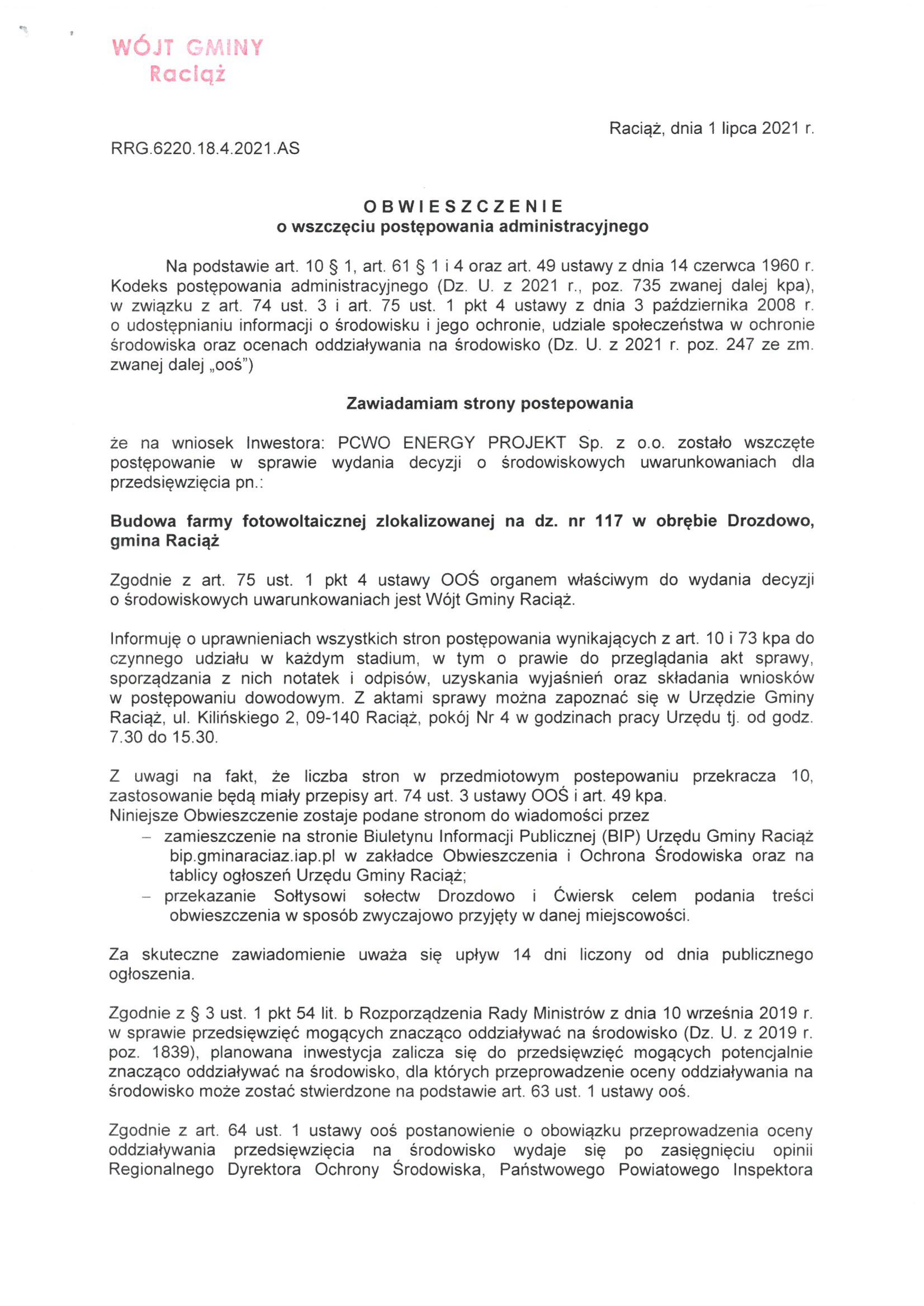 Budowa farmy fotowoltaicznej zlokalizowanej na dz. nr 91/7 w obrębie Sierakowo, gmina Raciąż