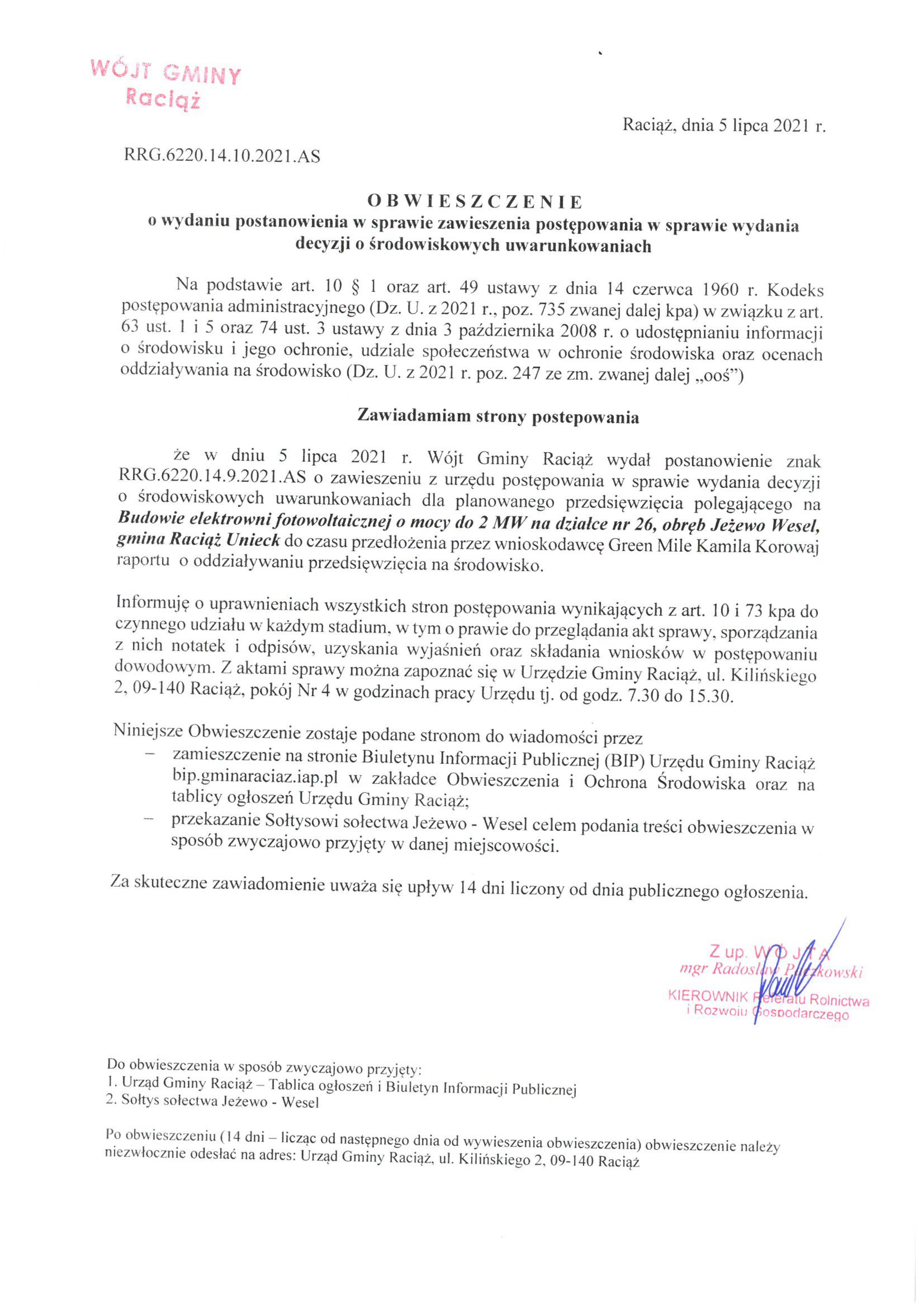 Budowa elektrowni fotowoltaicznej o mocy do 2 MW na działce nr 26, obręb Jeżewo Wesel, gmina Raciąż Unieck