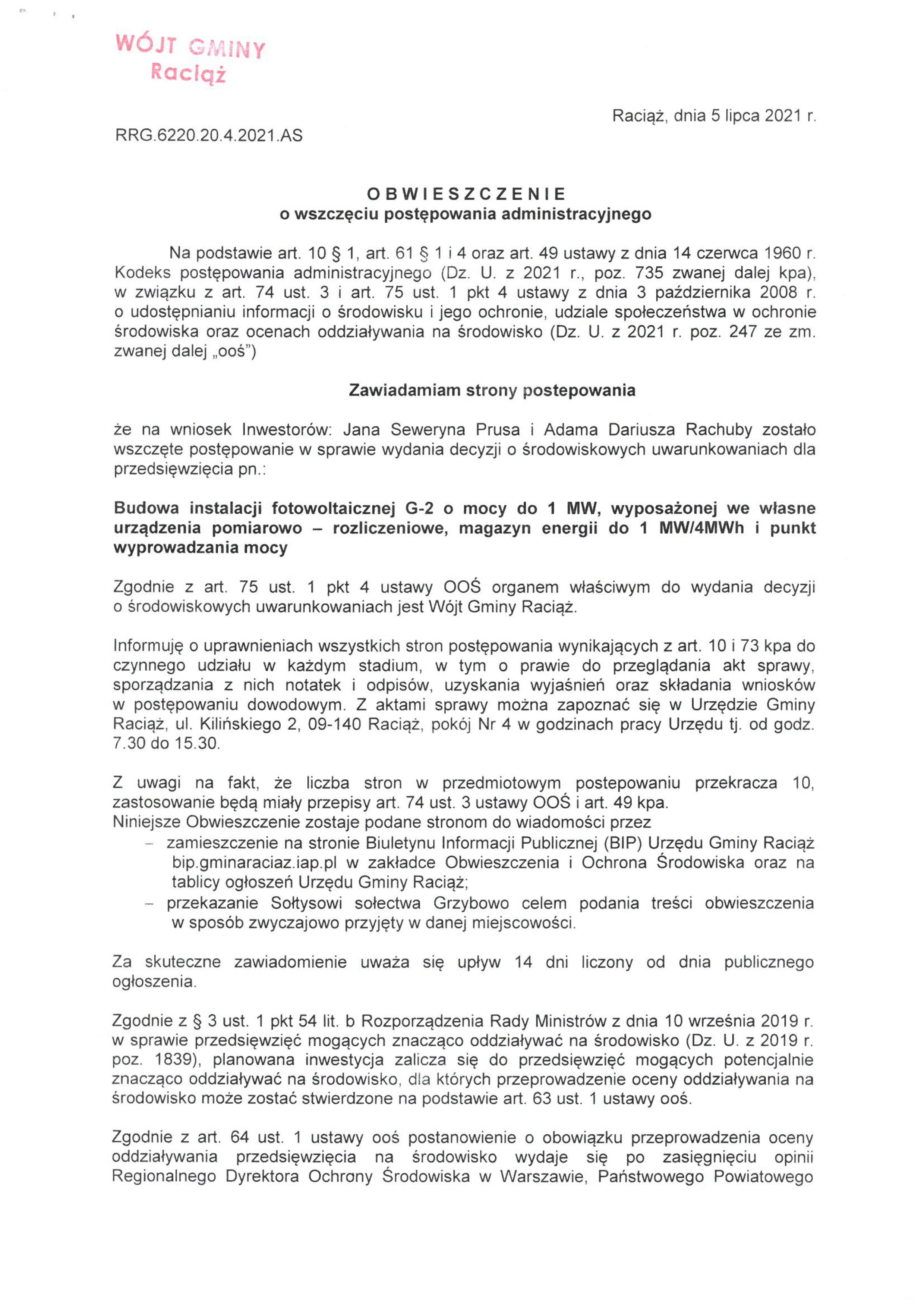 Budowa instalacji fotowoltaicznej G-2 o mocy do 1 MW, wyposażonej we własne urządzenia pomiarowo – rozliczeniowe, magazyn energii do 1 MW/4MWh i punkt wyprowadzania mocy