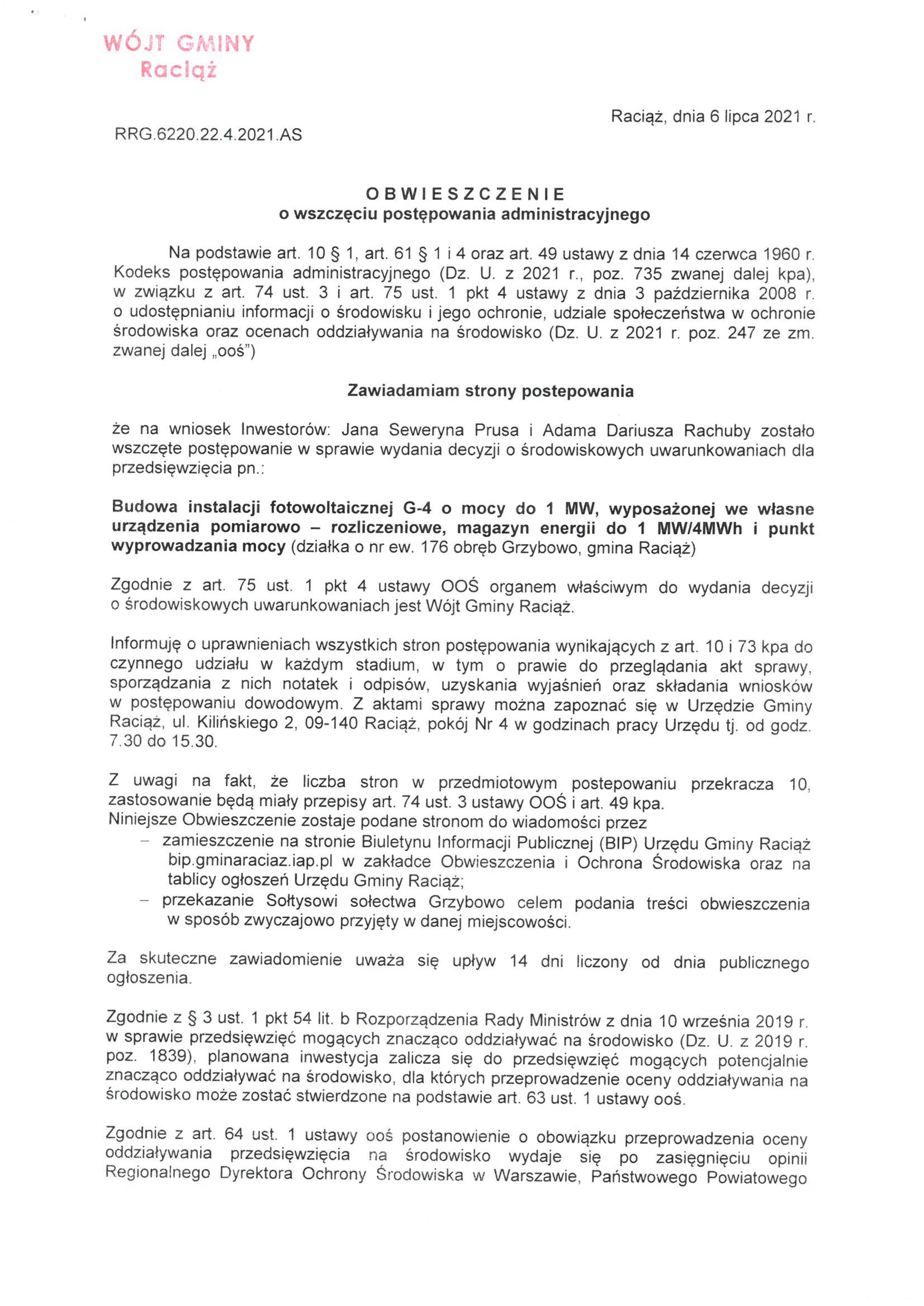Budowa instalacji fotowoltaicznej G-4 o mocy do 1 MW, wyposażonej we własne urządzenia pomiarowo – rozliczeniowe, magazyn energii do 1 MW/4MWh i punkt wyprowadzania mocy