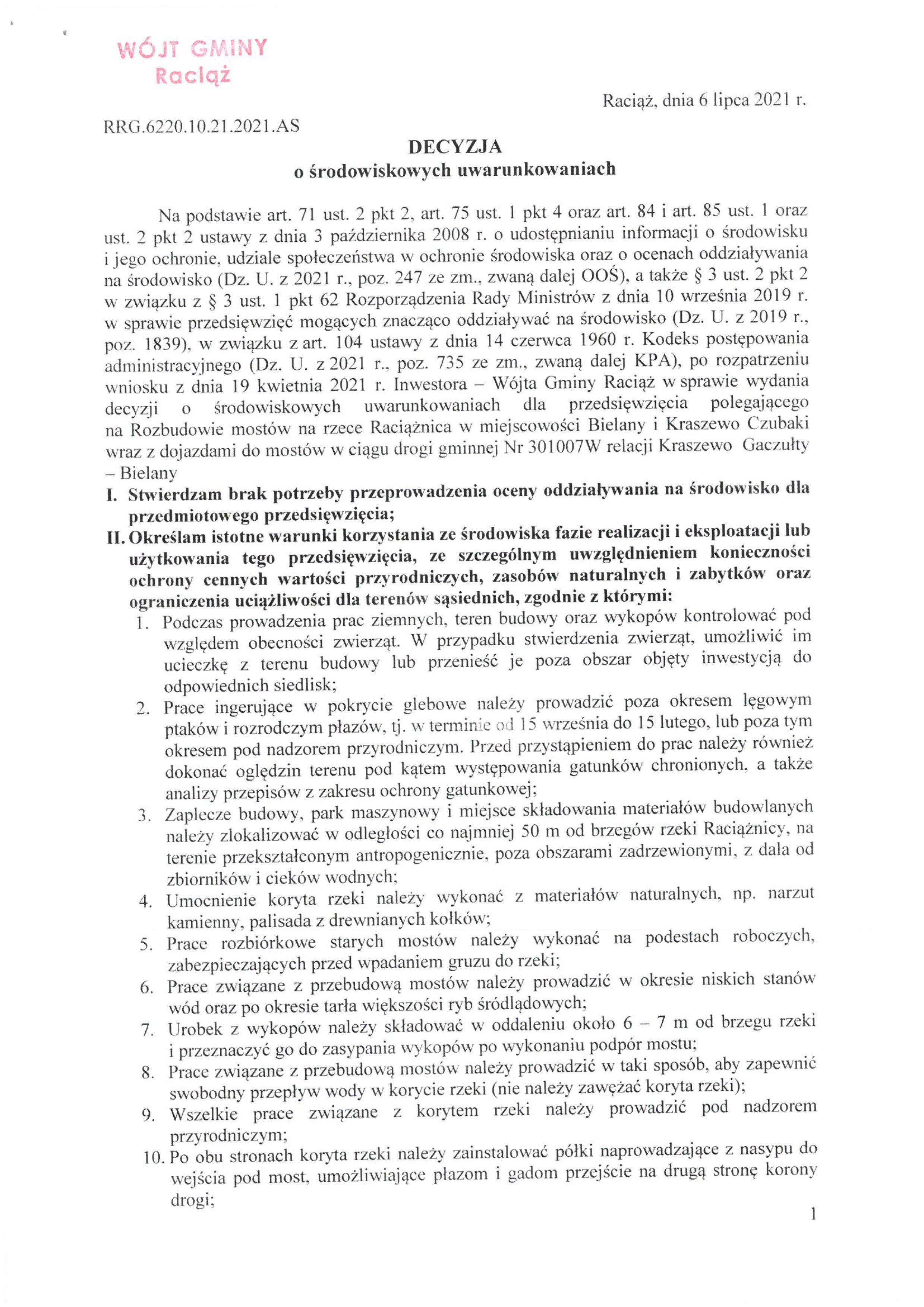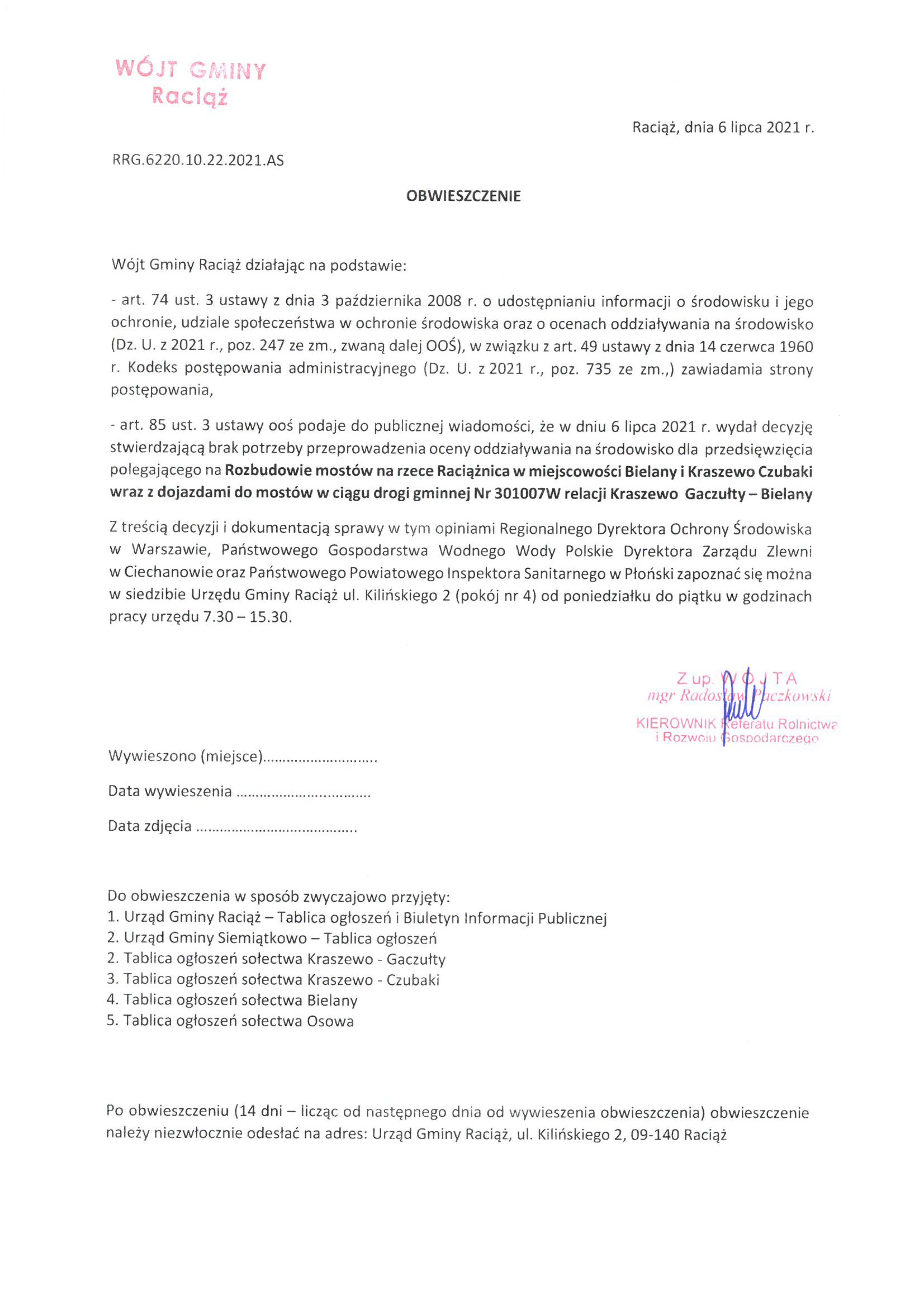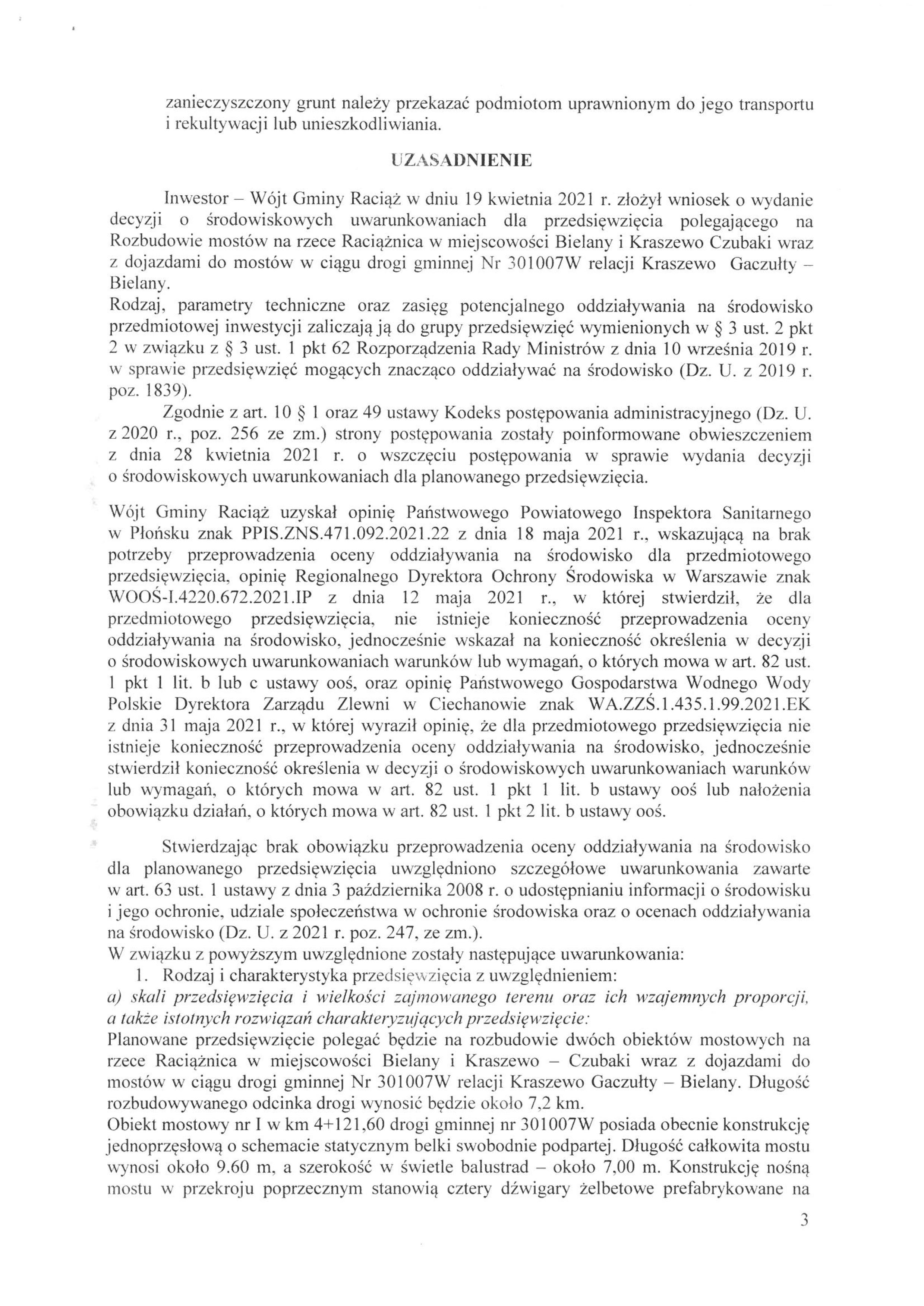 Rozbudowa mostów na rzece Raciążnica w miejscowości Bielany i Kraszewo Czubaki wraz z dojazdami do mostów w ciągu drogi gminnej Nr 301007W relacji Kraszewo Gaczułty – Bielany