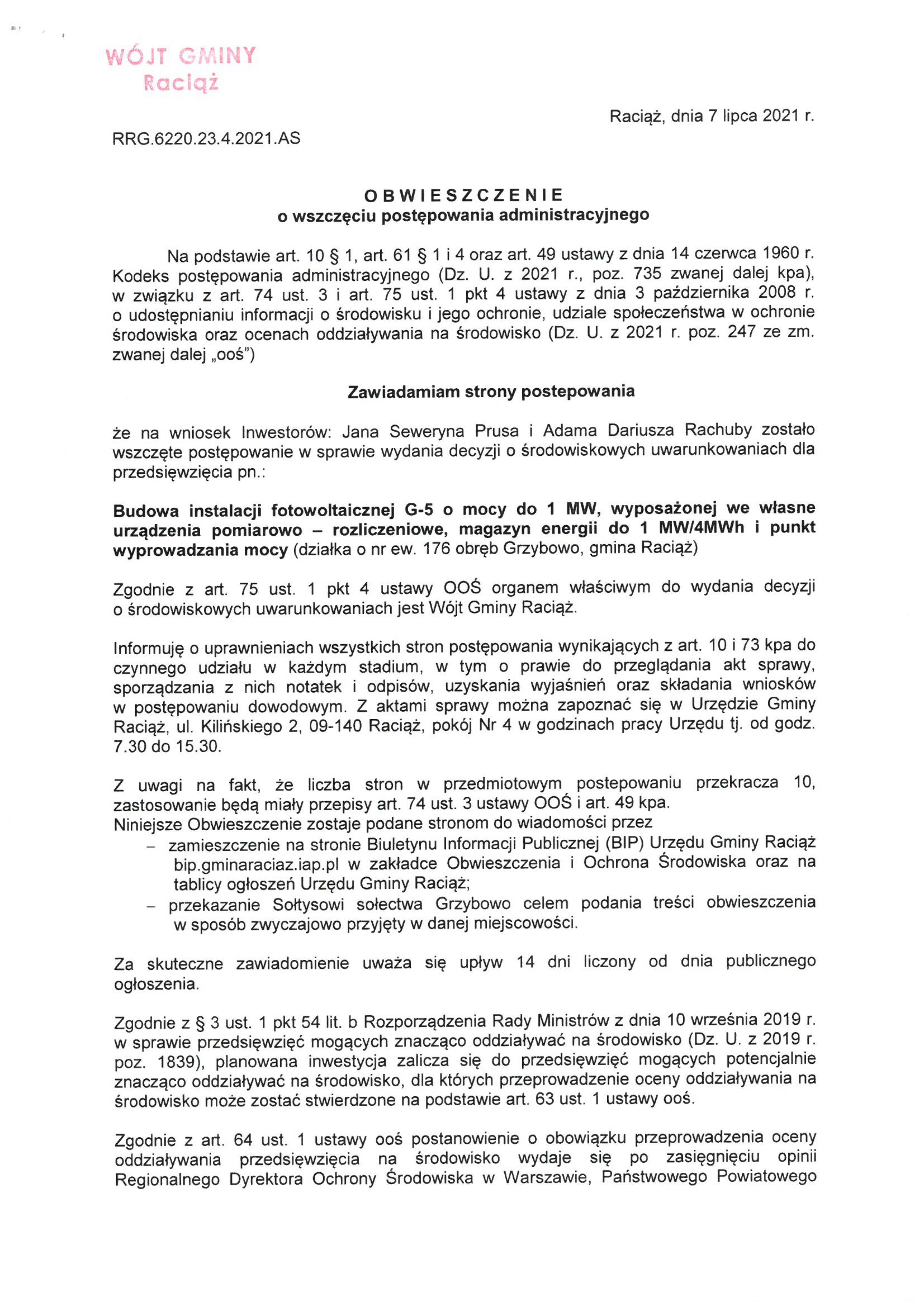 Budowa instalacji fotowoltaicznej G-5 o mocy do 1 MW, wyposażonej we własne urządzenia pomiarowo – rozliczeniowe, magazyn energii do 1 MW/4MWh i punkt wyprowadzania mocy