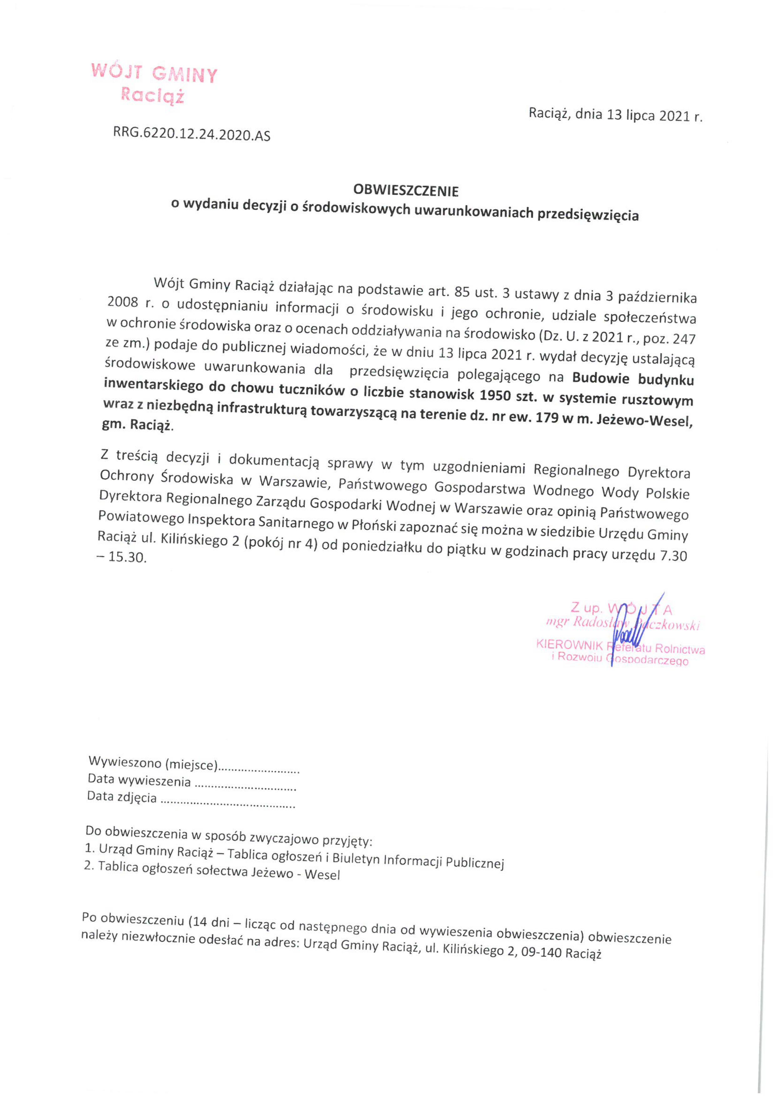 Budowa budynku inwentarskiego do chowu tuczników o liczbie stanowisk 1950 szt. w systemie rusztowym wraz z niezbędną infrastrukturą towarzyszącą na terenie dz. nr ew. 179 w m. Jeżewo-Wesel, gm. Raciąż