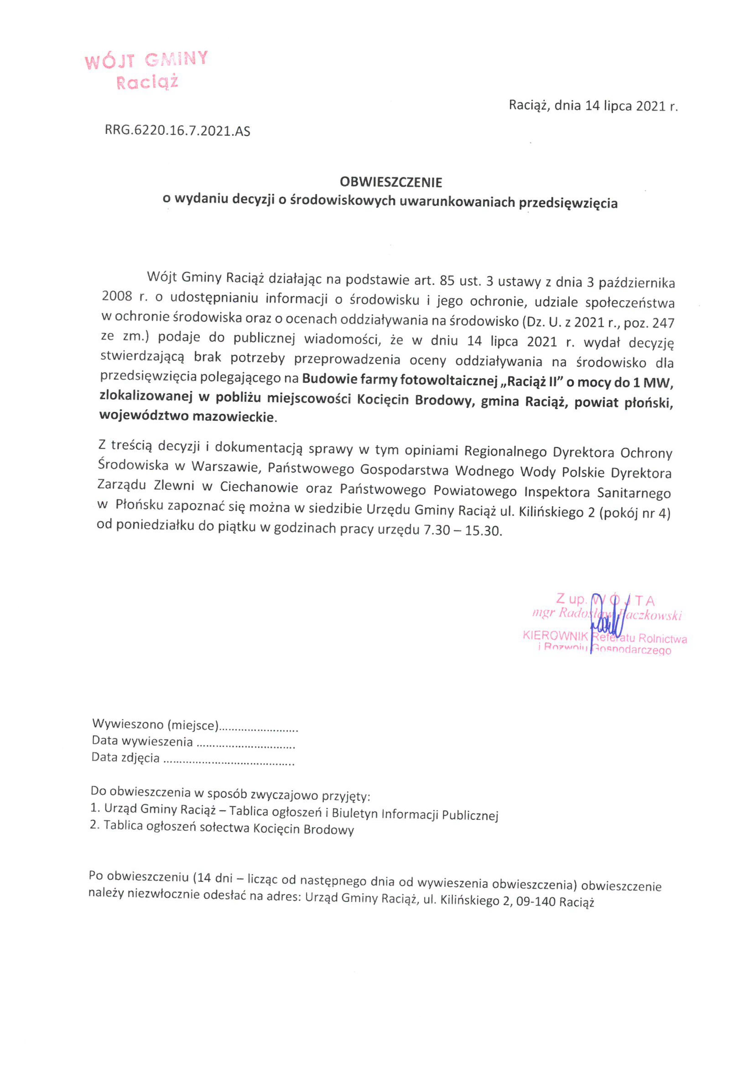 Budowa farmy fotowoltaicznej „Raciąż II” o mocy do 1 MW, zlokalizowanej w pobliżu miejscowości Kocięcin Brodowy, gmina Raciąż, powiat płoński, województwo mazowieckie