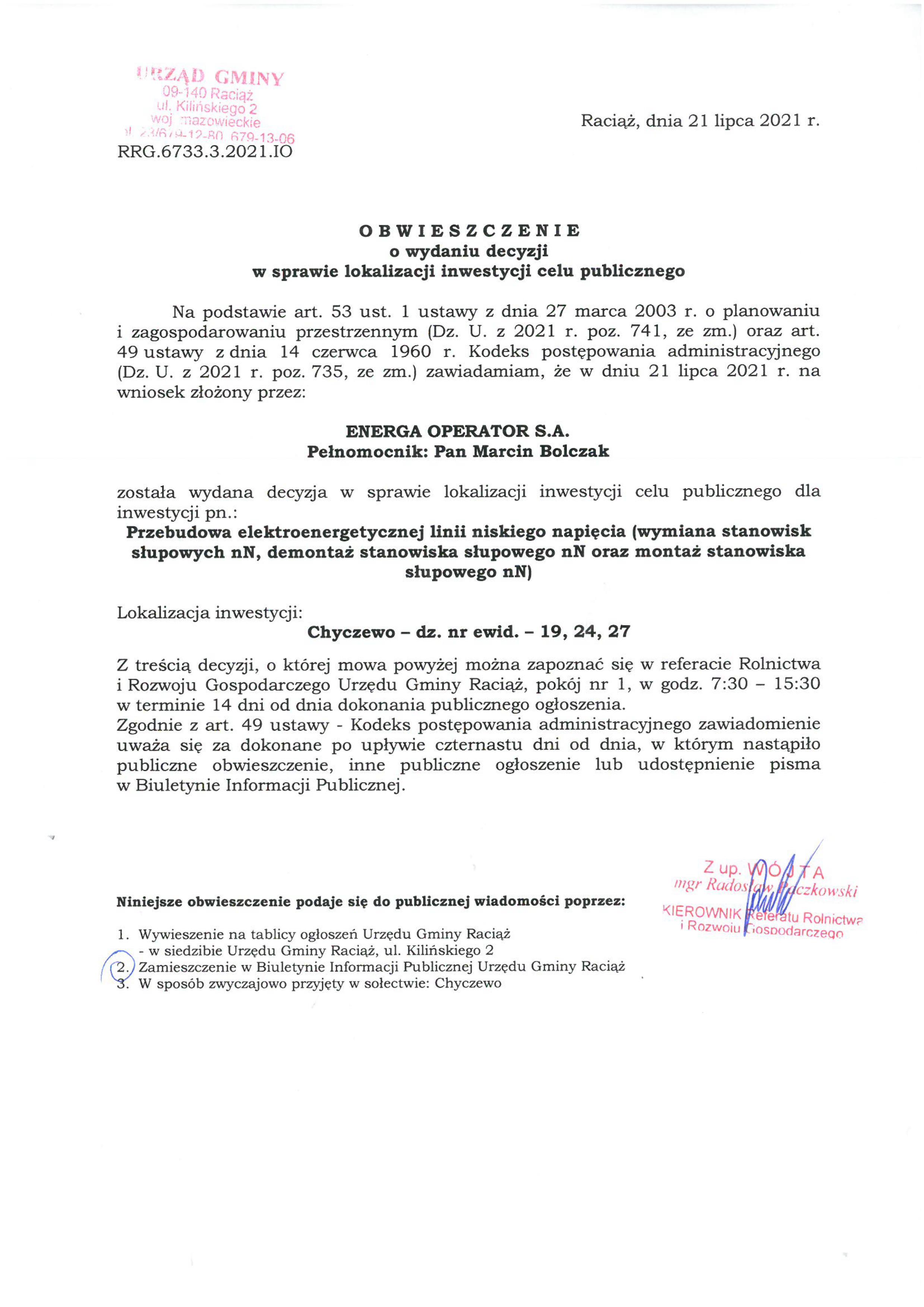 3.2021 Cel Publiczny – Obwieszczenie o wydaniu decyzji pn. „Przebudowa elektroenergetycznej linii niskiego napięcia (wymiana stanowisk słupowych nN, demontaż stanowiska słupowego nN oraz montaż stanowiska słupowego nN)” w miejscowości Chyczewo.