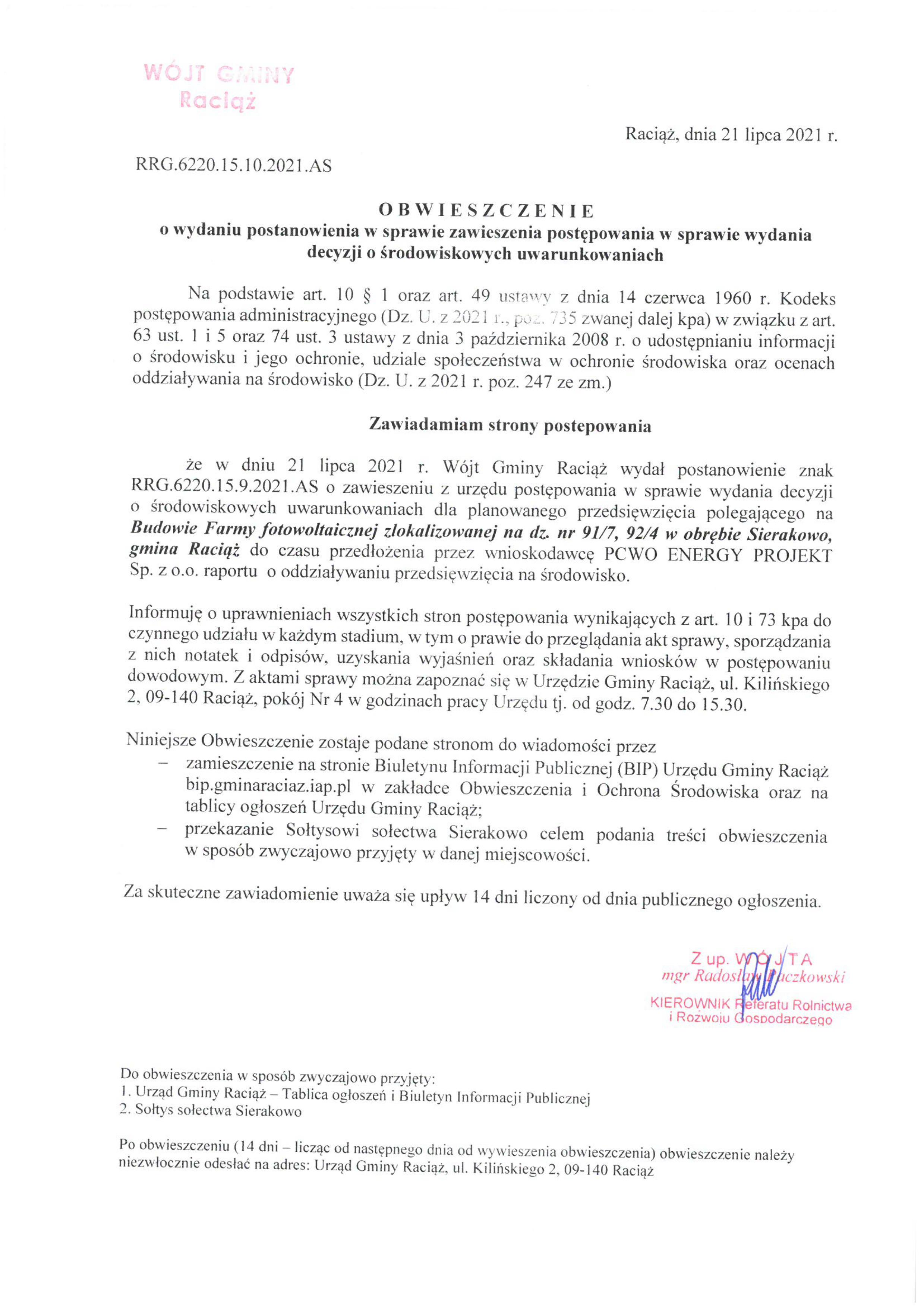 Budowa Farmy fotowoltaicznej zlokalizowanej na dz. nr 91/7, 92/4 w obrębie Sierakowo, gmina Raciąż
