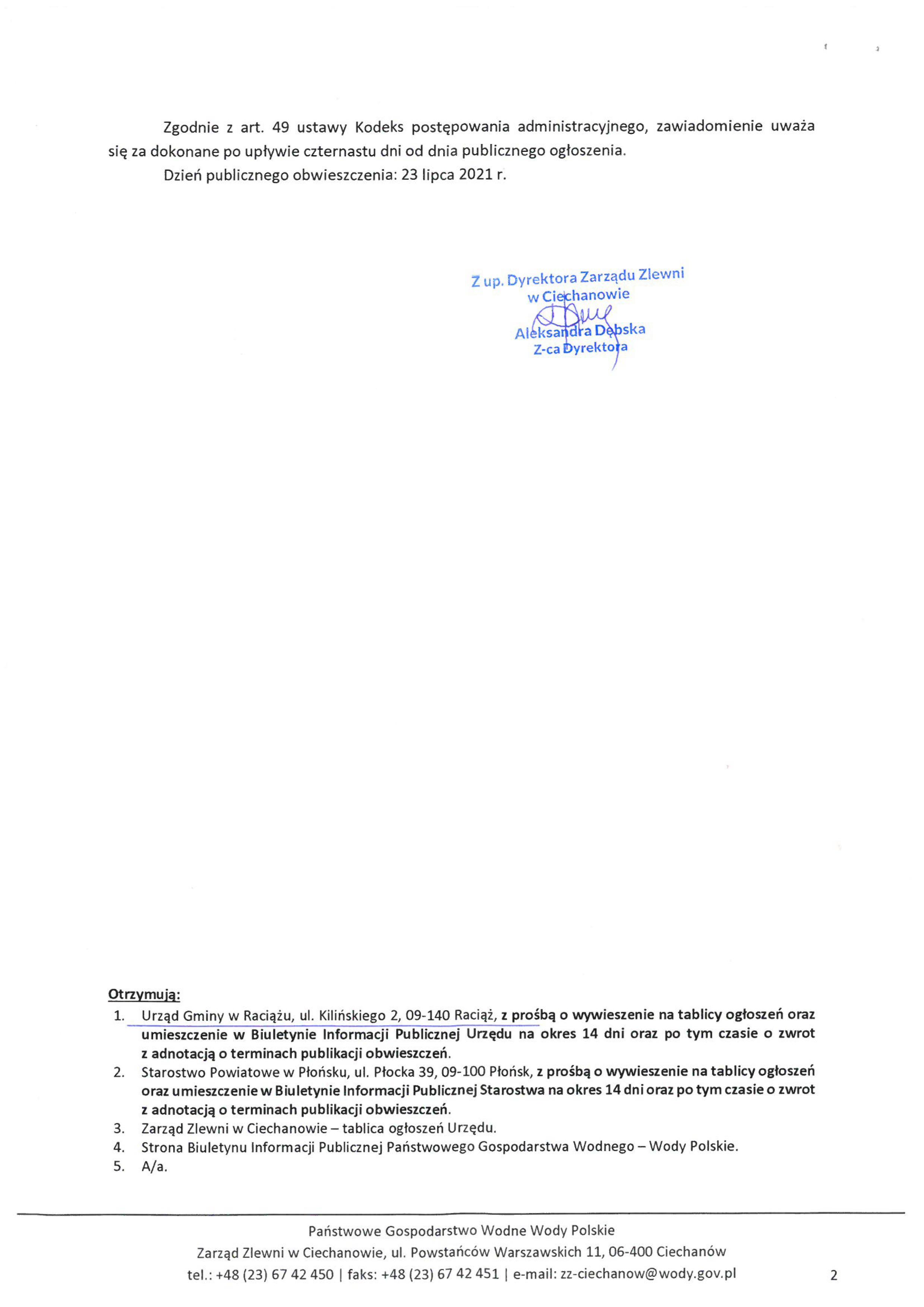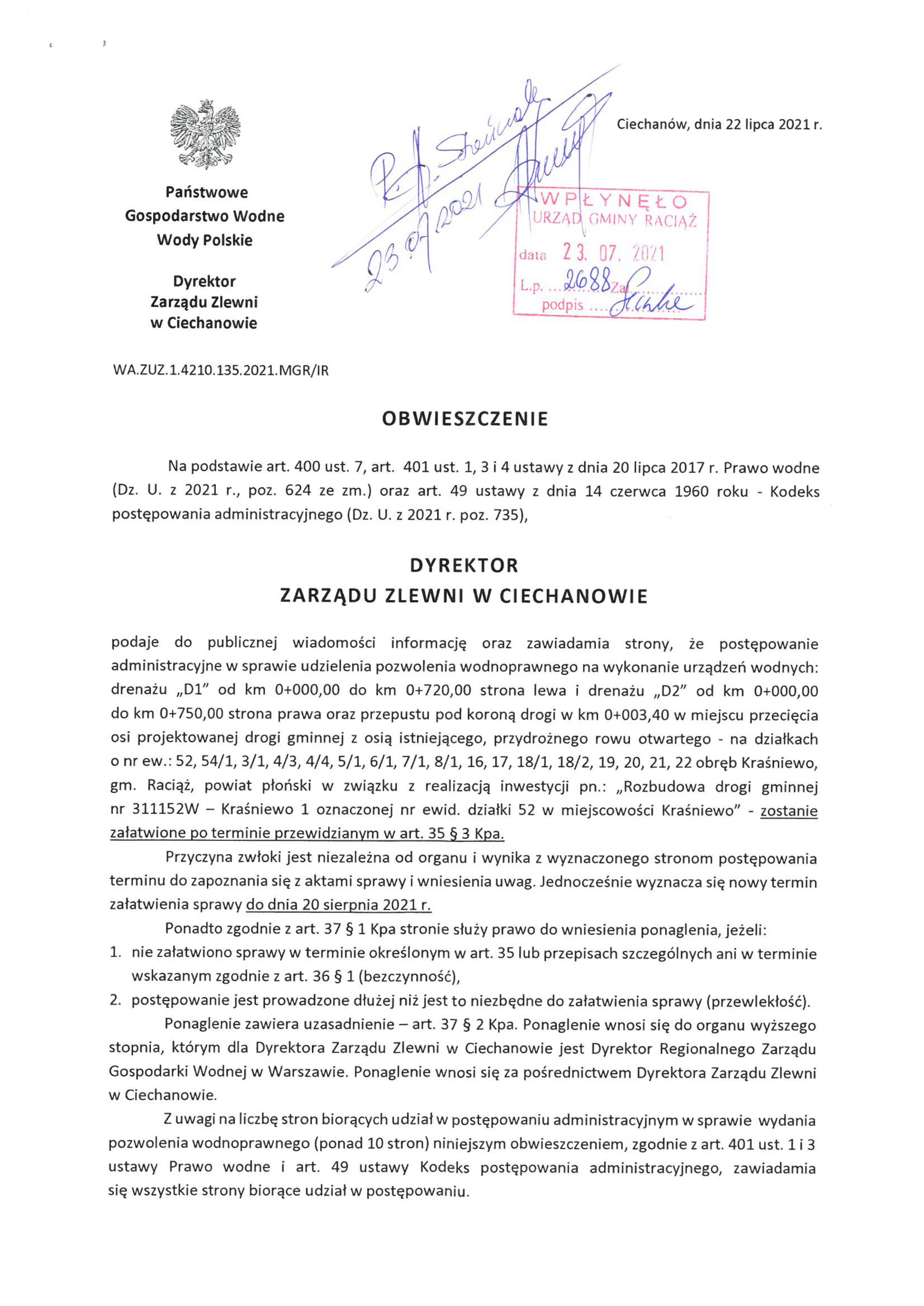 Obwieszczenie – Przedłużenie terminu załatwienia sprawy – udzielenie pozwolenia wodnoprawnego na wykonanie urządzeń wodnych, tj. wykonanie drenażu D1 i D2 podczas realizacji inwestycji gminnej pn.