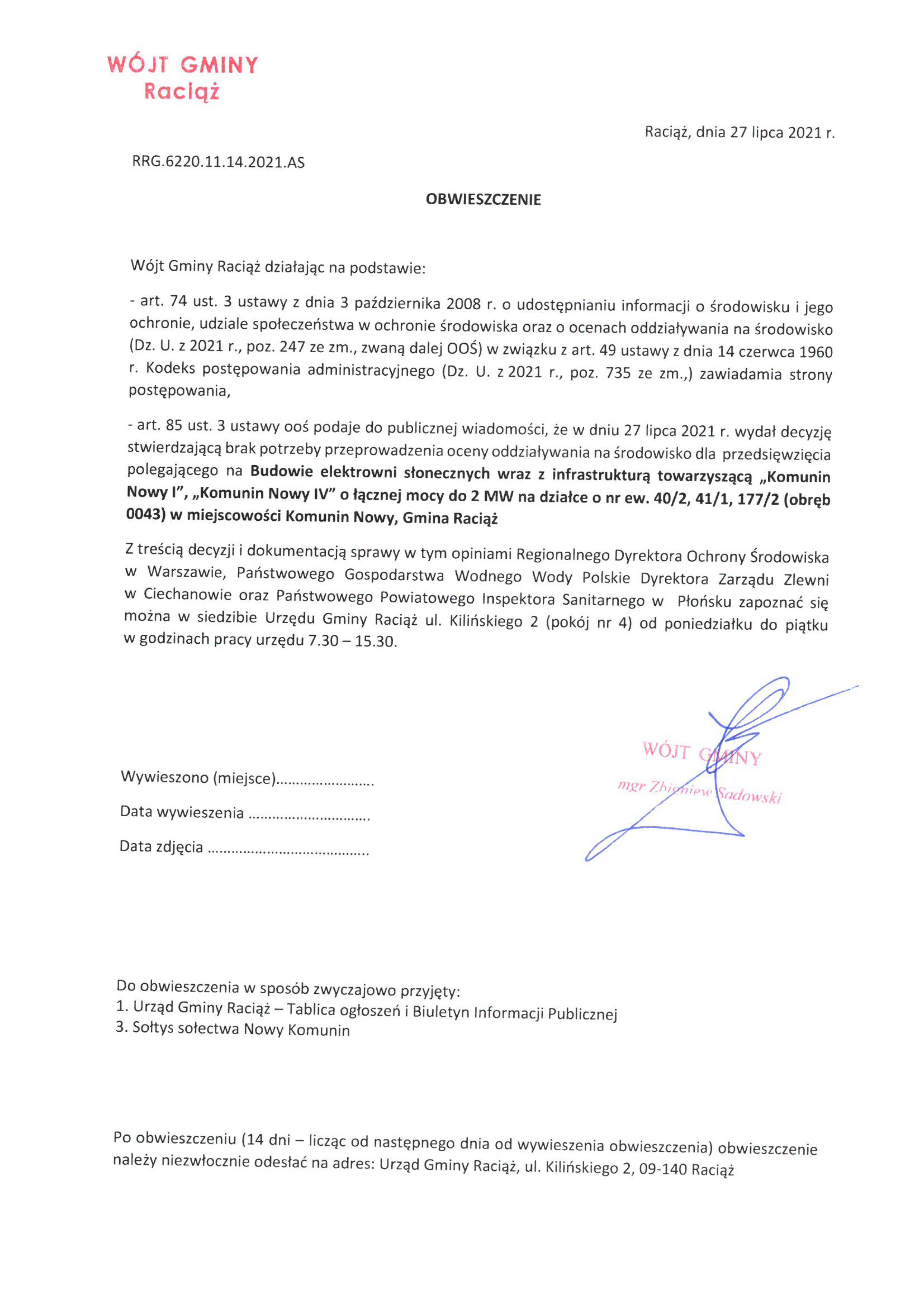 Budowa Elektrowni Słonecznych wraz z infrastrukturą towarzyszącą „KOMUNIN NOWY I”, „KOMUNIN NOWY IV” o łącznej mocy do 2 MW na działce o nr ew. 40/2, 41/1, 177/2 (obręb 0043) w miejscowości Komunin Nowy, Gmina Raciąż