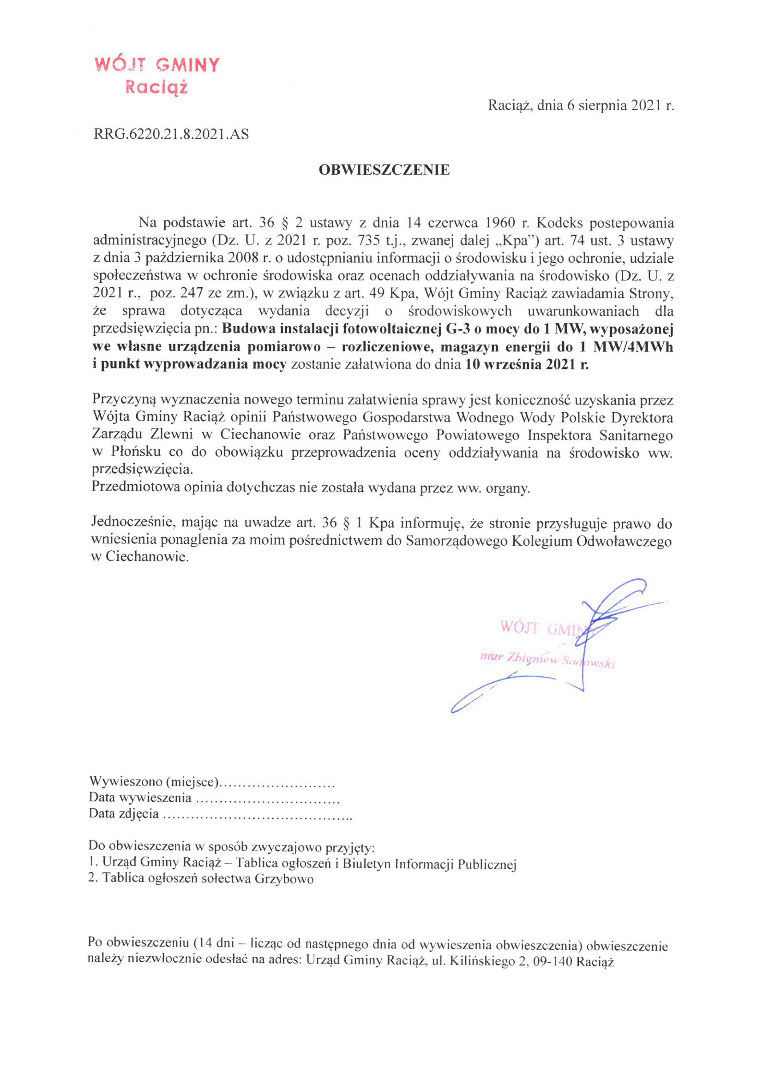 Budowa instalacji fotowoltaicznej G-3 o mocy do 1 MW, wyposażonej we własne urządzenia pomiarowo – rozliczeniowe, magazyn energii do 1 MW/4MWh i punkt wyprowadzania mocy
