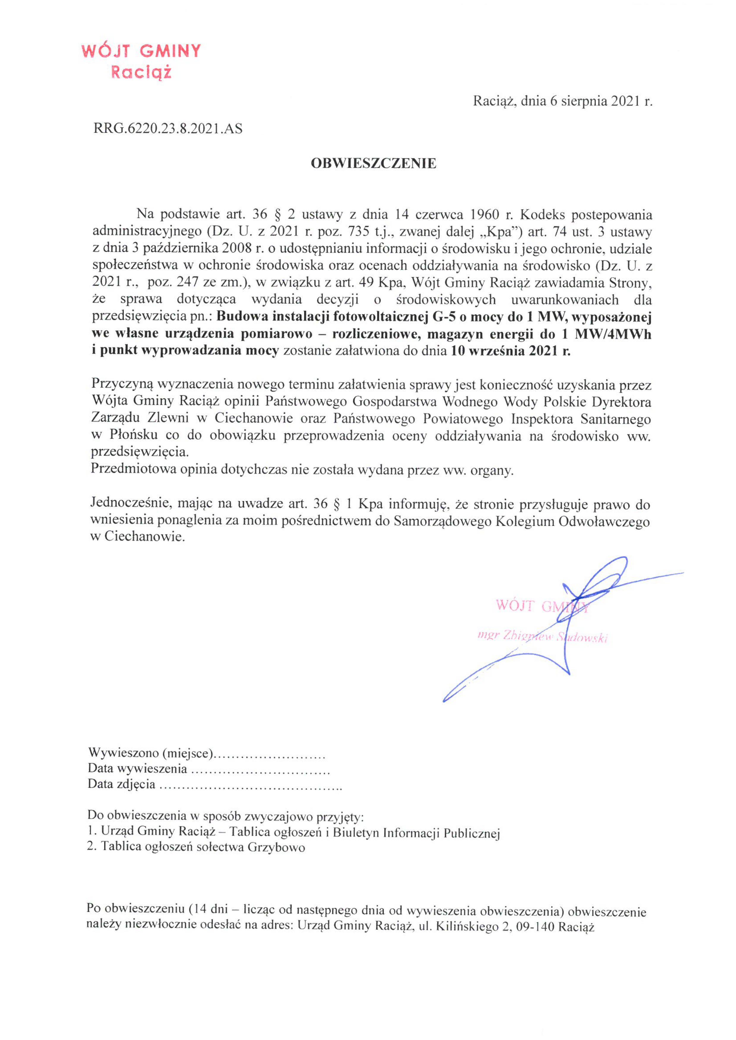 Budowa instalacji fotowoltaicznej G-5 o mocy do 1 MW, wyposażonej we własne urządzenia pomiarowo – rozliczeniowe, magazyn energii do 1 MW/4MWh i punkt wyprowadzania mocy
